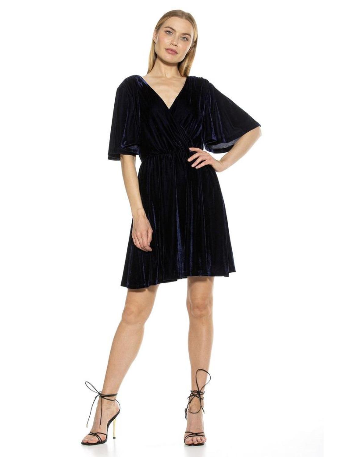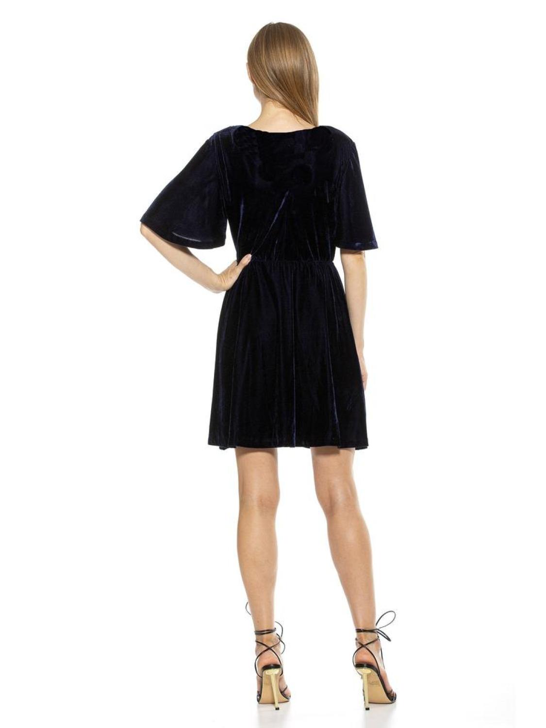 PRODUCT FEATURES 36 7/8" length Surplice neck Flutter sleeves Back keyhole with button-loop closure Elasticized waist Velvet construction Flared silhouette 96% Polyester, 4% Spandex Lined - 100% Polyester Hand wash cold, line dry Imported Style D3795A