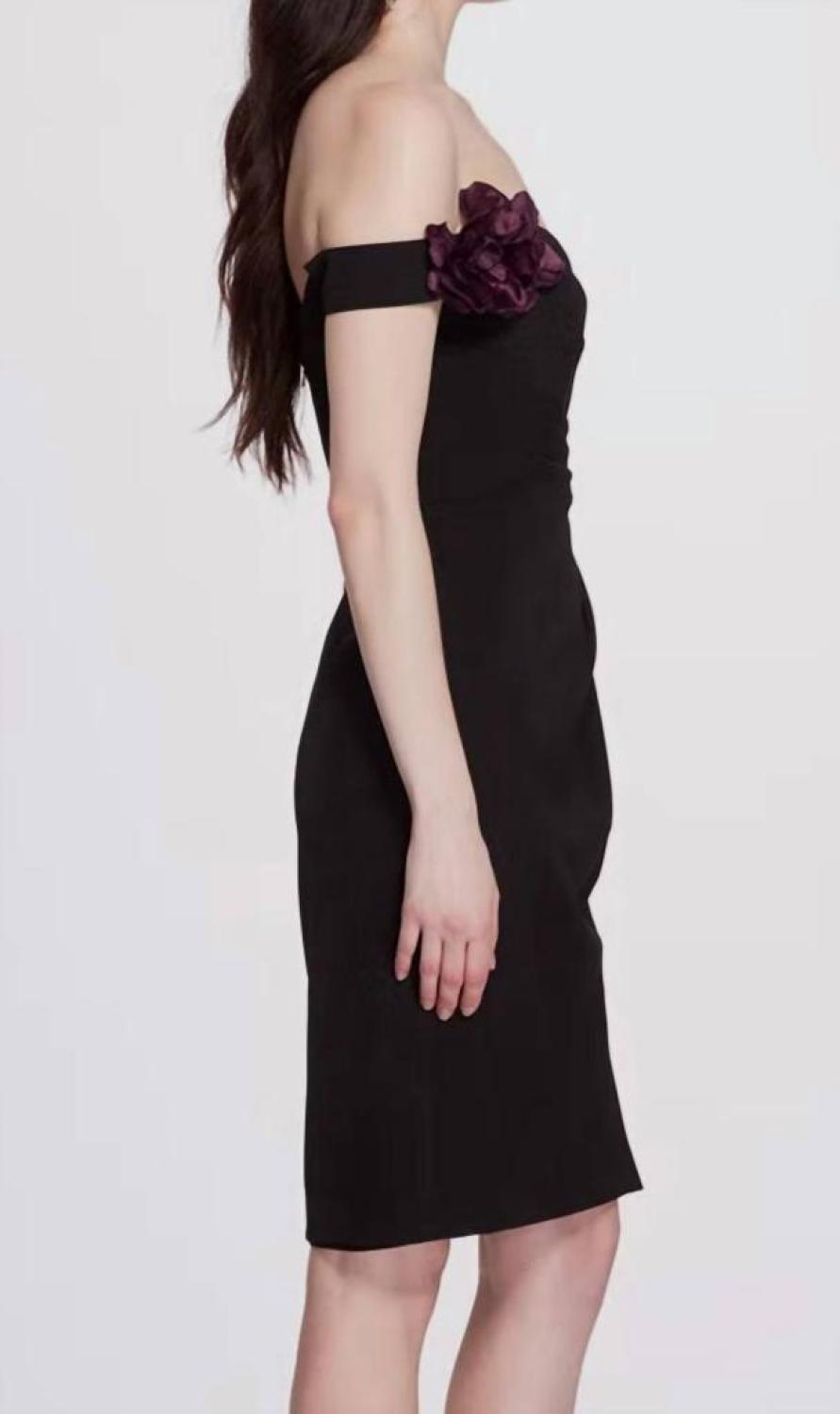 The kind of easy and flattering dress you'll be reaching for all season long.Sheath silhouette. Pleated off-the-shoulder neckline. 3D floral details on the sleeves. Dry clean only.