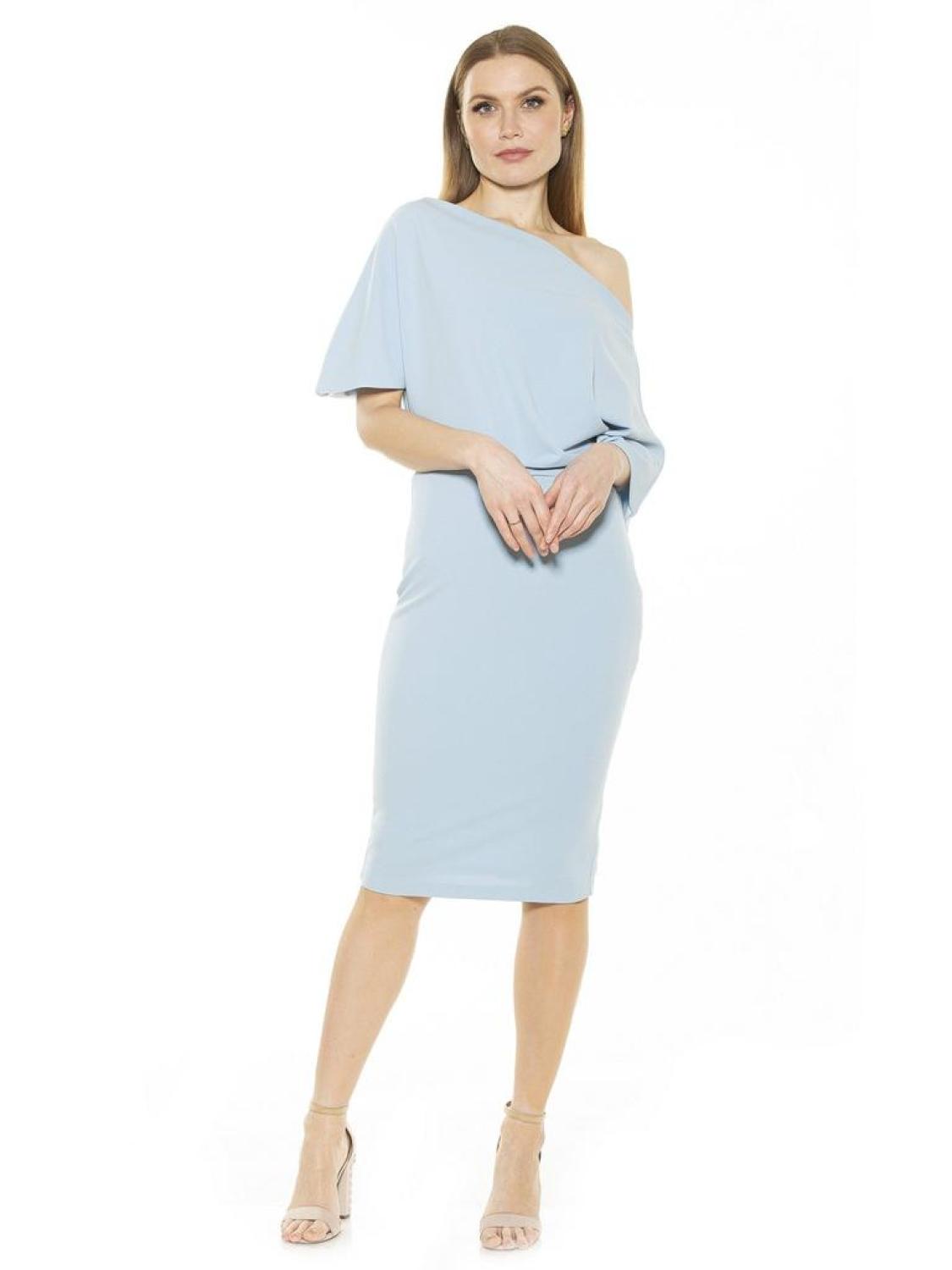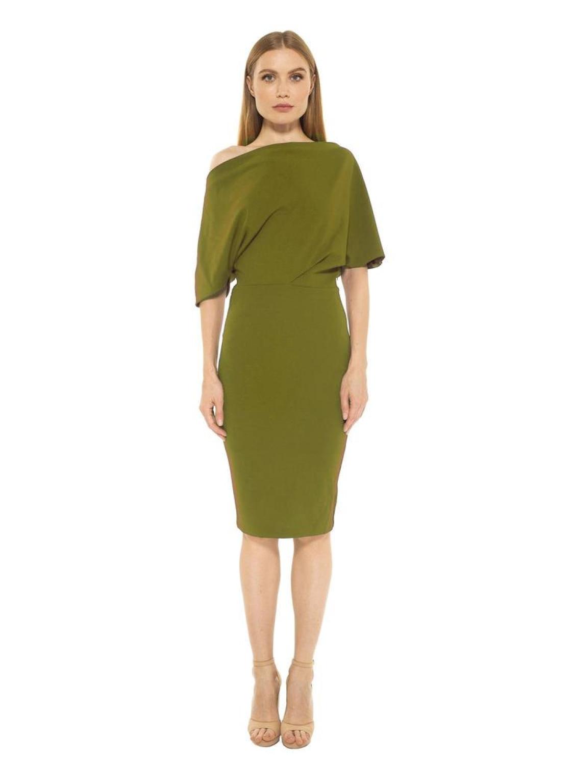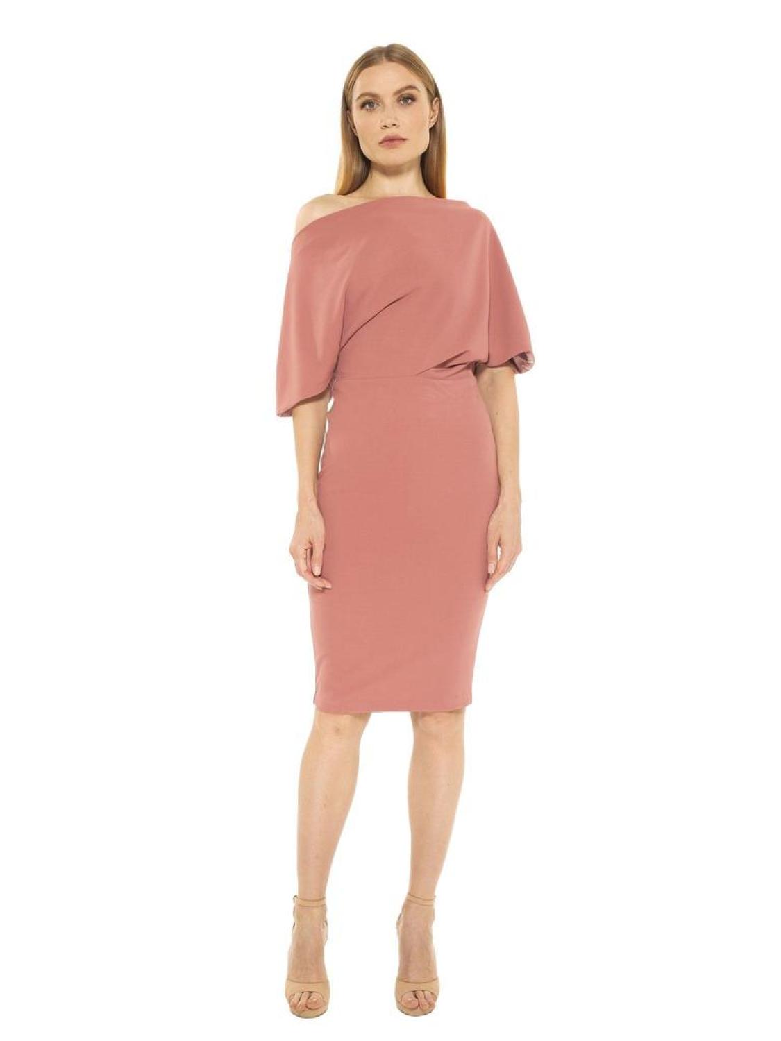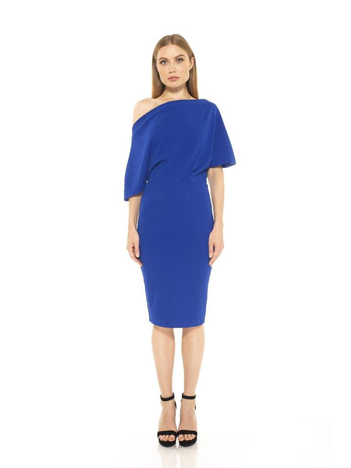 PRODUCT FEATURES Approx. 42-" length Sheath dress features an off-the-shoulder silhouette 3/4 length sleeves Concealed side zip closure SCUBA CREPE 95% Polyester, 5% Spandex Lined - 100% Polyester Machine wash cold Imported Style D3342