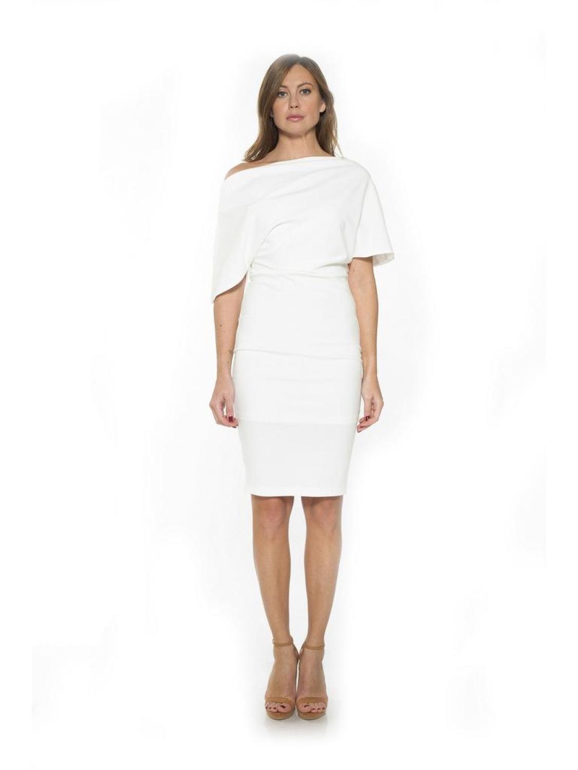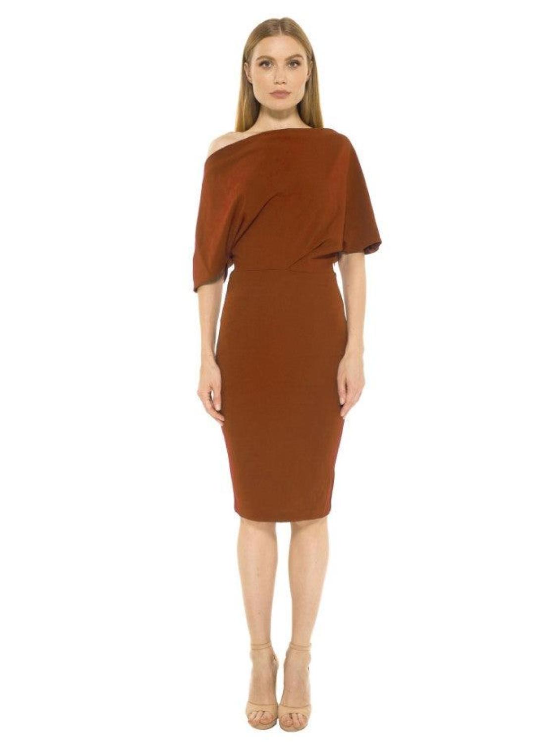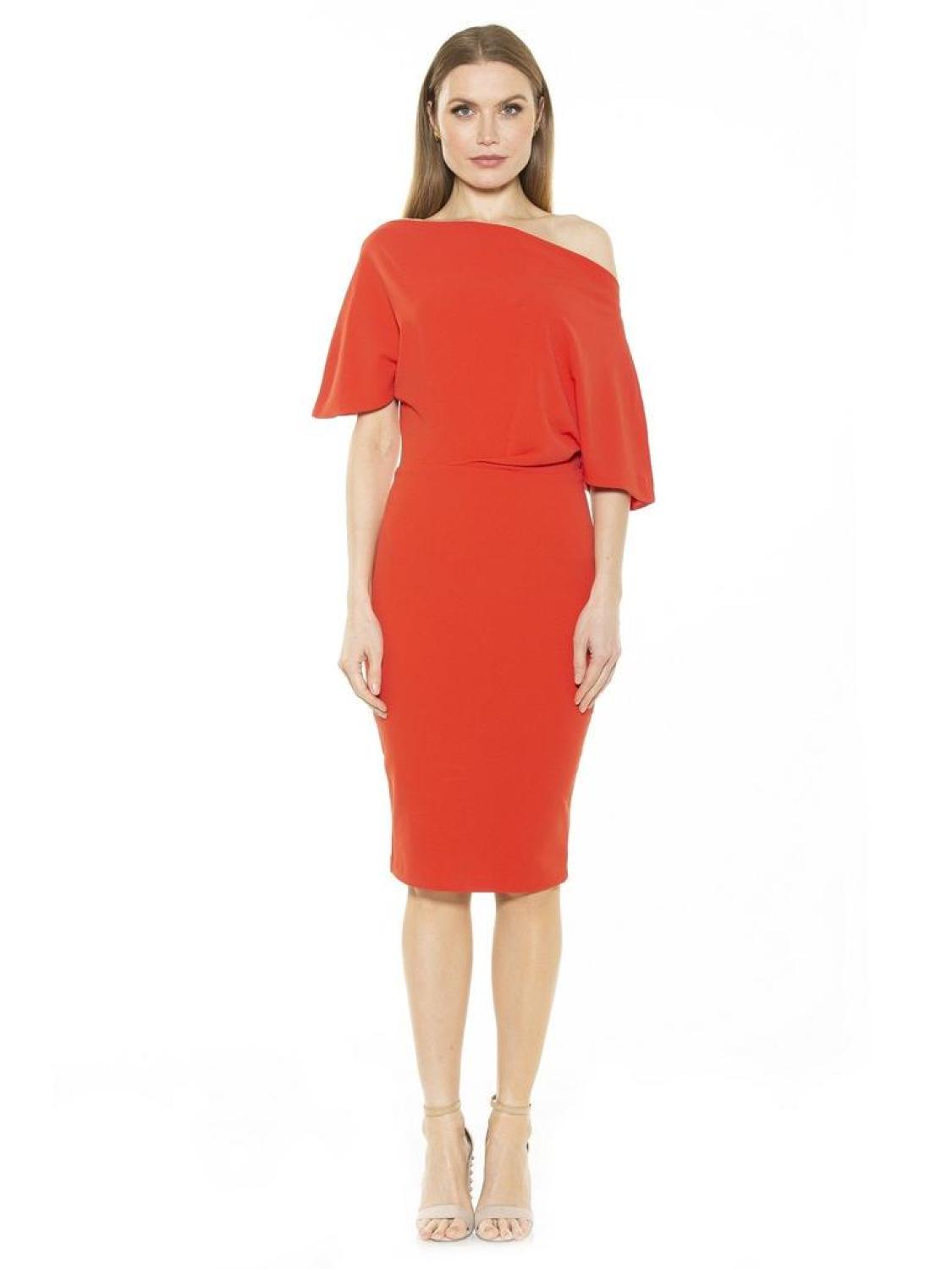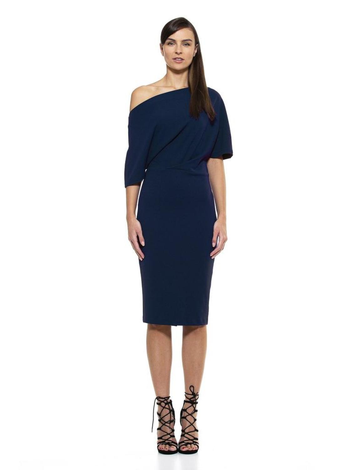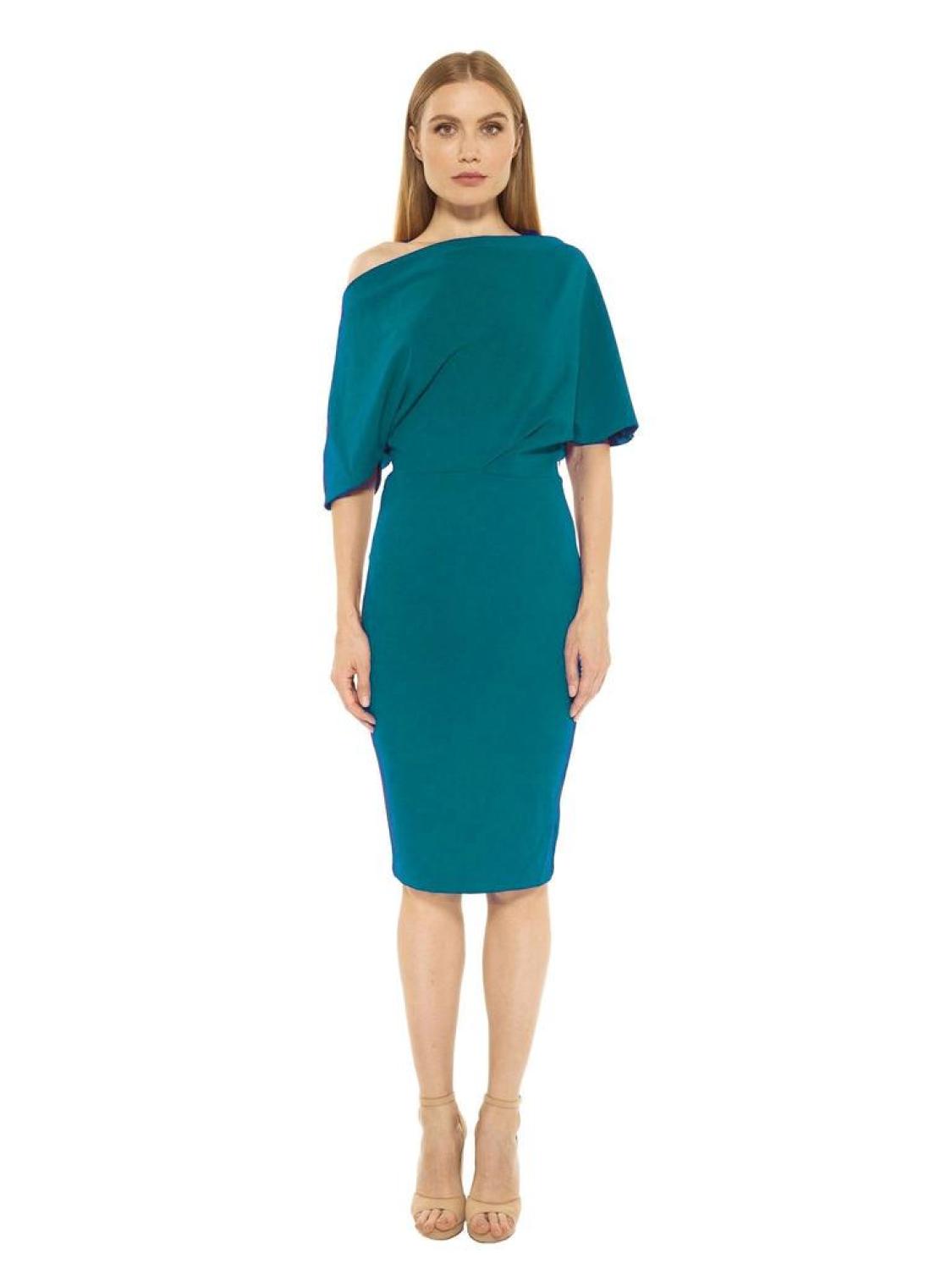 PRODUCT FEATURES Approx. 42-" length Sheath dress features an off-the-shoulder silhouette 3/4 length sleeves Concealed side zip closure SCUBA CREPE 95% Polyester, 5% Spandex Lined - 100% Polyester Machine wash cold Imported Style D3342