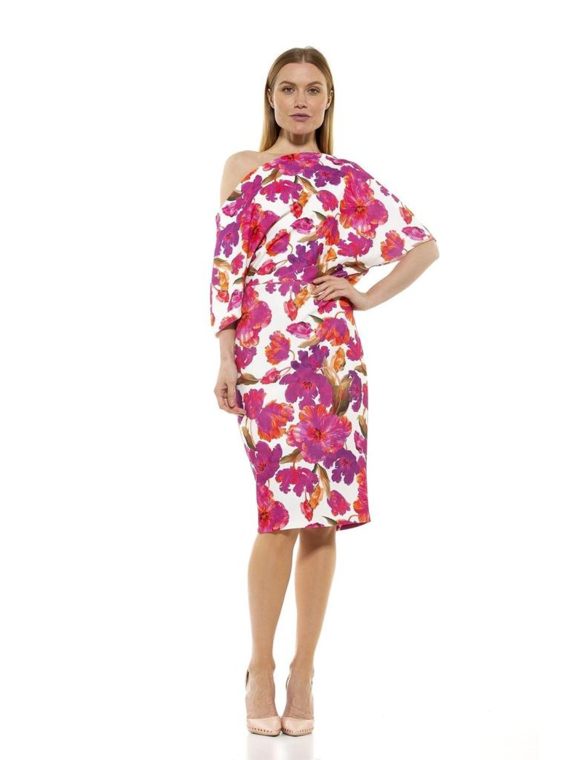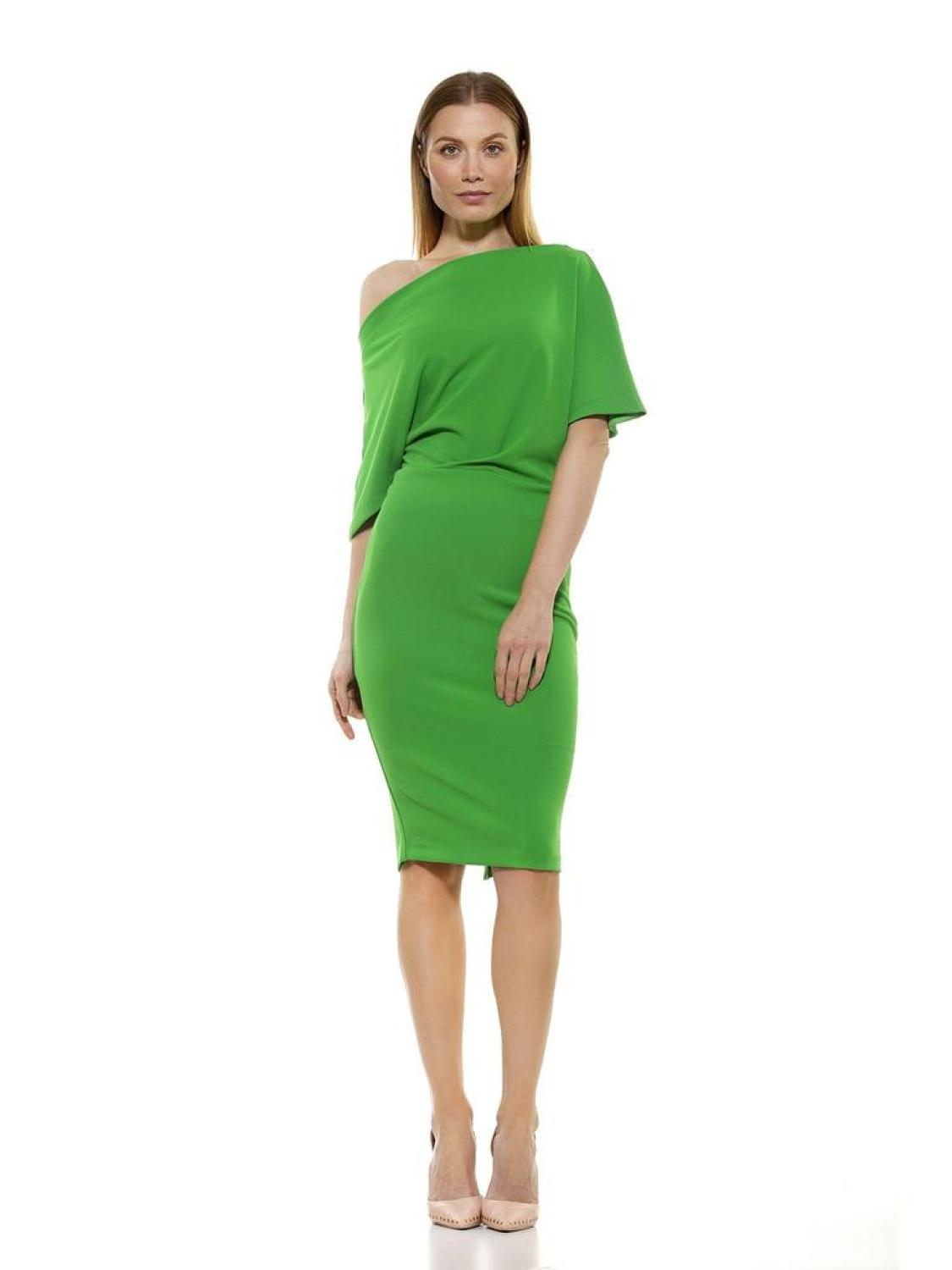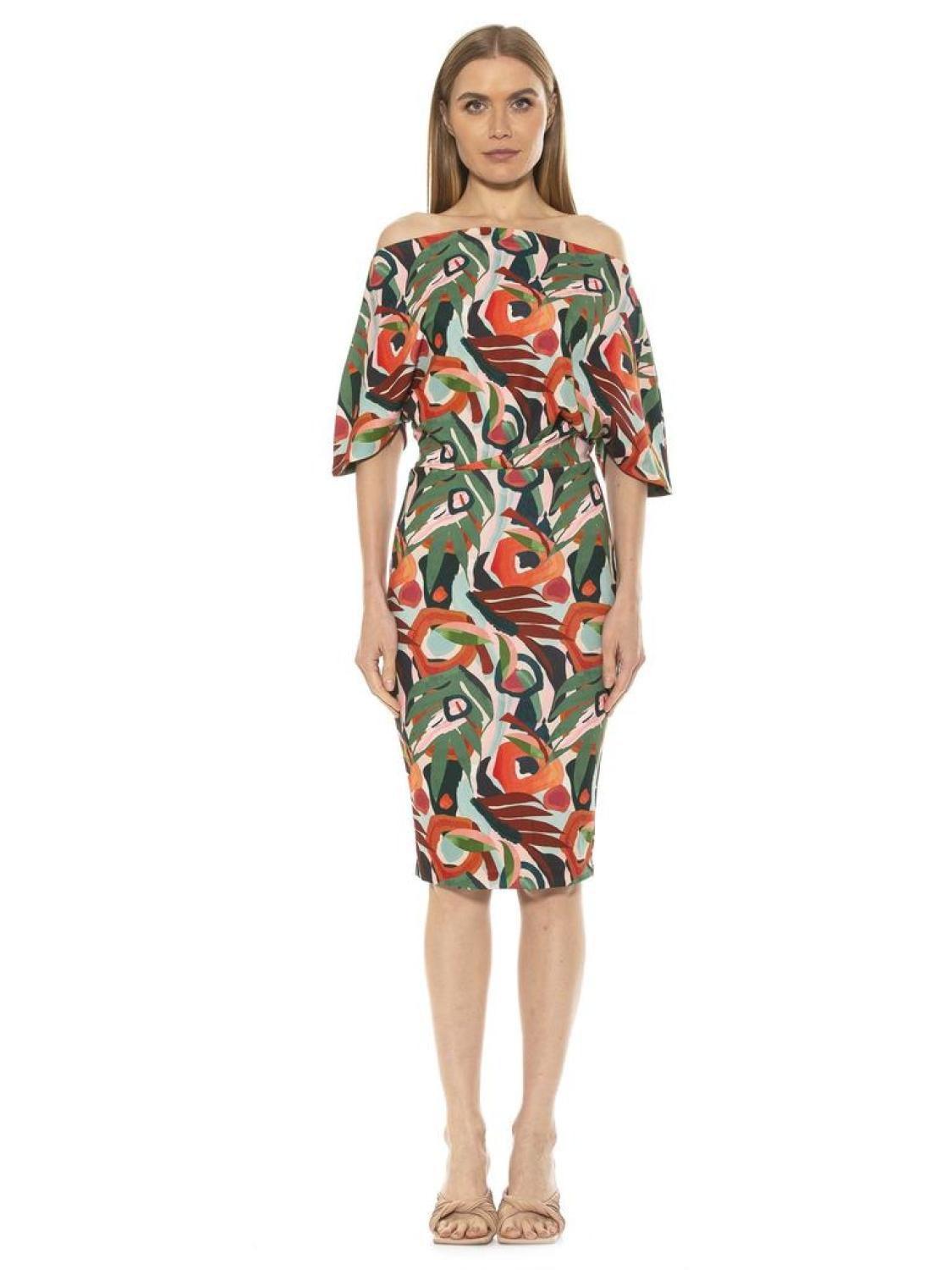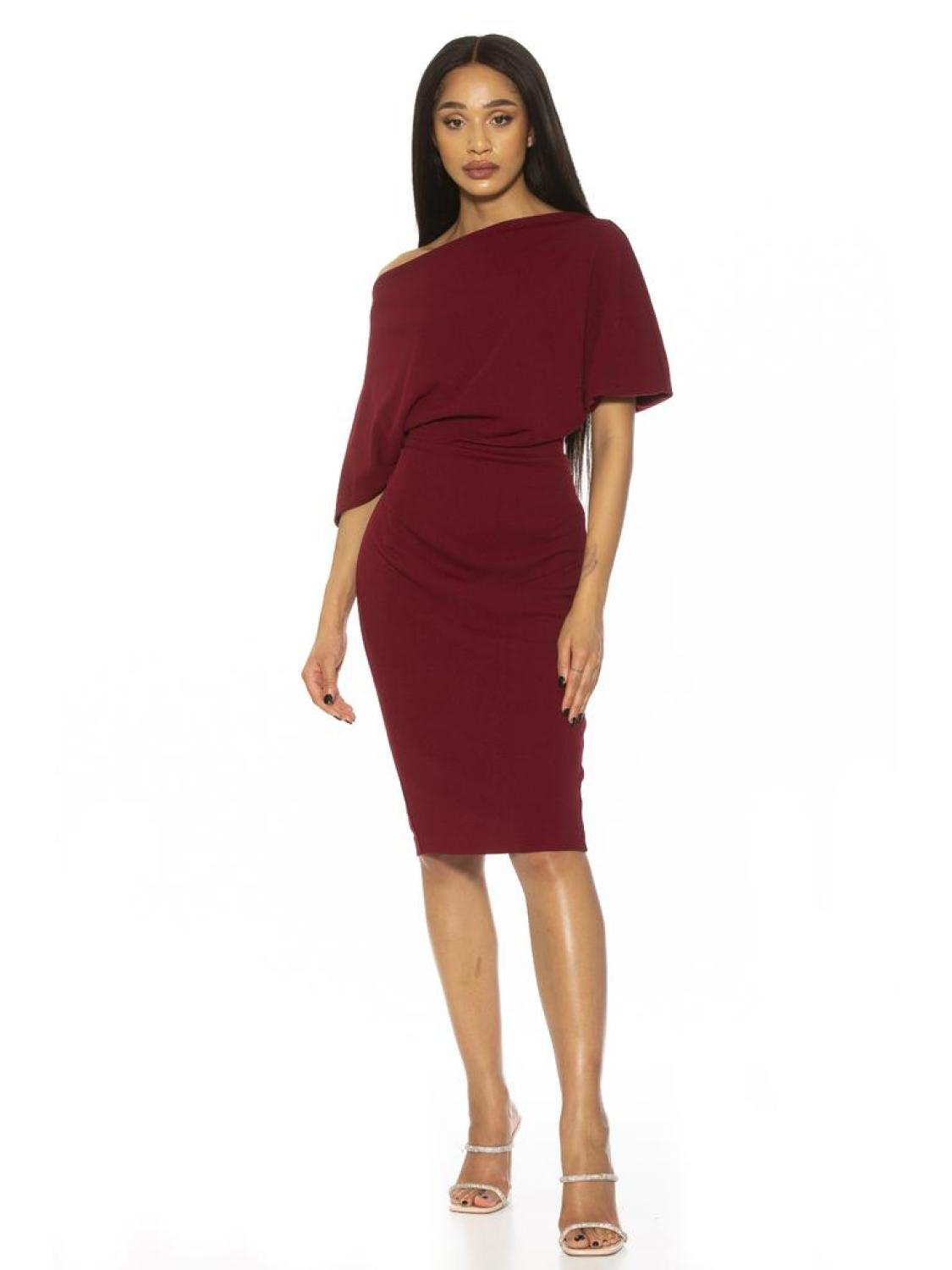 PRODUCT FEATURES Approx. 42-" length Sheath dress features an off-the-shoulder silhouette 3/4 length sleeves Concealed side zip closure SCUBA CREPE 95% Polyester, 5% Spandex Lined - 100% Polyester Machine wash cold Imported Style D3342