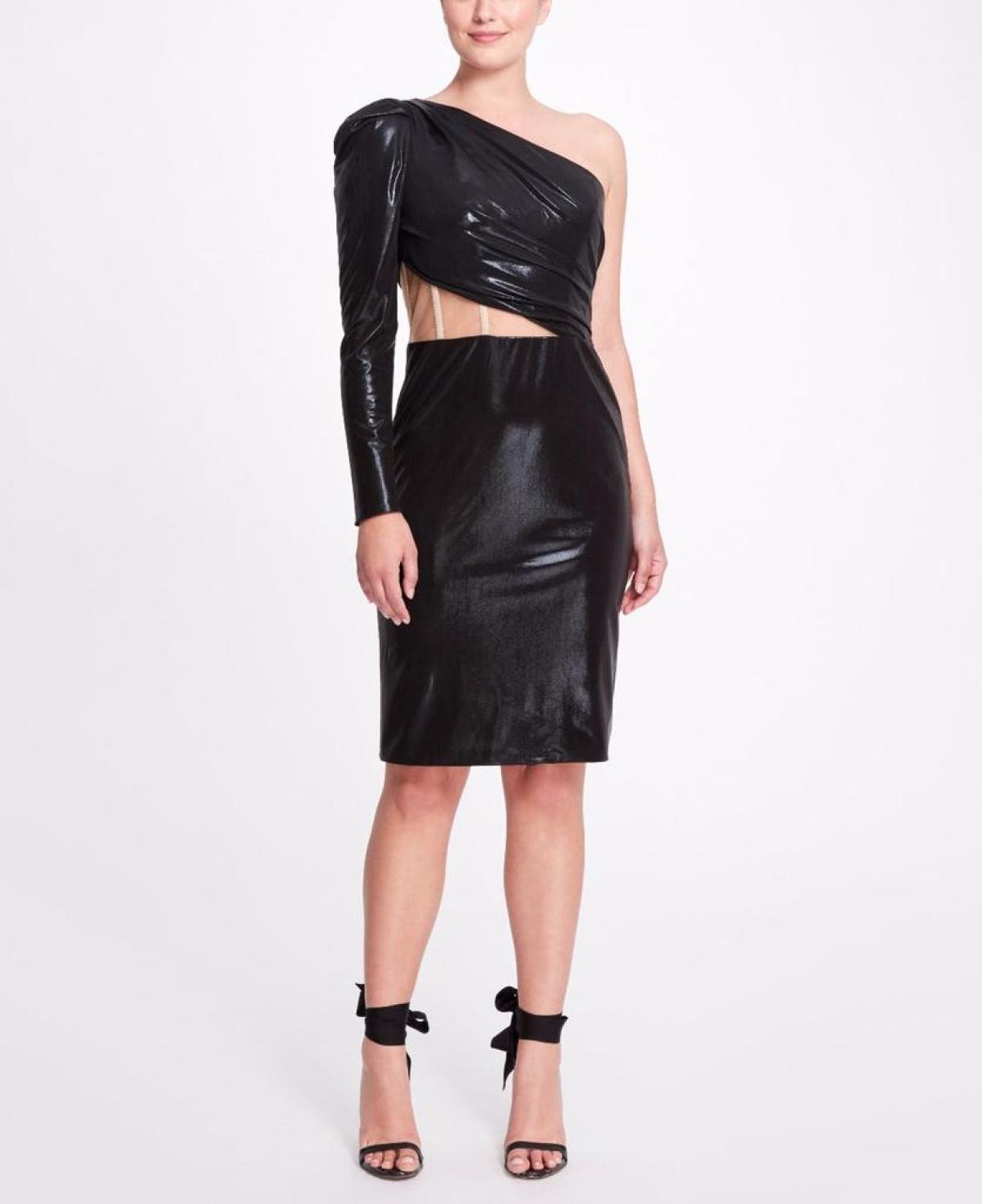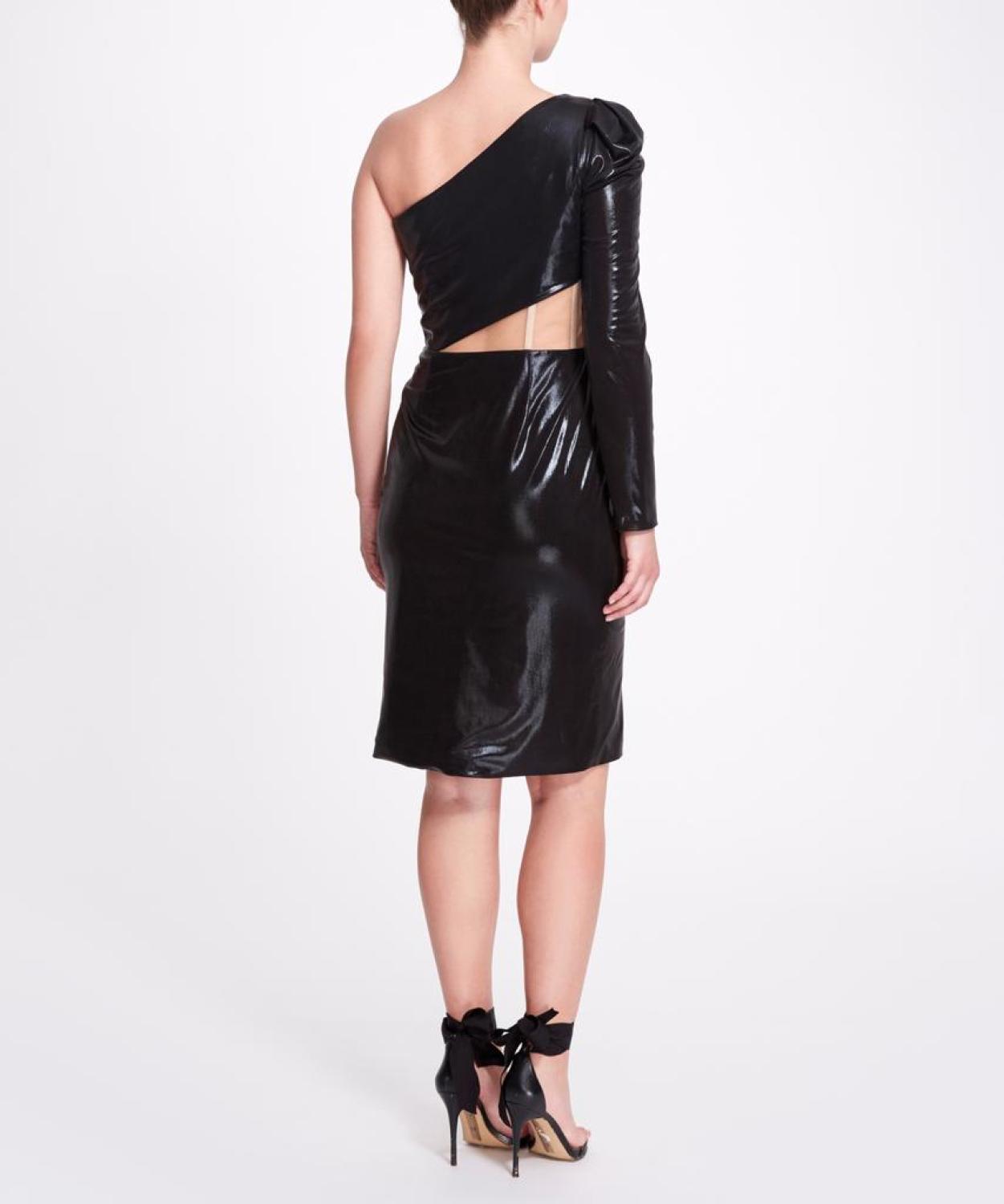 • One shoulder lame cocktail dress with exposed corset, draped bodice, asymmetrical neckline and long sleeve.Model is wearing size US 4.