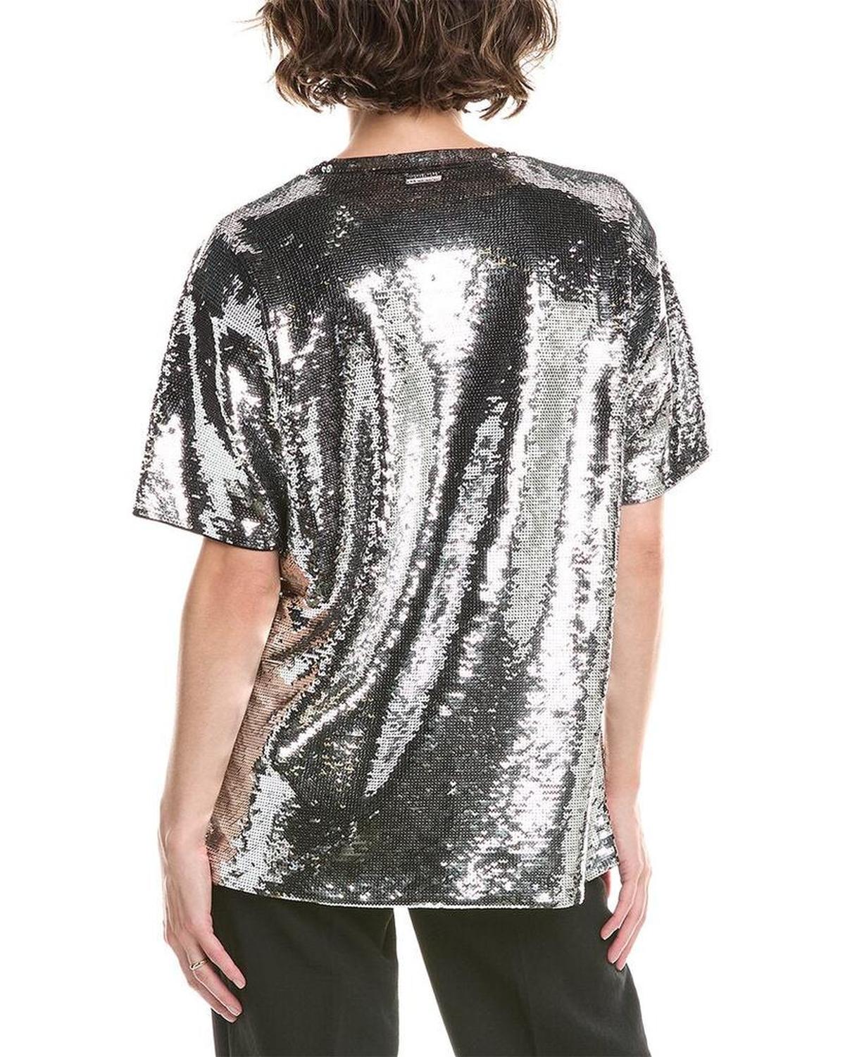 Elevate your wardrobe with the MICHAEL Michael Kors Oversized Tunic Shirt. This stunning tunic features sequin embellishments and a crew neck for a touch of glamour. The silver color adds a chic and sophisticated touch to any outfit. Made from 100% recycled polyester, this tunic is not only stylish but also environmentally friendly. Whether you dress it up or down, this versatile piece is sure to become a staple in your closet. Hand wash recommended. Imported. Model is 5'10 and is wearing a size small. Measurements may vary slightly by size.