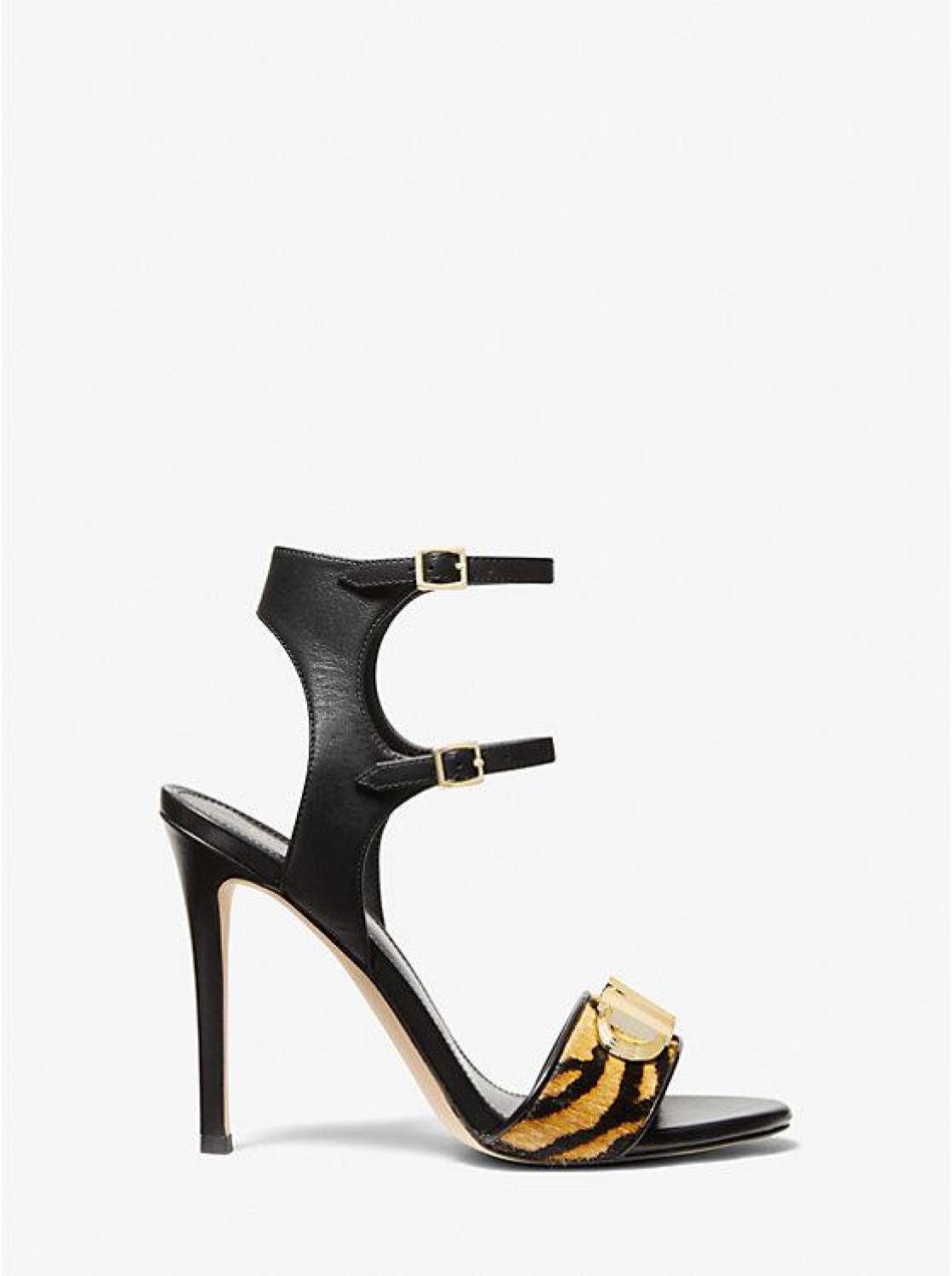 • Our multi-strap Parker sandals are not for the timid. Made with leather and tiger-print calf hair, their sleek, elegant silhouette boasts a 4” inch heel and bold Empire hardware. Wear them with shorter hemlines and cropped pants—they’re too glamorous to hide.