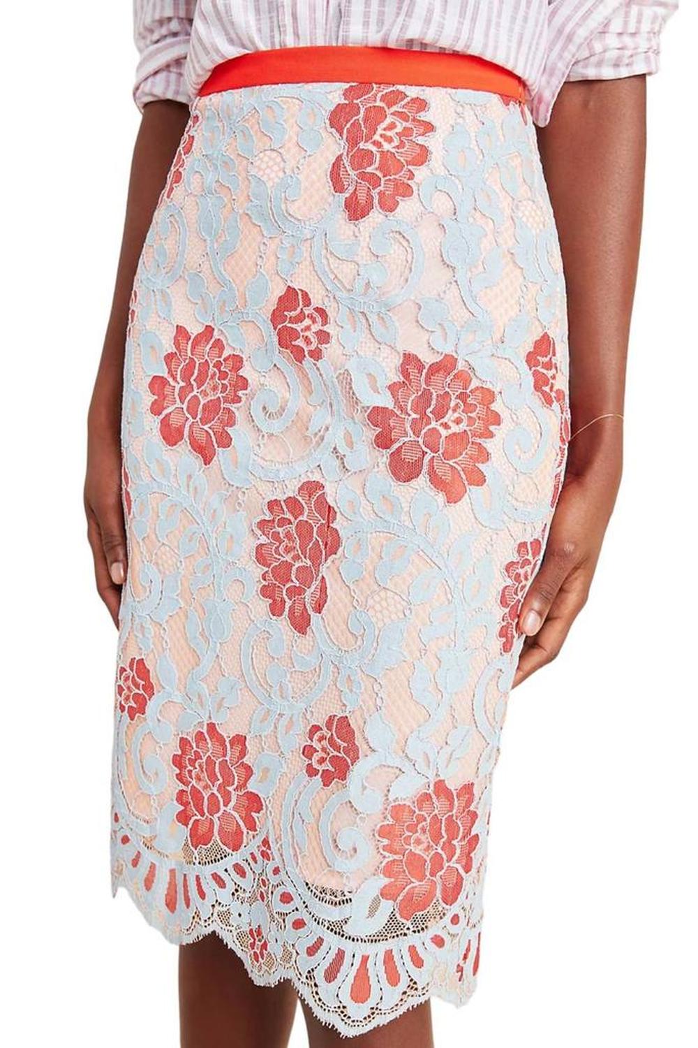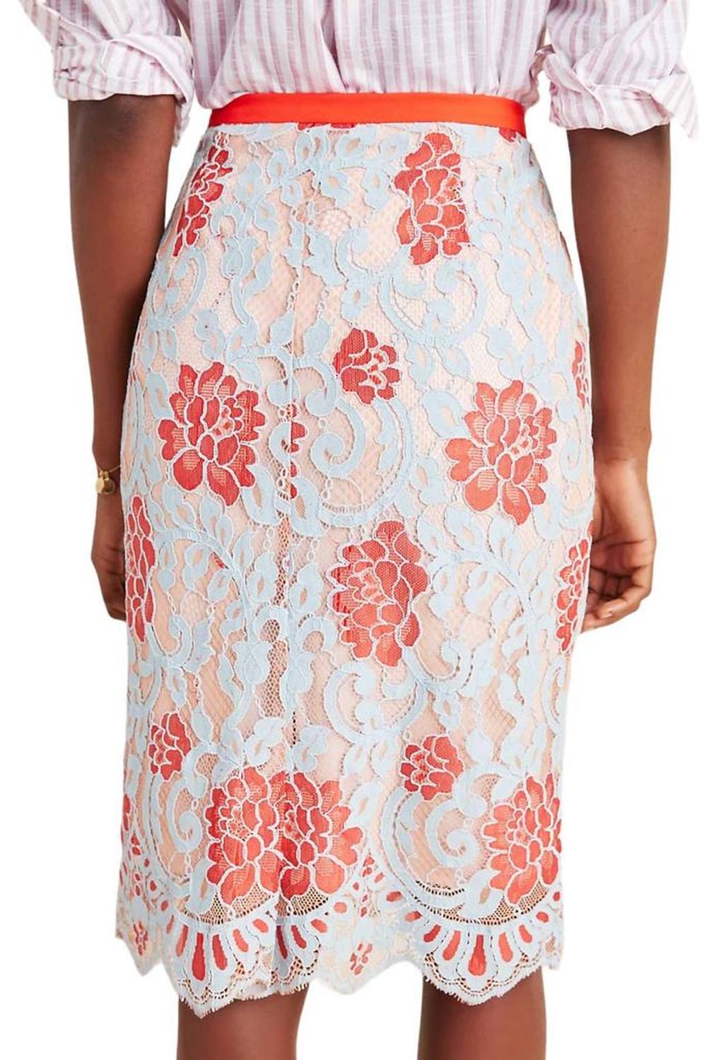 Show off just the right amount of skin in this beautifuly designed midi length skirt.Shades of persimmon and Robin's egg blue combine in our Pale Blue and Red Lace Skirt. The pencil-style floral lace skirt has a kick pleat in back, a side zipper, an orange knit waistband and is fully lined in pink knit. 100% Polyester. Lining - 100% Polyester. Hand wash only. Made in USA.