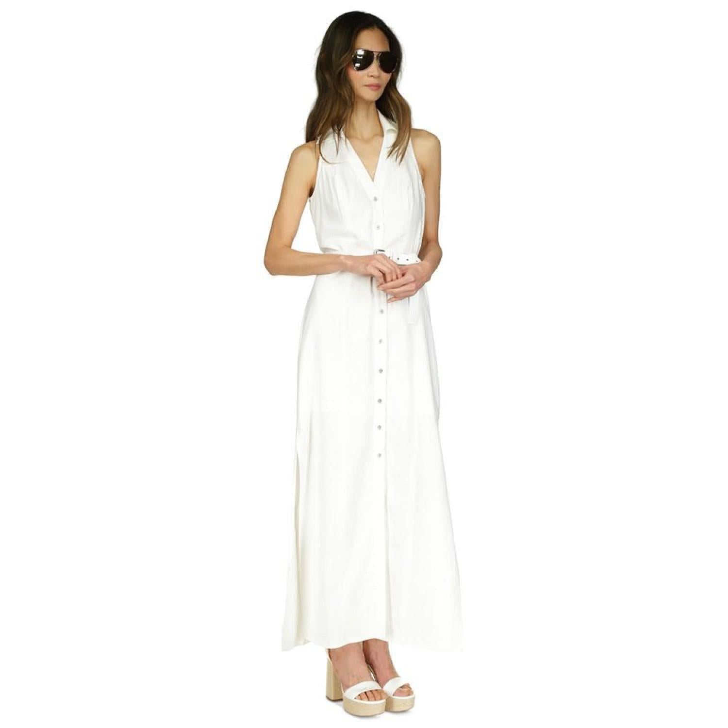 You can bring long lines to your look even on warm days with this petite sleeveless shirtdress by MICHAEL Michael Kors. Approx. 56-1/2" long from center back neck to hem Ankle-length or longer casual dress Designed to fit and flatter 5'4" and under frame Point collar; V-neck; Maxi silhouette Button closures at front Sleeveless Belted detail at waist; slits at side hem Lined Linen, viscose; lining: 100% cotton Dry clean Imported
