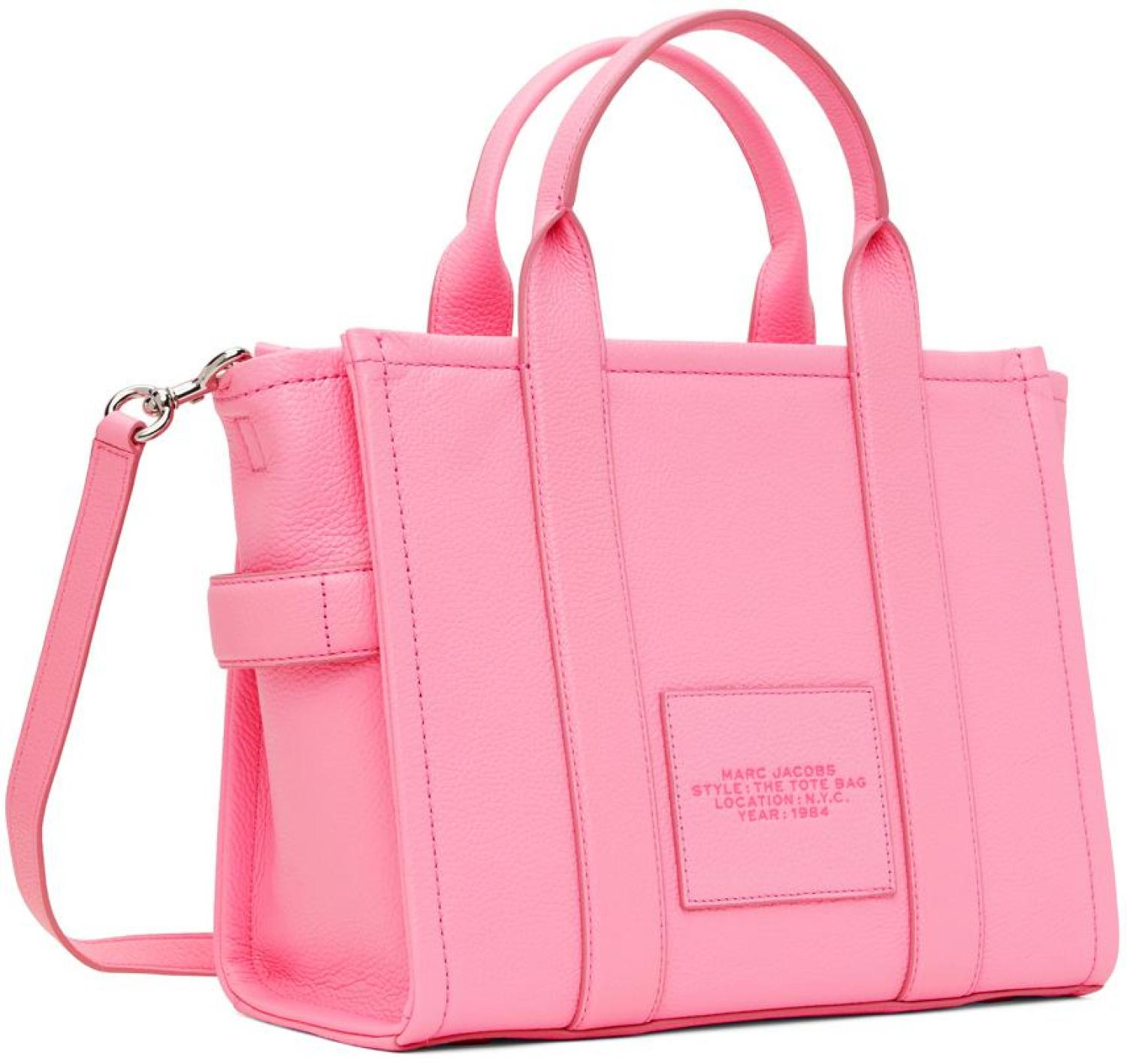 Marc Jacobs Pink 'The Leather Medium Tote Bag' Tote Grained leather tote in pink. Logo embossed at face. · Twin rolled carry handles · Detachable and adjustable shoulder strap · Logo patch at back face · Zip closure · Zip and patch pockets at interior · Card slot at interior · H11 x W12.5 x D5.25 in Supplier color: Fluro candy Leather. Made in Viet Nam. 232190F049135