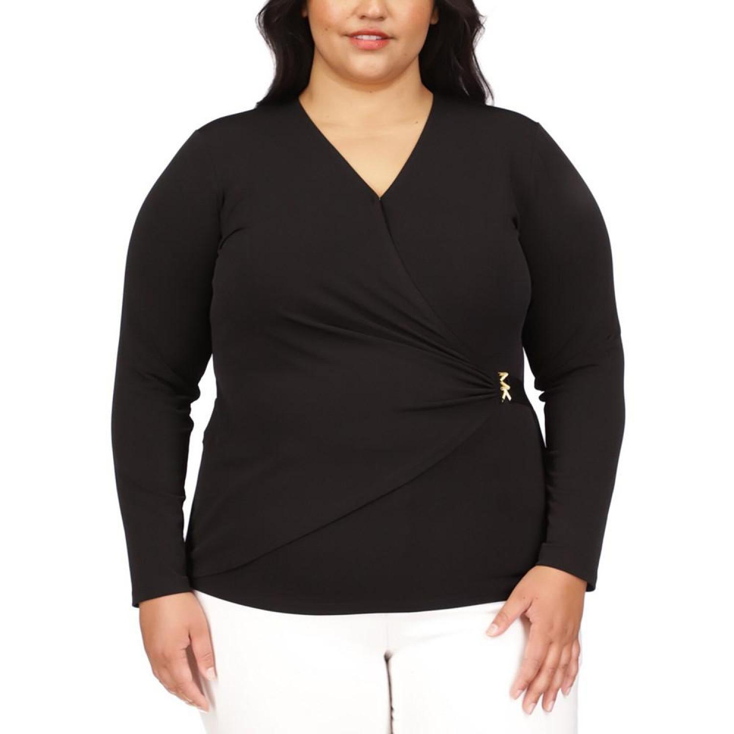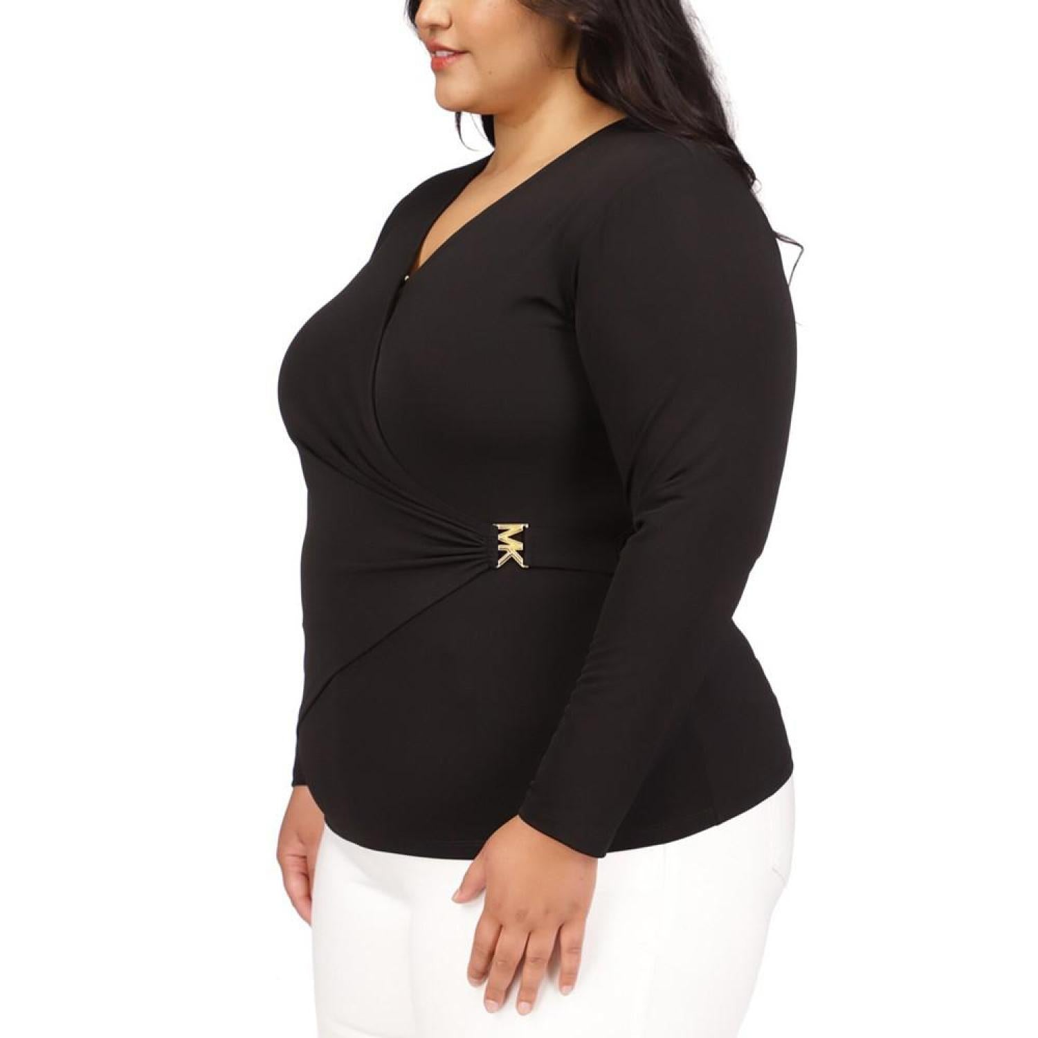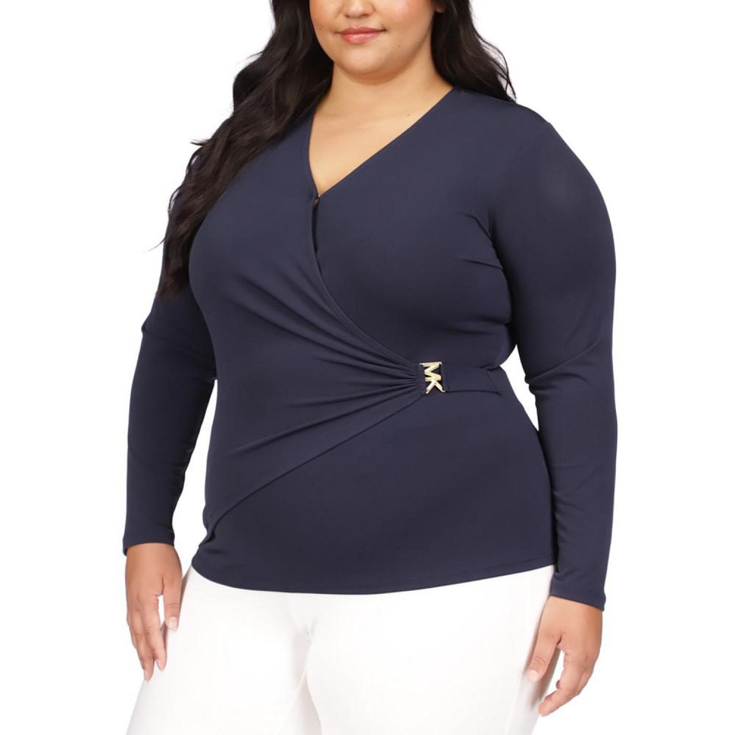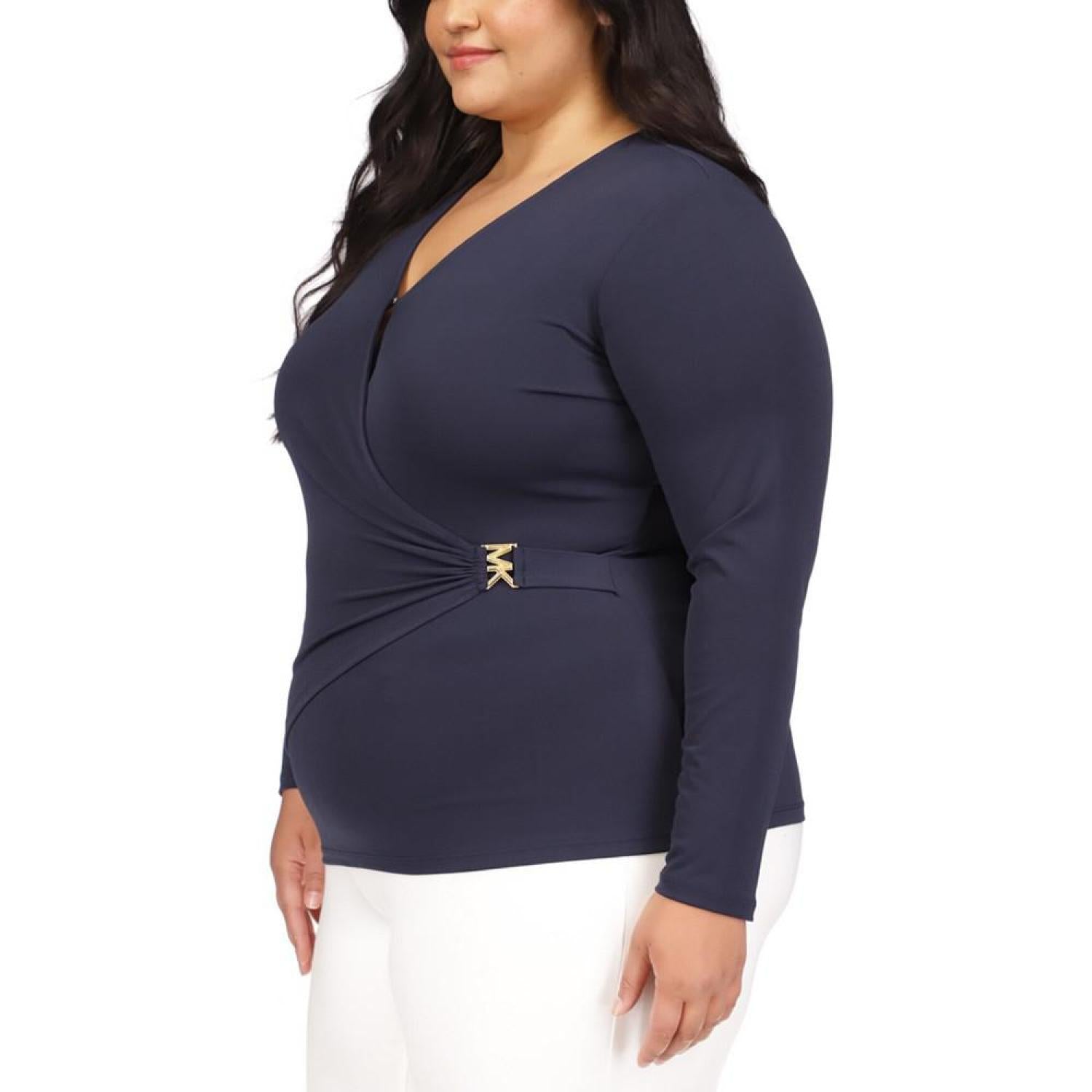 MICHAEL Michael Kors adds an accessorized feel to this plus size faux-wrap top with branded hardware at the waist. Surplice neckline Faux-wrap styling with branded hardware at side Polyester/elastane Machine washable Imported