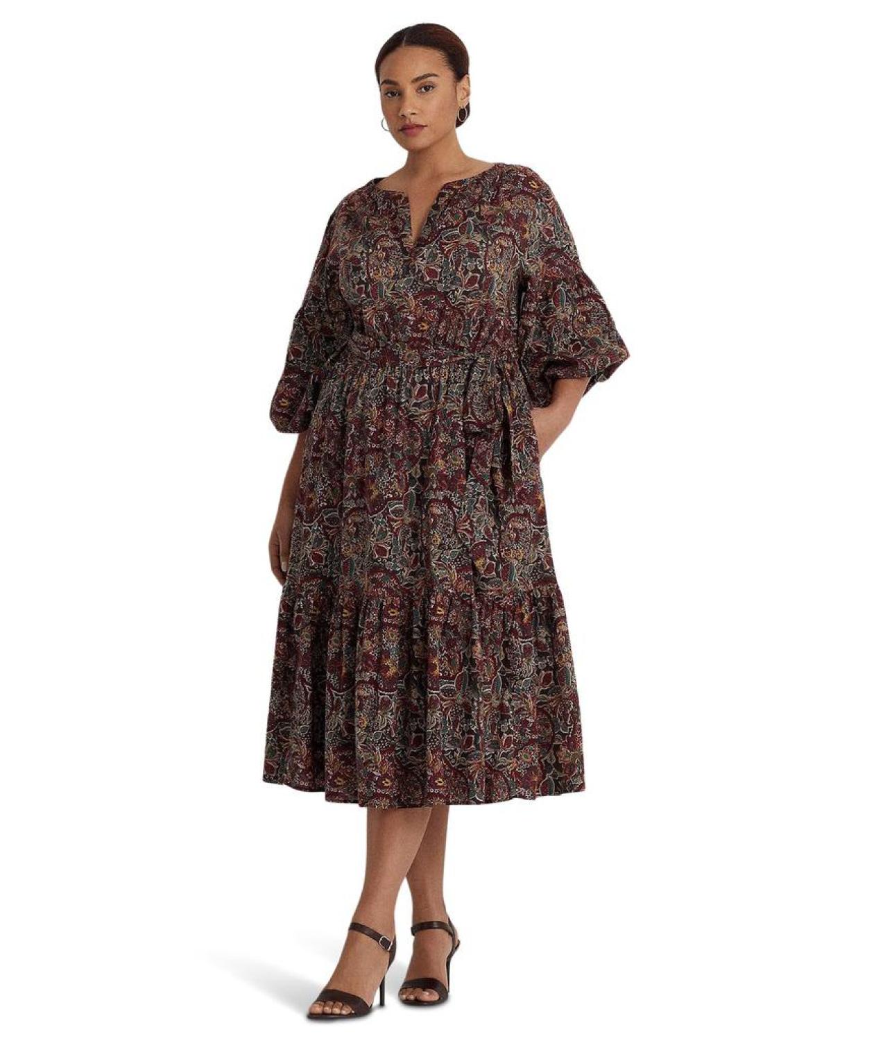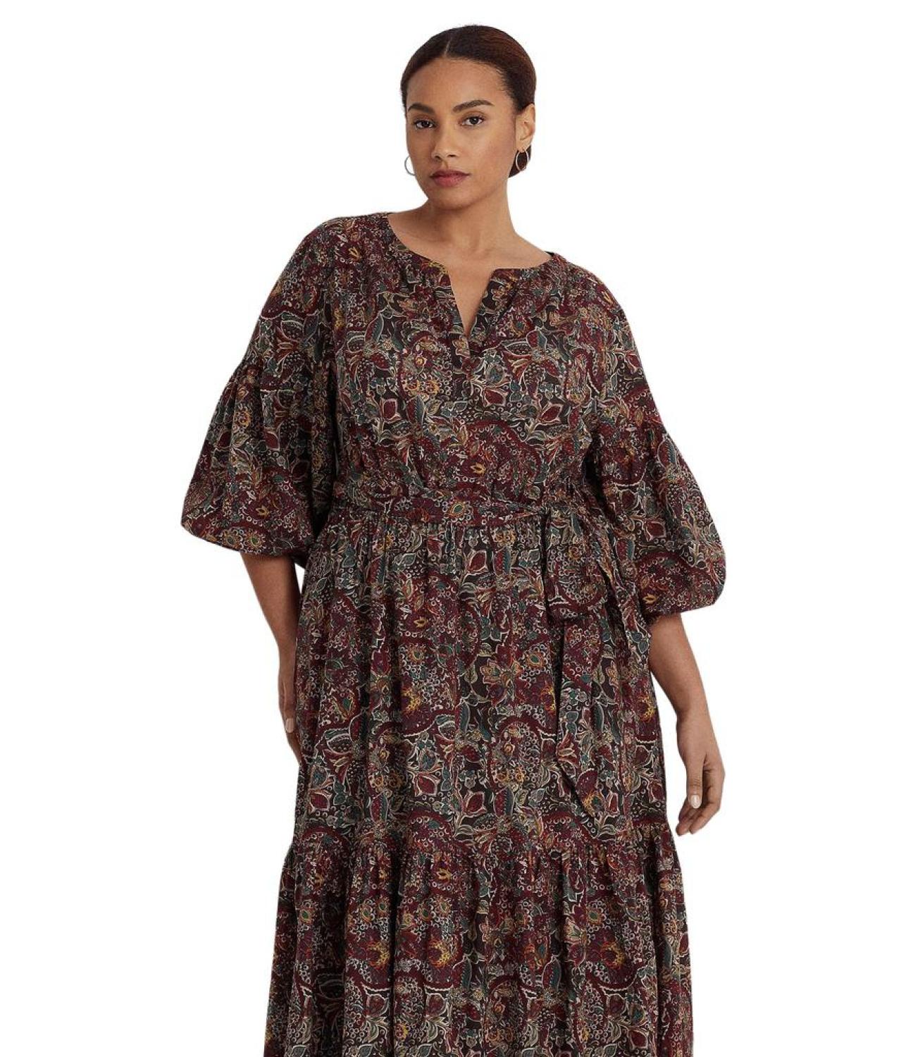 Dress up in the gorgeously crafted A-line LAUREN Ralph Lauren® Plus Size Floral Belted Cotton Voile Tiered Dress, designed for a fabulous day out in its breezy silhouette.
