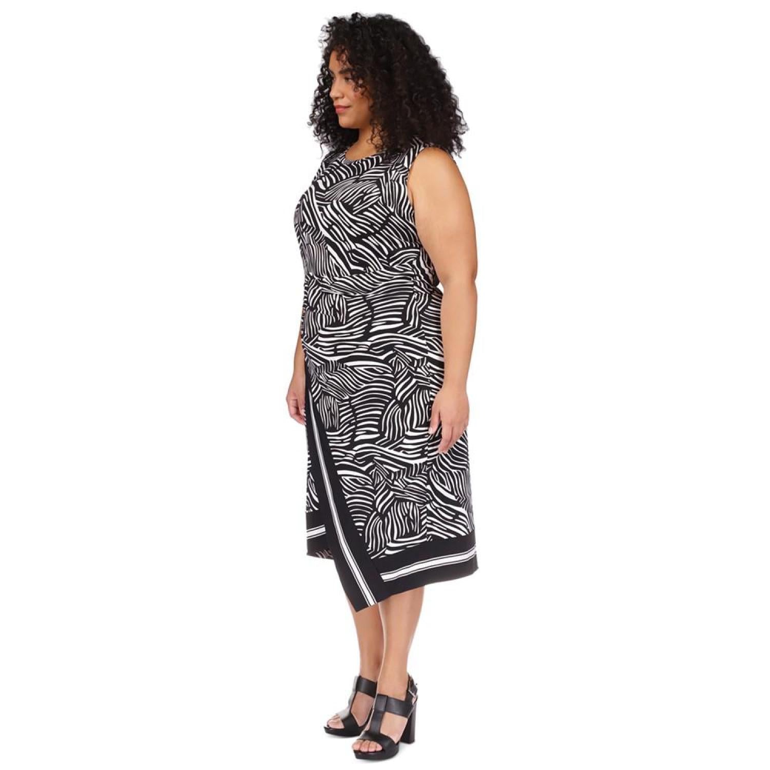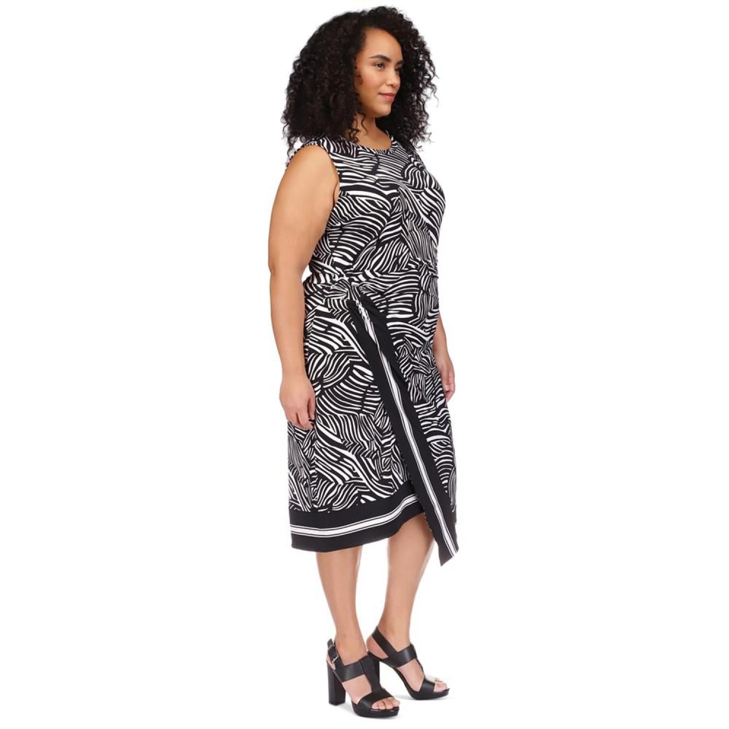 An asymmetric front hem and bold border add a chic touch to this printed plus size midi dress from Michael Kors.