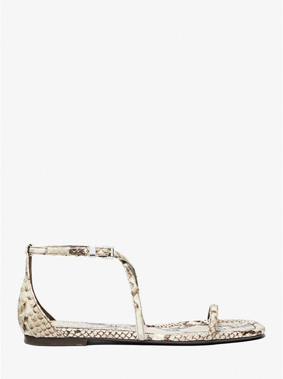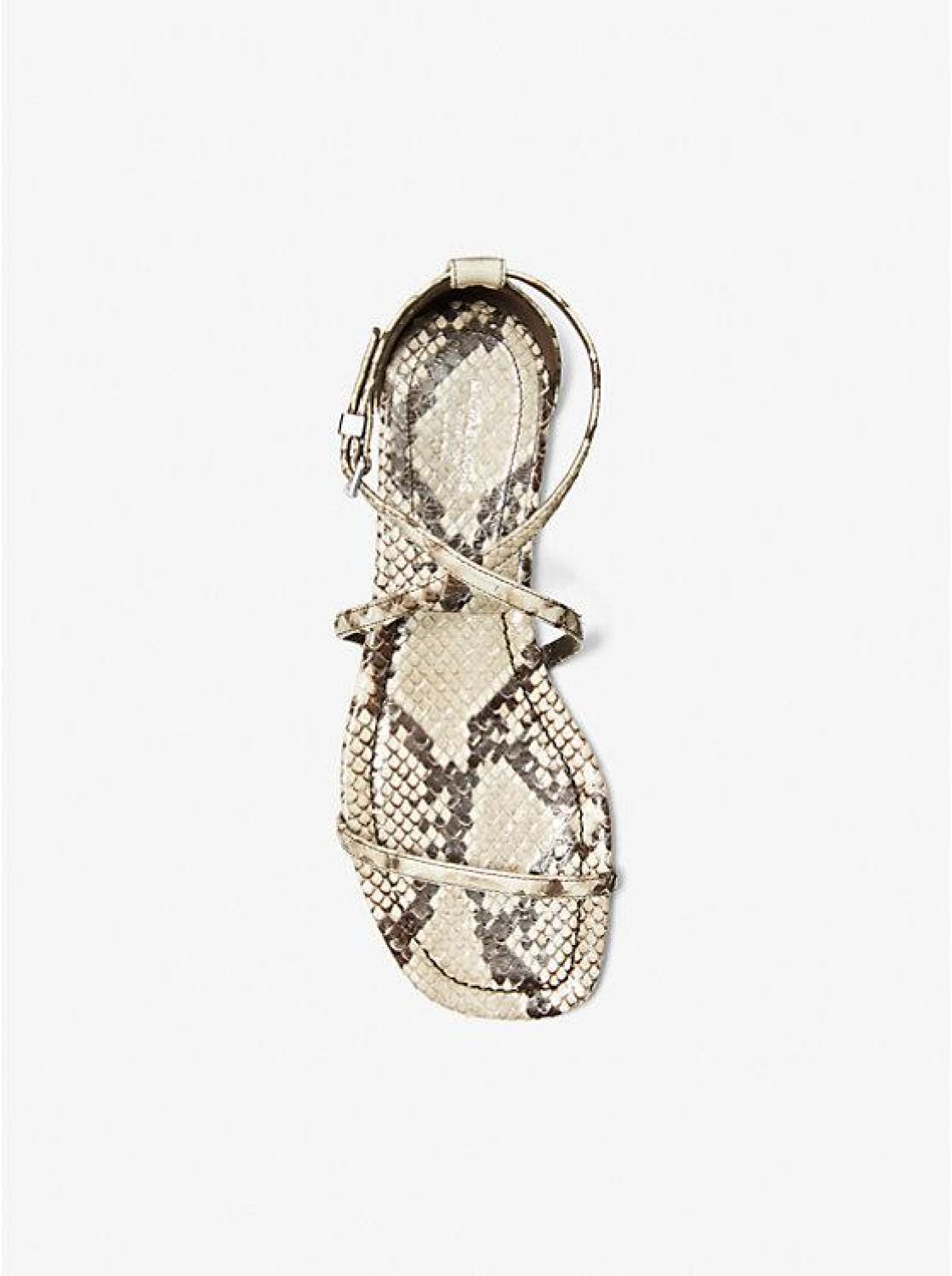 • Introducing Polly: a minimalist sandal that serves as a perfect complement to the season’s resort-ready looks. Slim crossover front straps define this python-embossed leather style, which rests on a low heel for comfortable wear. Style yours with a halter dress to exude effortless charm.