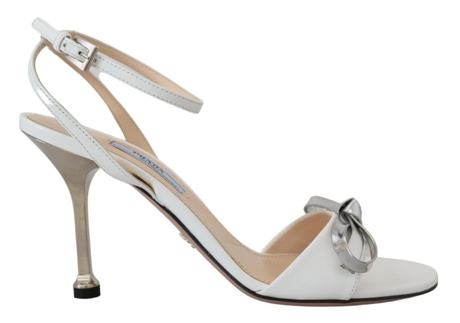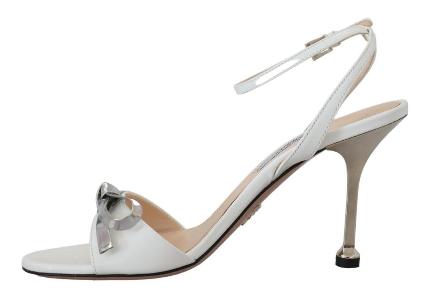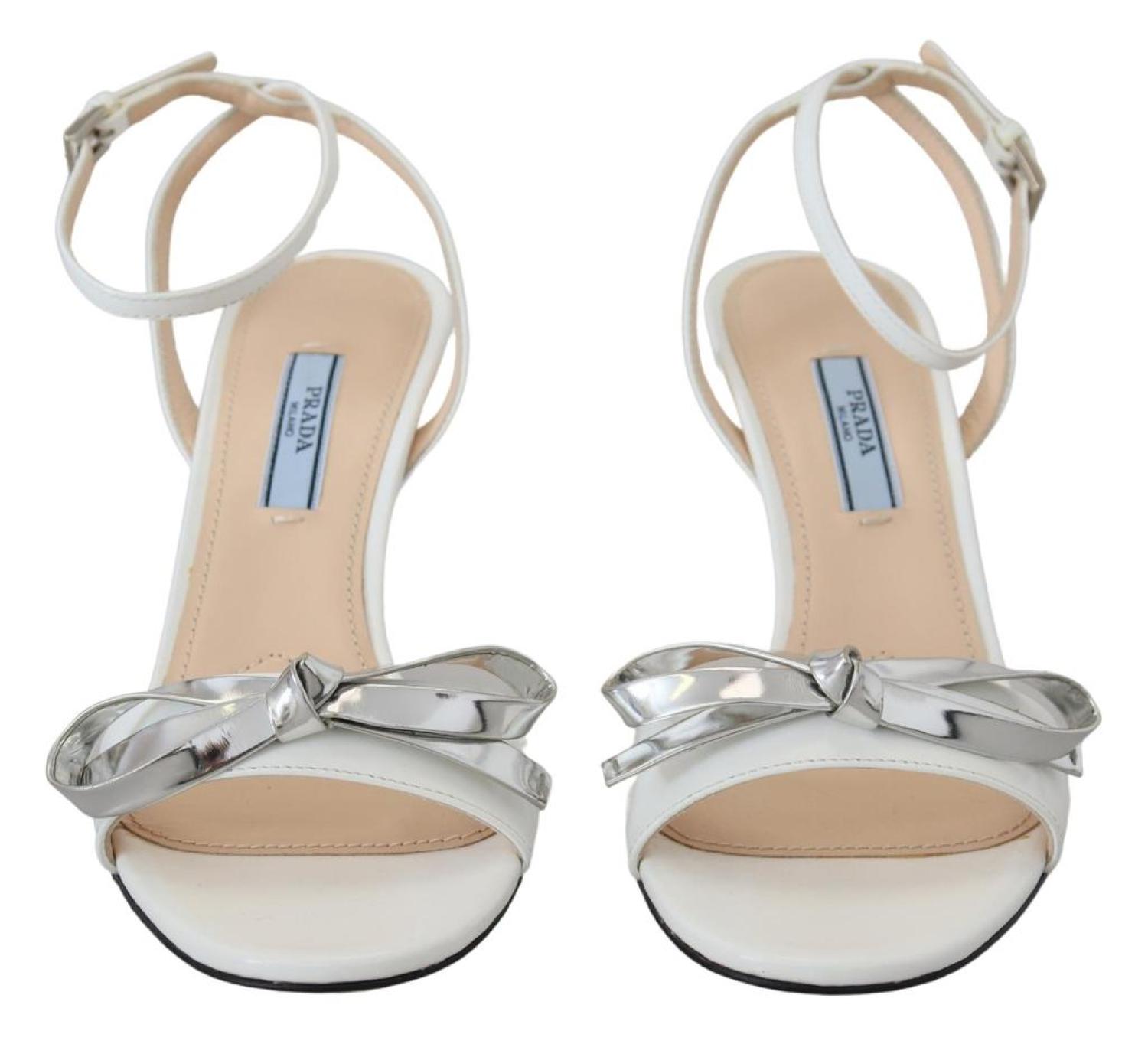 PRADAGorgeous brand new with tags, 100% Authentic PRADA ankle strap heels shoes.Model - Heels sandalsColor - Silver, WhiteLeather bottom soleLogo detailsMade in ItalyVery exclusive and high craftsmanshipMaterial - 100% Leather