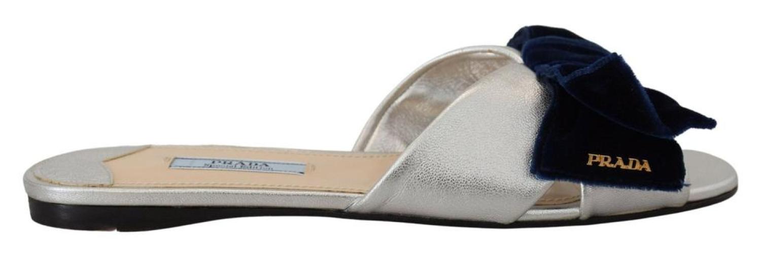 PRADAGorgeous brand new with tags, 100% Authentic PRADA flats shoes.Model - Flat sandalsColor - Silver, Navy BlueLeather bottom soleLogo detailsMade in ItalyVery exclusive and high craftsmanshipMaterial - 100% Leather