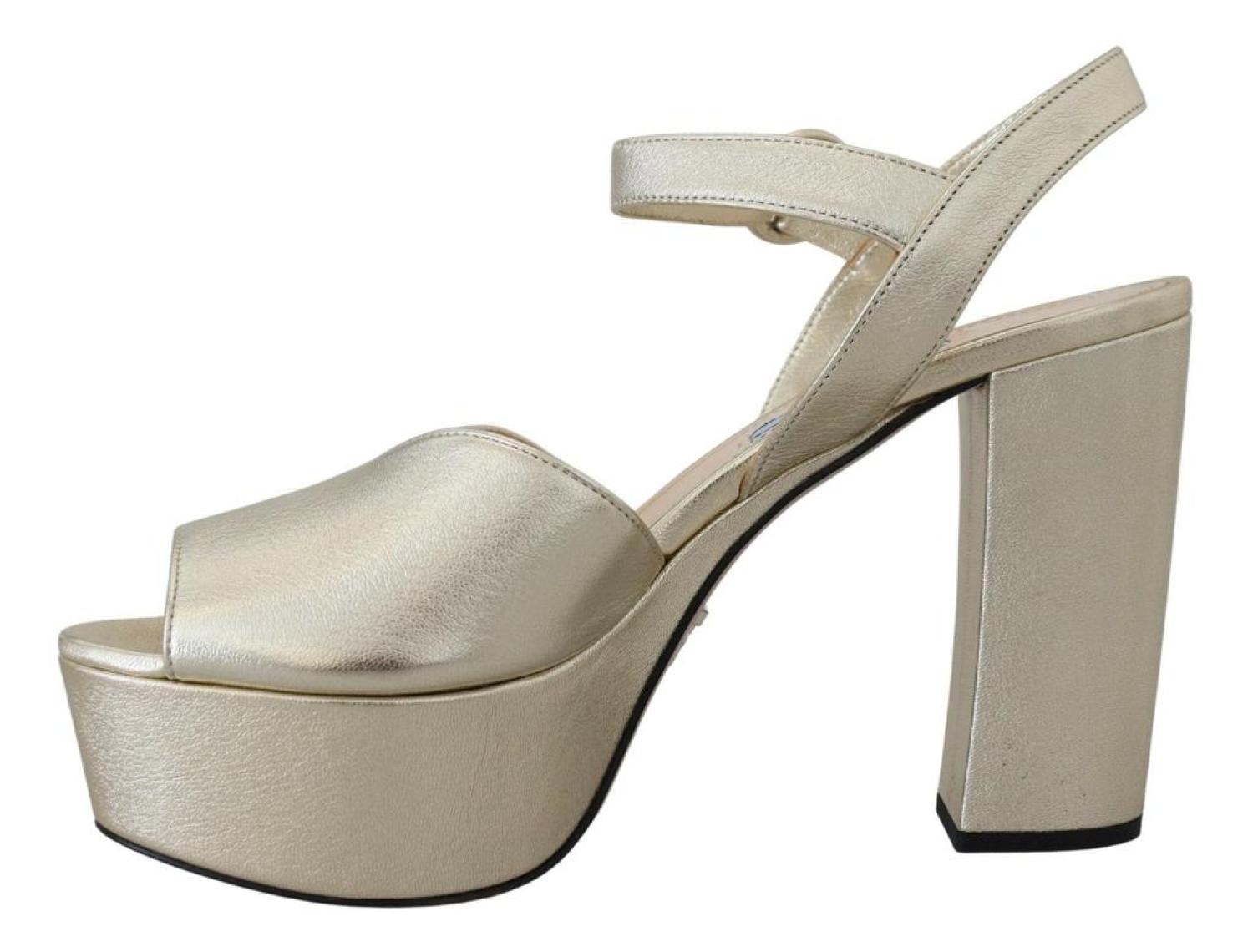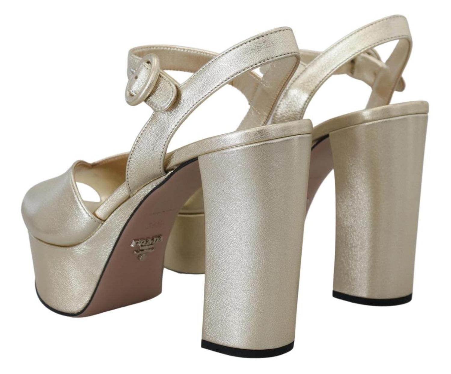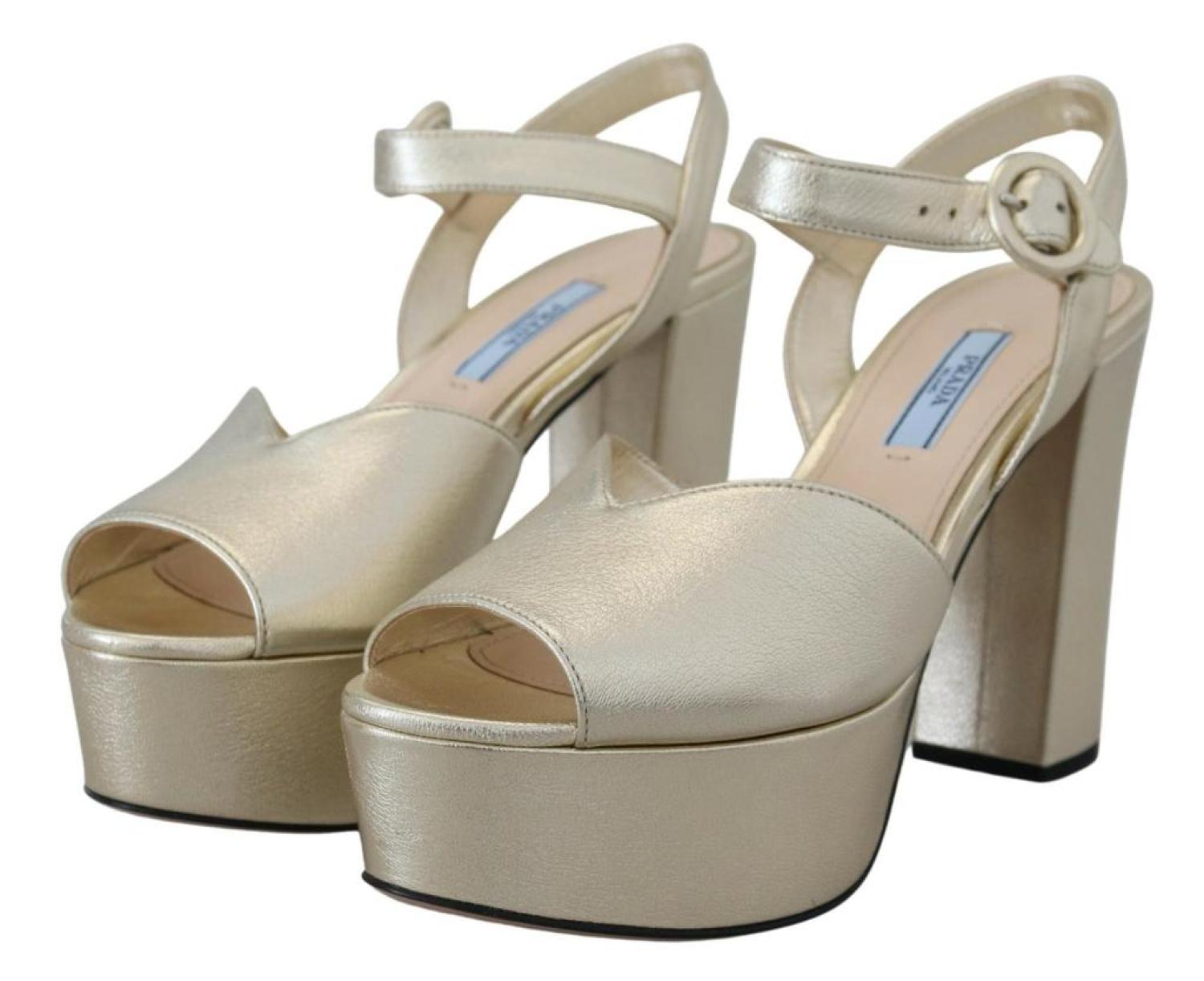 PRADAGorgeous brand new with tags, 100% Authentic PRADA block heels shoes.Model - Block heels platform sandalsColour - GoldLeather bottom soleLogo detailsMade in ItalyVery exclusive and high craftsmanshipMaterial - 100% Leather