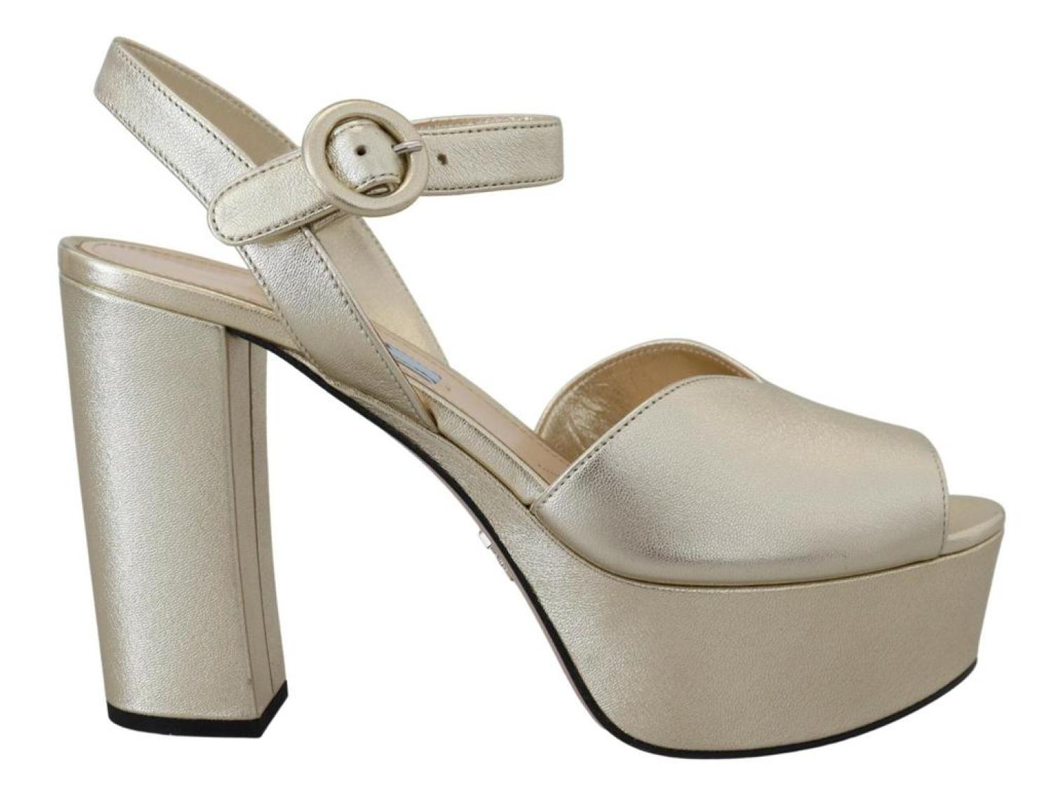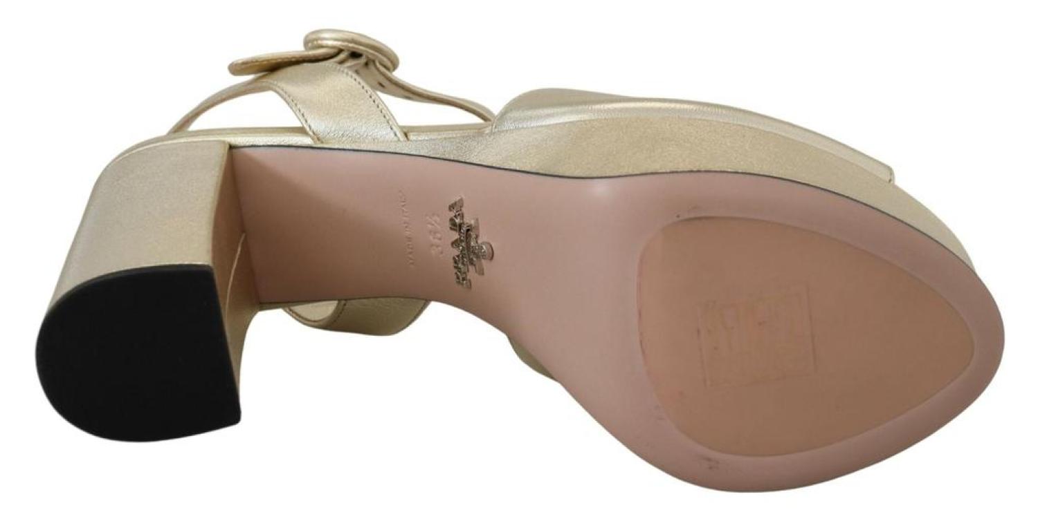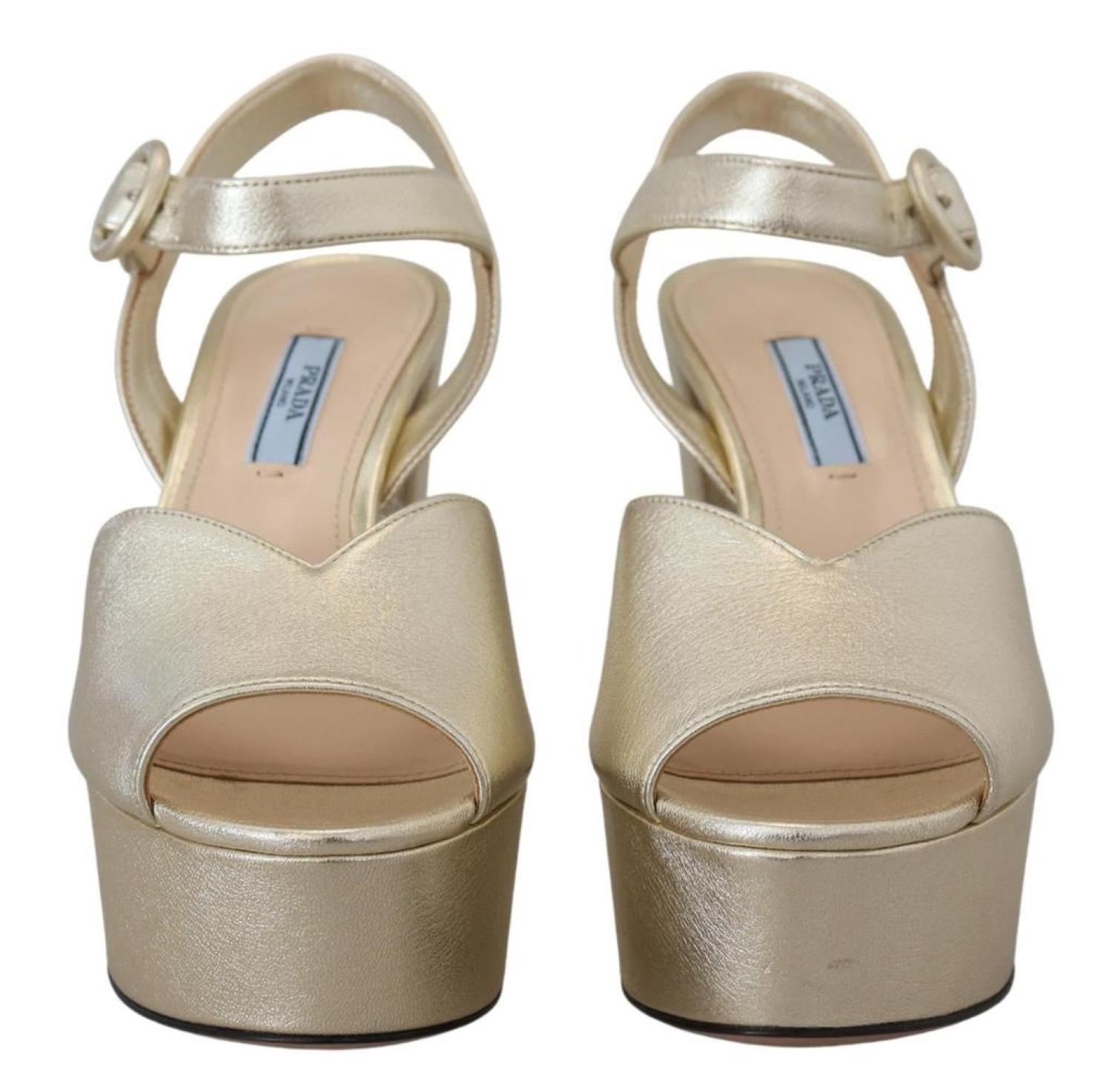 PRADAGorgeous brand new with tags, 100% Authentic PRADA block heels shoes.Model - Block heels platform sandalsColour - GoldLeather bottom soleLogo detailsMade in ItalyVery exclusive and high craftsmanshipMaterial - 100% Leather
