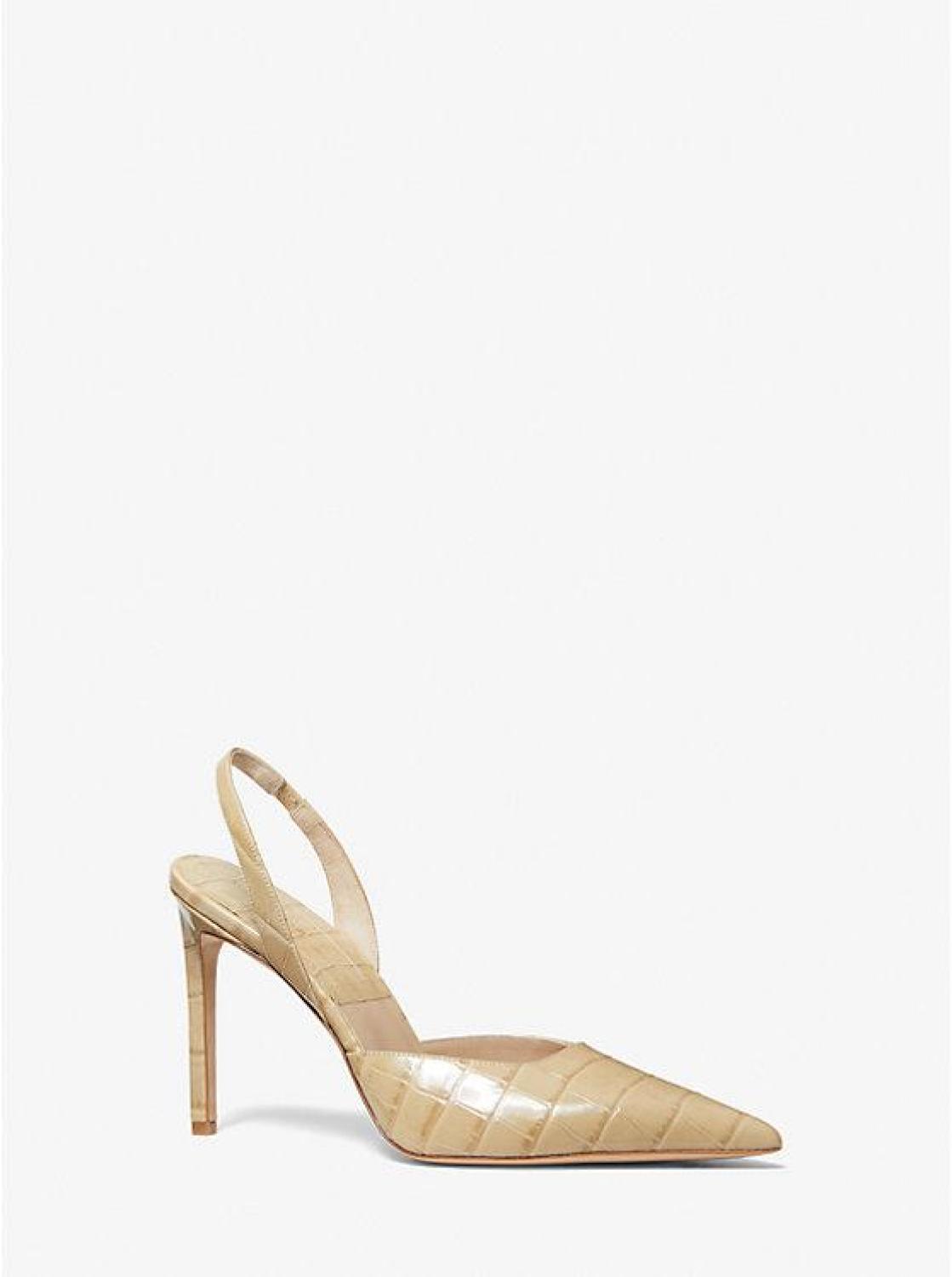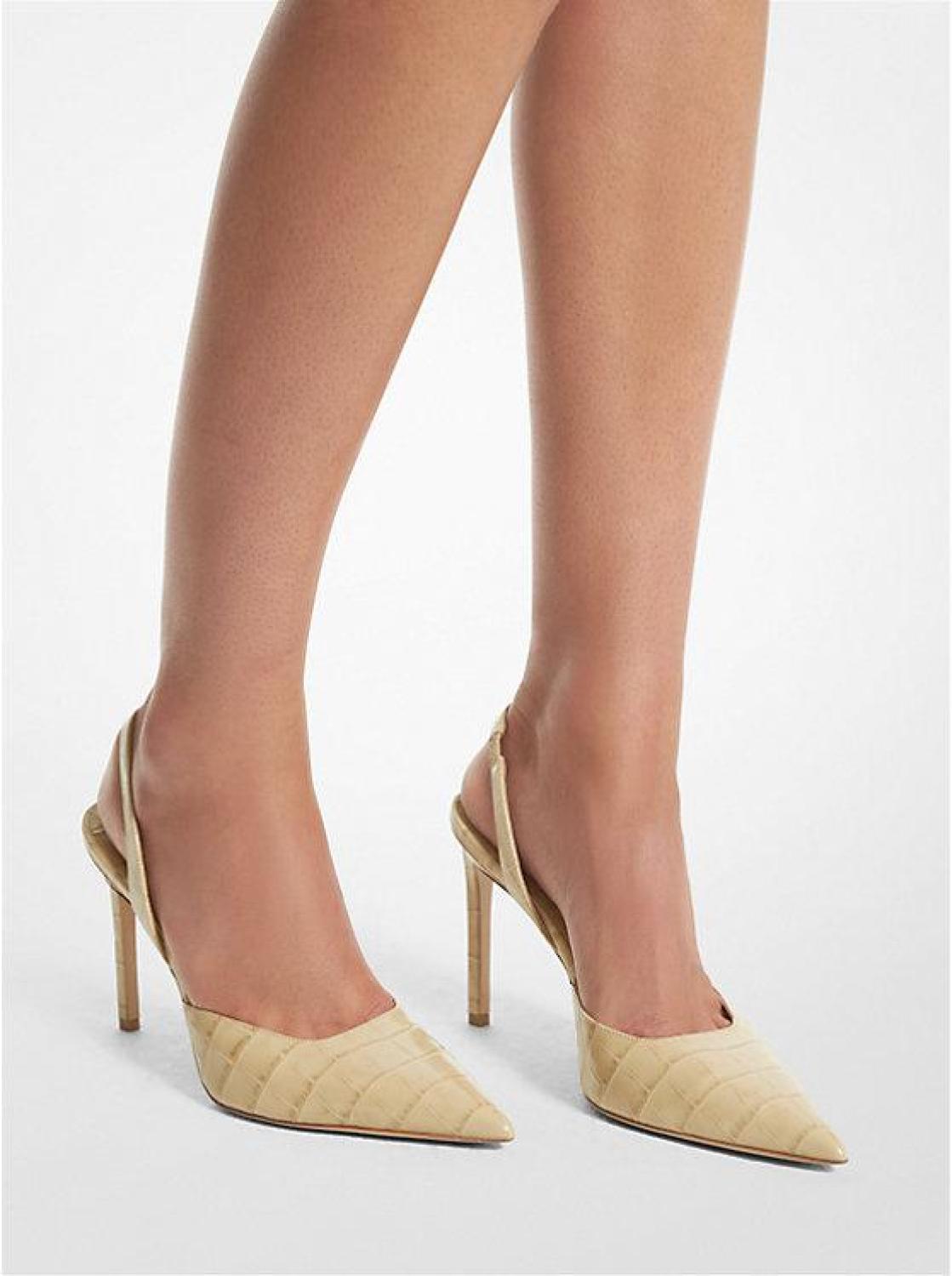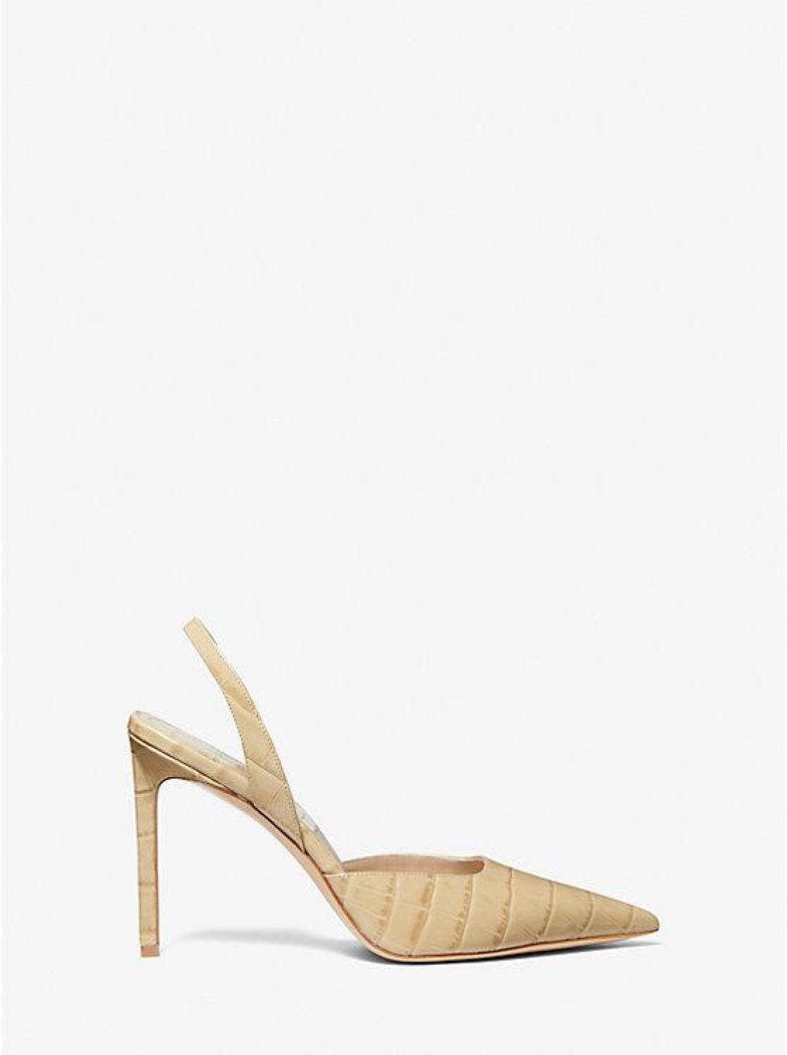 • The classically refined Presley pump is crafted from crocodile-embossed leather in a sharp, pointed-toe silhouette. Featuring a sleek stiletto heel, this pair is finished with a flexible slingback strap for a vintage-inspired finish. Juxtapose the glossy pump with crisp white looks, or pair it back to an all-black ensemble.