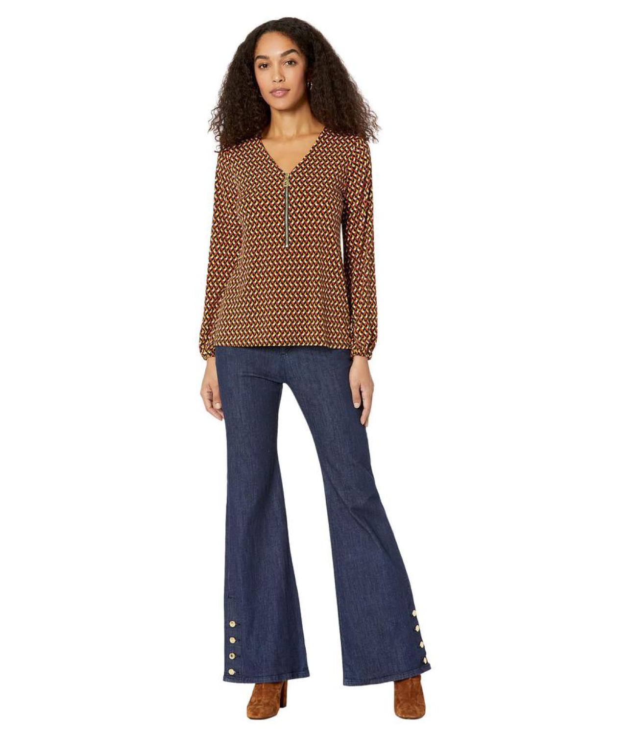 Feel the flare of a fashion-forward look by wearing MICHAEL Michael Kors® Printed Long Sleeve Dog Tag Top. Slim fit. Pull-on style. V-neckline. Half zipper closure. Long sleeves with elasticated cuffs. Straight hem with side cutout. Diamond-inspired prints allover. 95% polyester, 5% elastane. Dry clean or machine wash cold, lay flat to dry. Imported. Product measurements were taken using size SM. Please note that measurements may vary by size. Measurements: Length: 25 in Sleeve Length: 28 in-