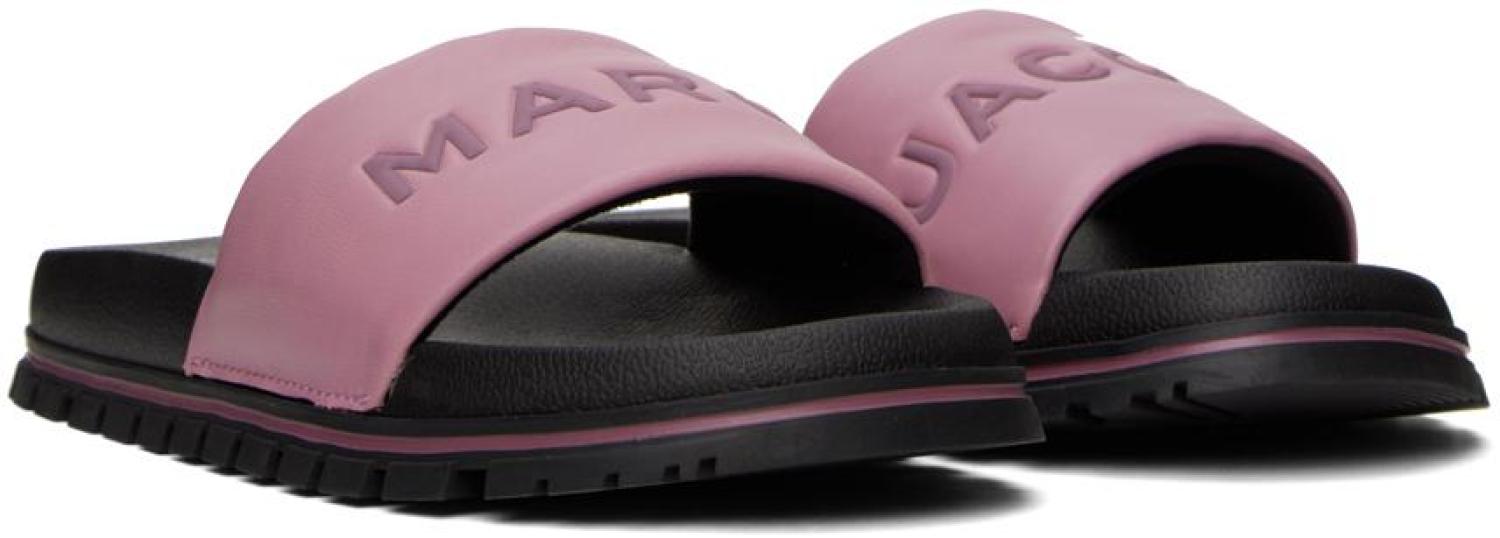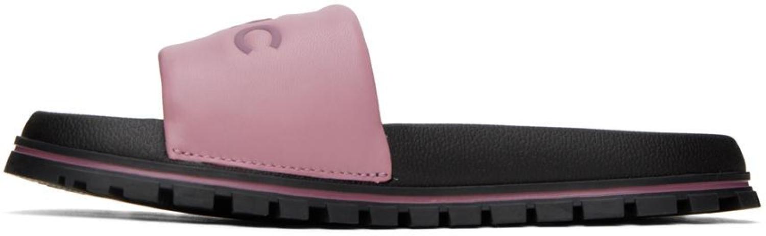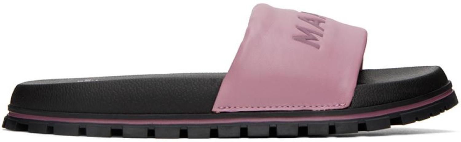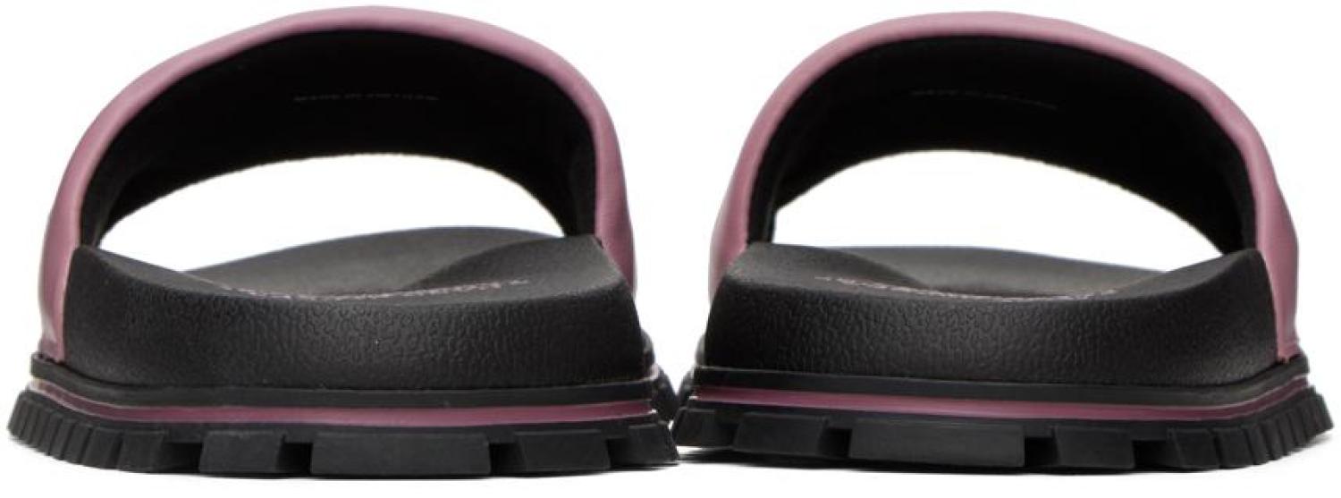 Padded grained leather slip-on sandals in purple and black. Logo embossed at vamp.