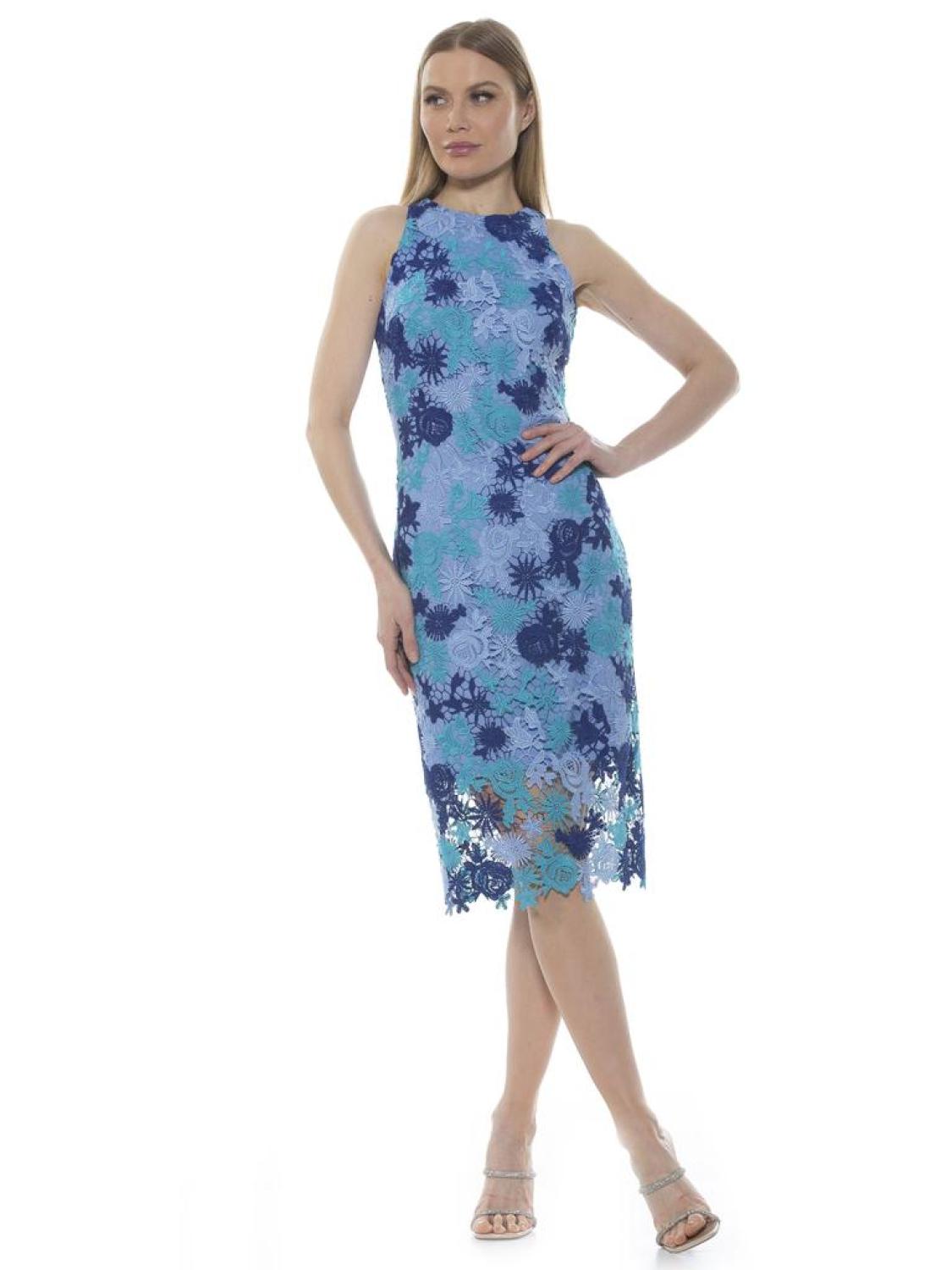 PRODUCT FEATURES Jewel neck?� Sleeveless Back hidden zip closure with hook-and-eye clasp Floral crochet lace construction Sheath silhouette Back vent 100% Polyester Lined - 97%, 3% Spandex Hand Wash Imported Style D2597