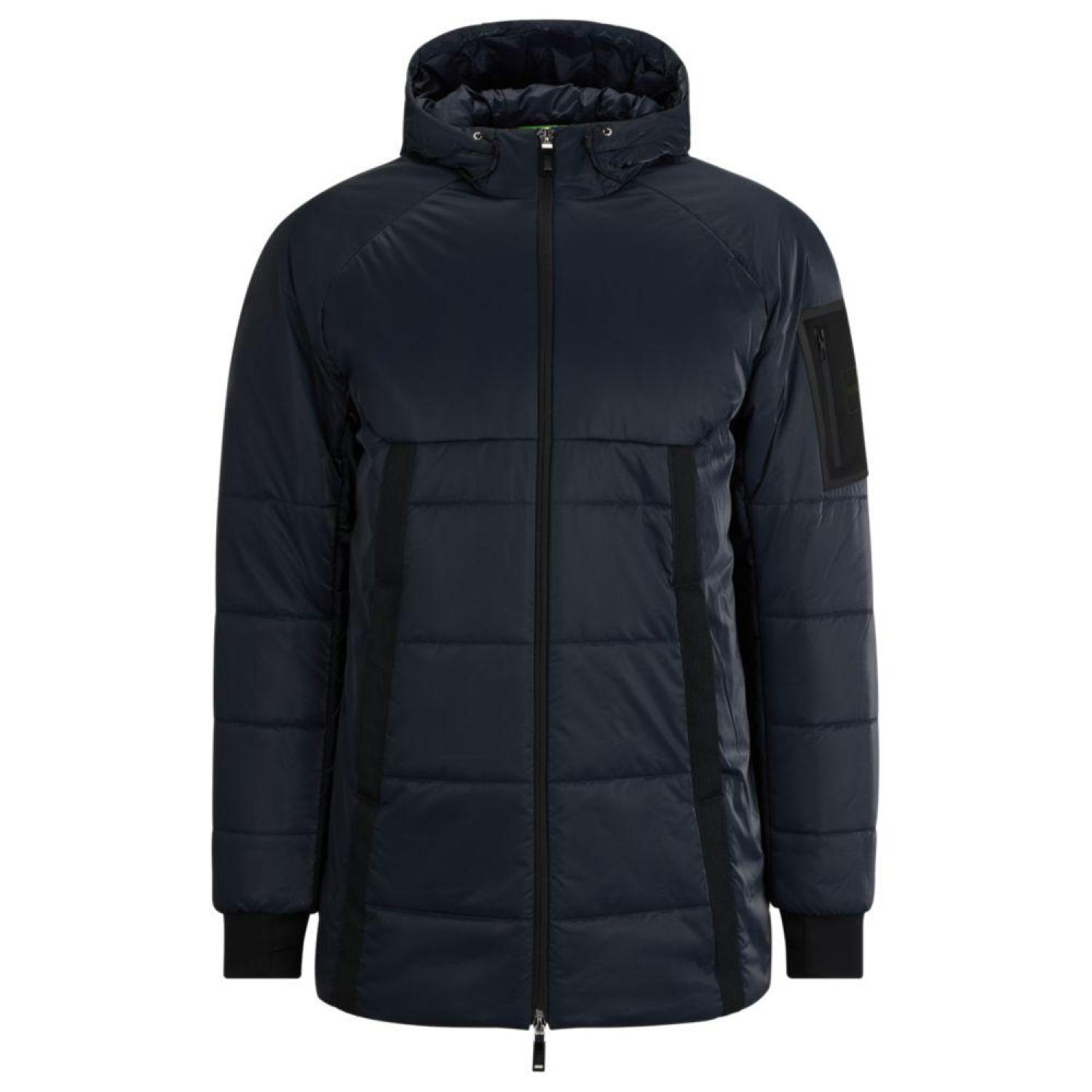 • A regular-fit hooded jacket in padded velour with ribbon trims and a branded sleeve pocket by BOSS Menswear.