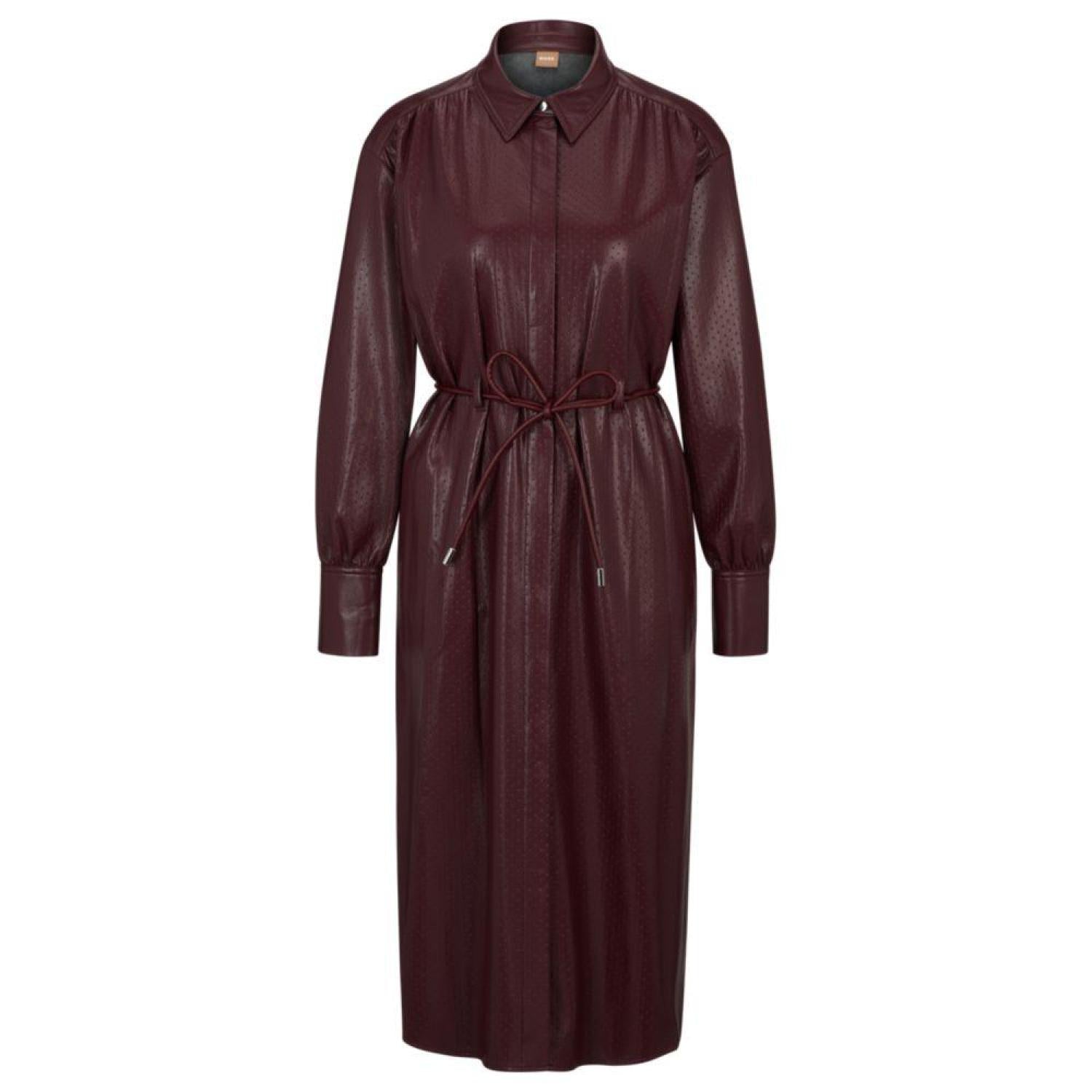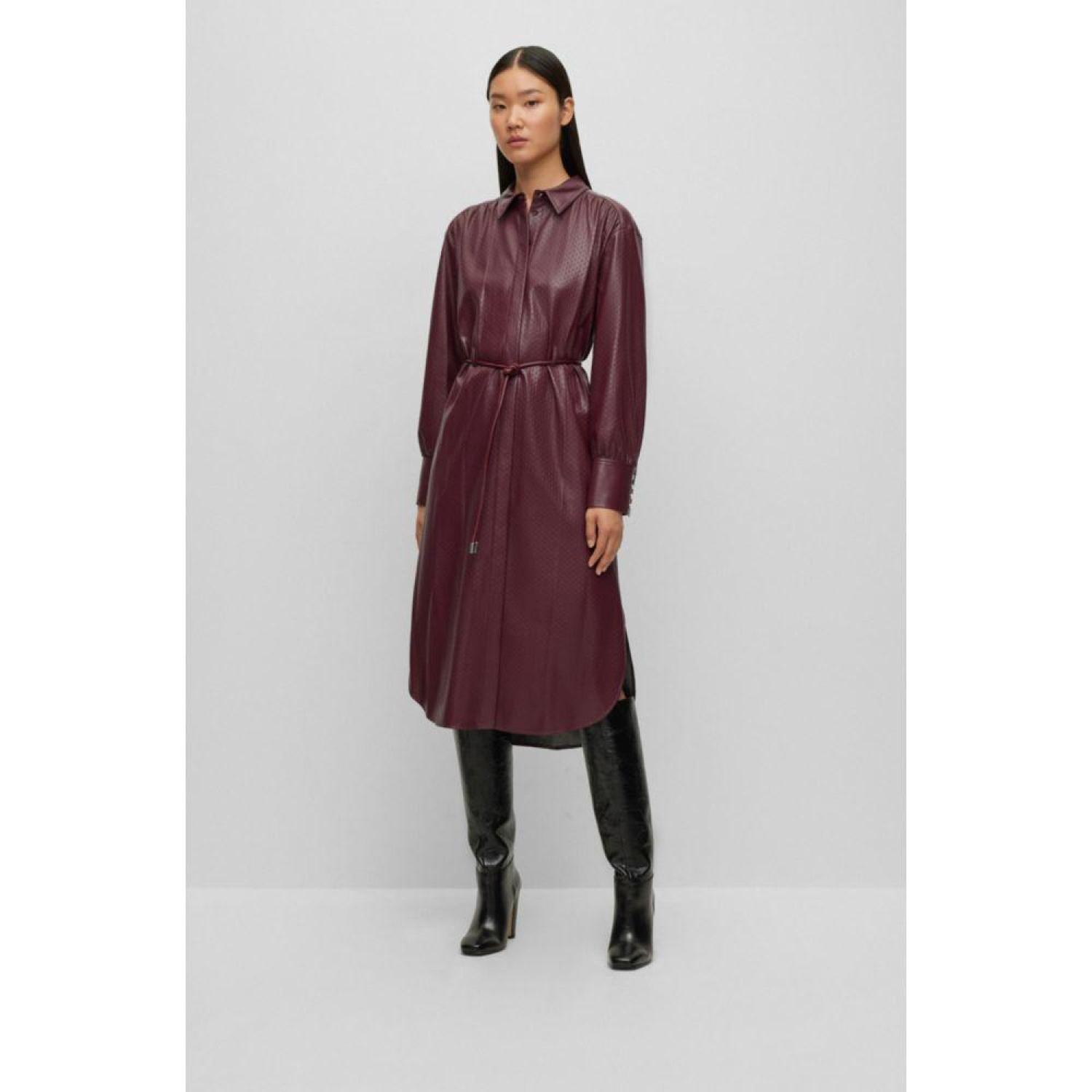 A relaxed-fit shirt dress with long sleeves, by BOSS Womenswear. Trimmed with hardware buttons, this chic dress is designed in embossed fabric with a light sheen and solid panels for contrast. A tie-up belt with hardware tips completes this contemporary piece.
