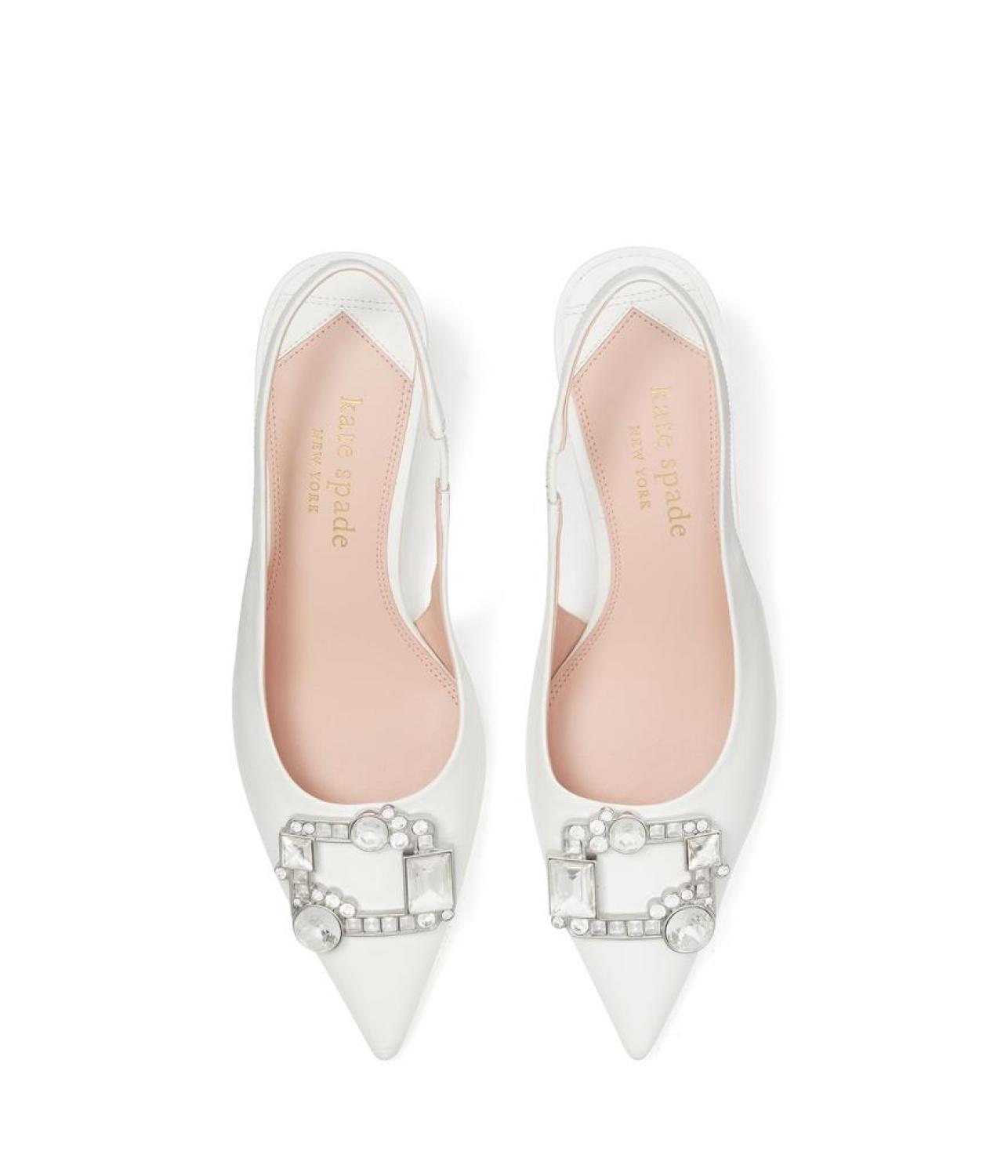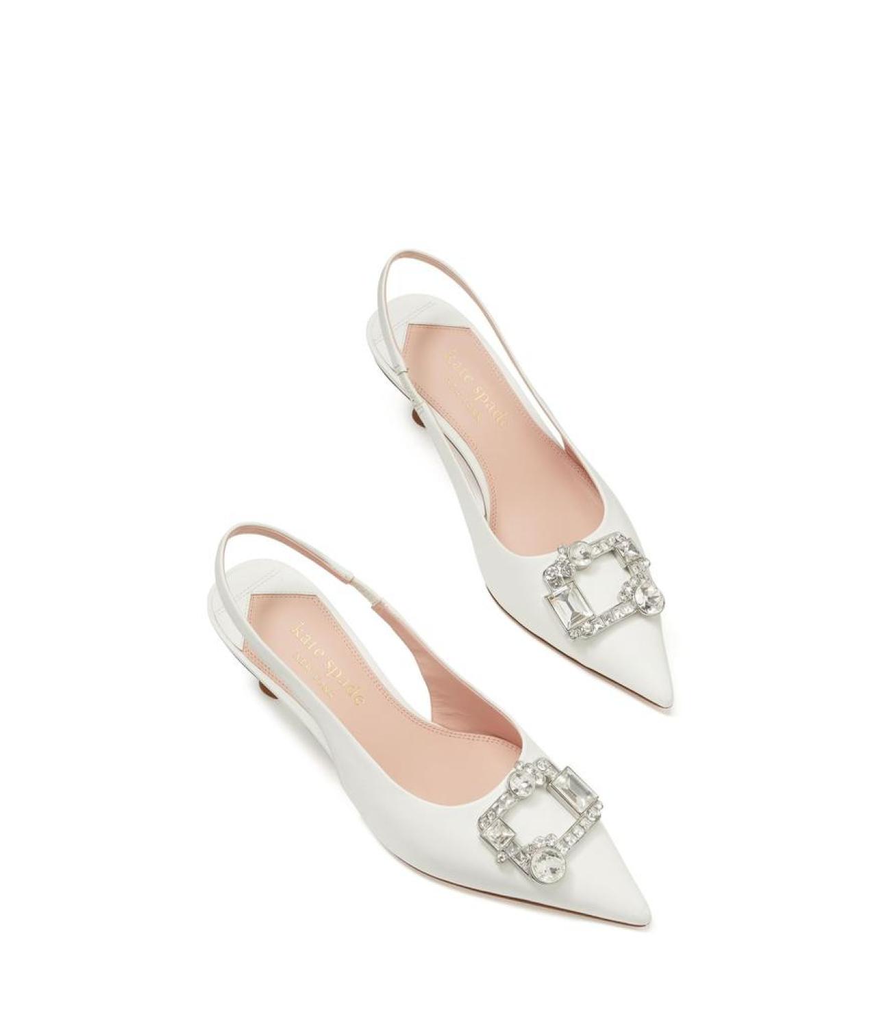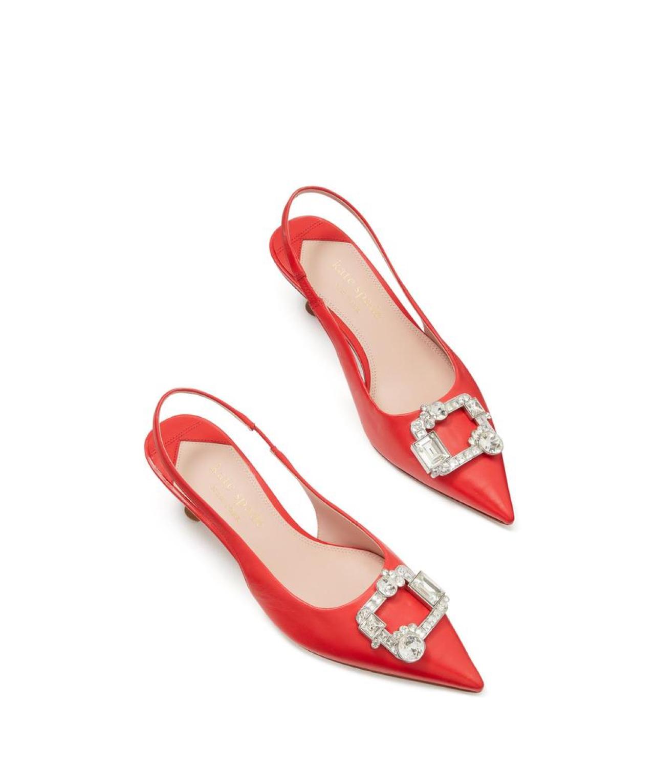 • Kate Spade New York® Renata Sling Heels earn perfect scores in the style category with their timeless pointed toe balanced by the hourglass kitten heel and the sparkling gemstone-embellished squared buckle on the vamp. The shoes are lightweight and made durable with the leather upper, lining, and insole.