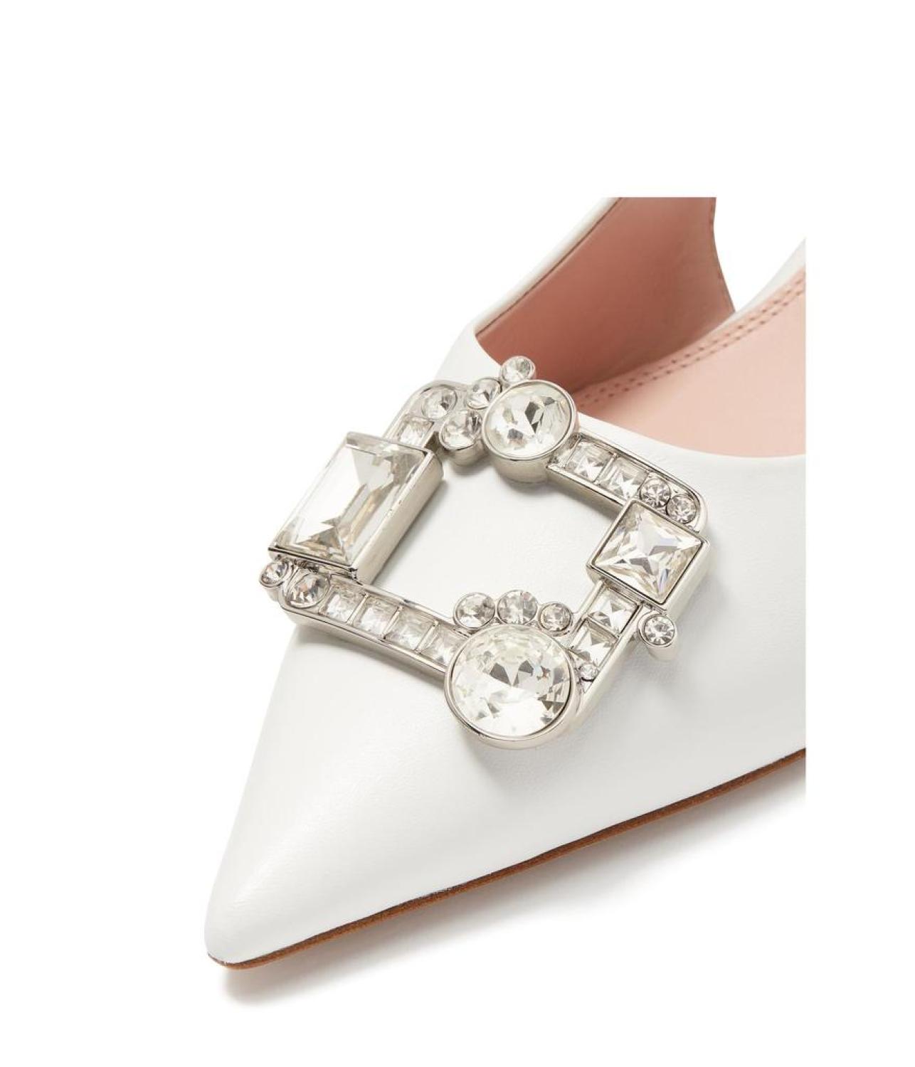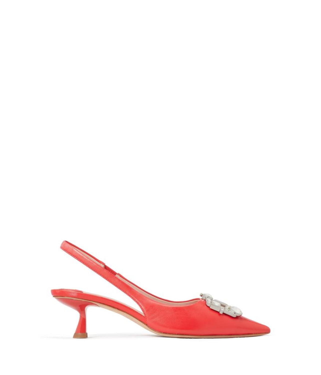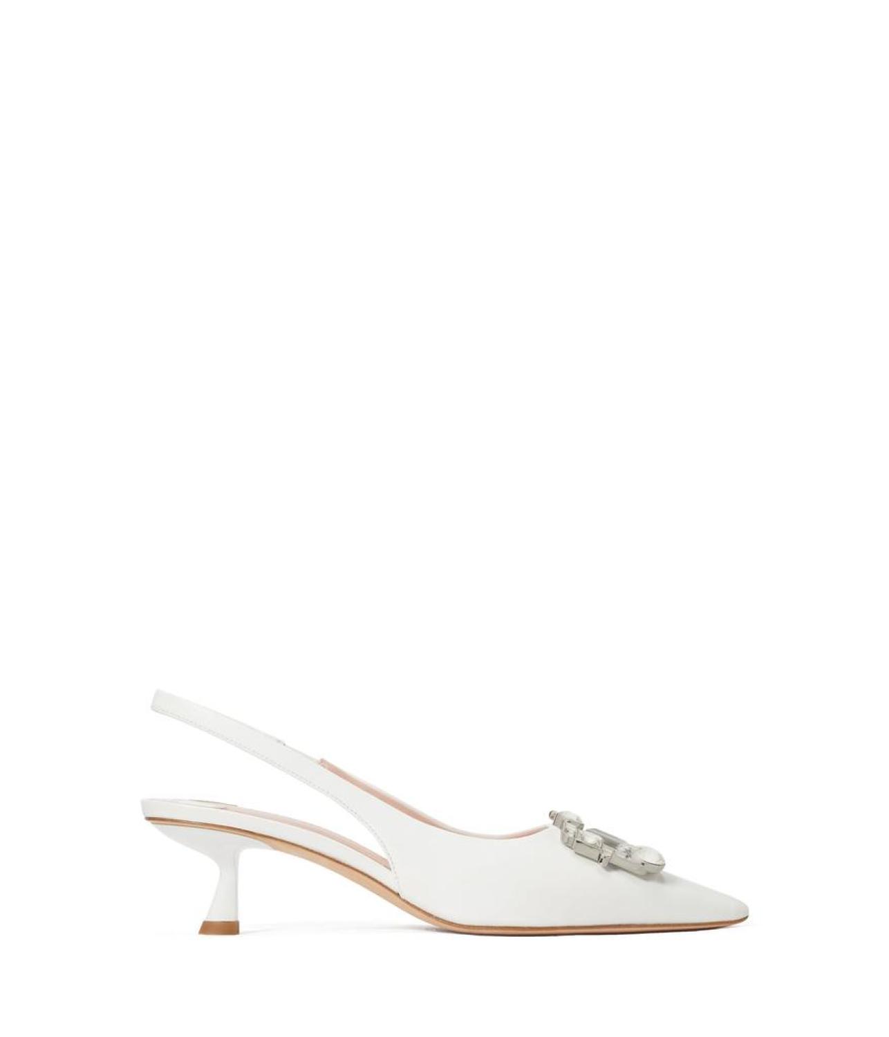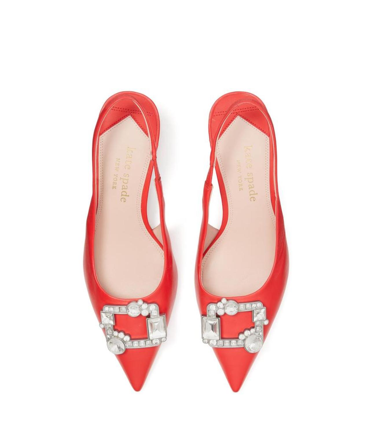 • Kate Spade New York® Renata Sling Heels earn perfect scores in the style category with their timeless pointed toe balanced by the hourglass kitten heel and the sparkling gemstone-embellished squared buckle on the vamp. The shoes are lightweight and made durable with the leather upper, lining, and insole.