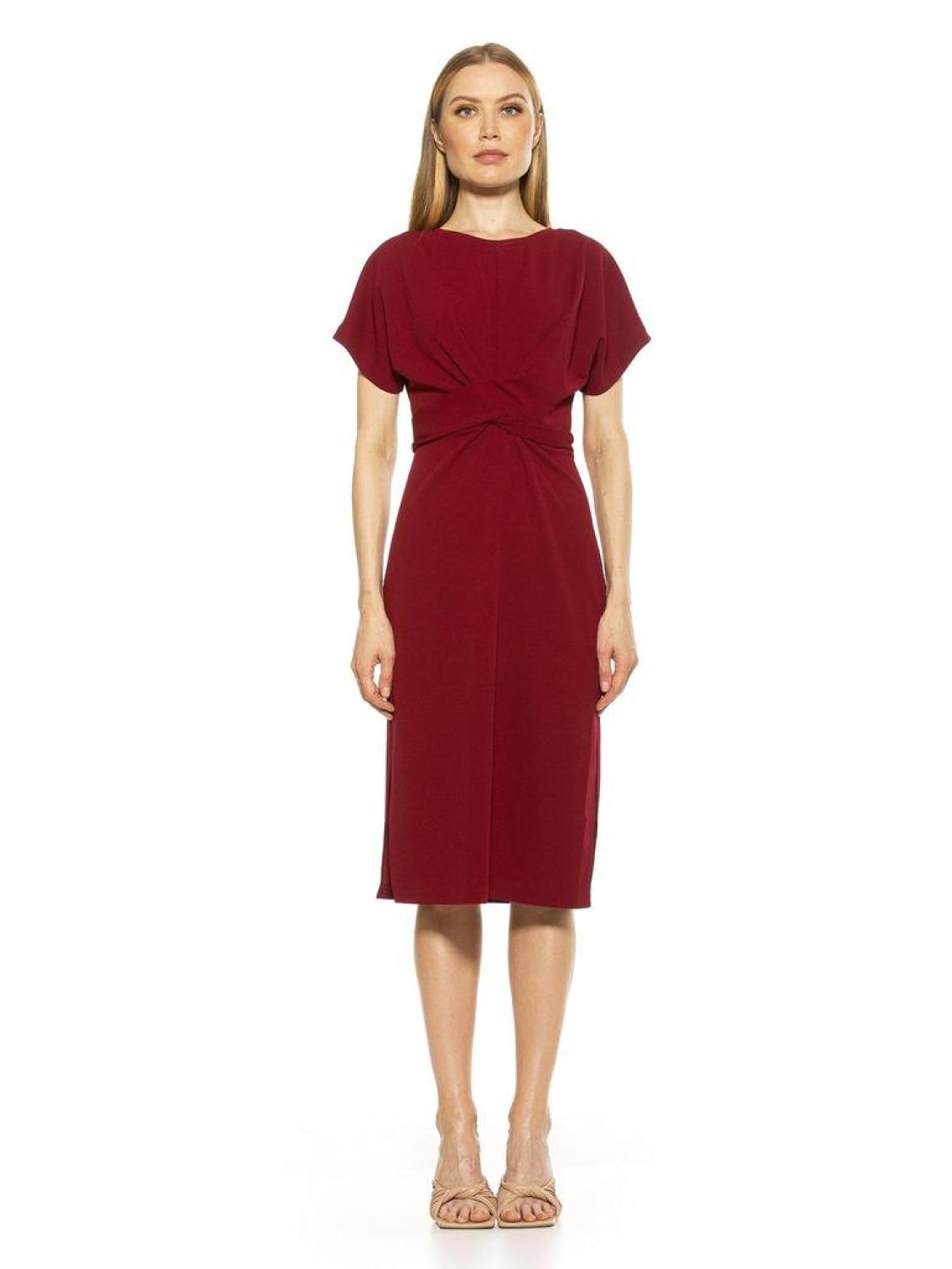 PRODUCT FEATURES Crew neck?� Short dolman sleeves Waist self-tie detail Side slit at hem Midi length Stretch scuba crepe fabric 95% Polyester, 5% Spandex Hand wash cold Imported Style D3495