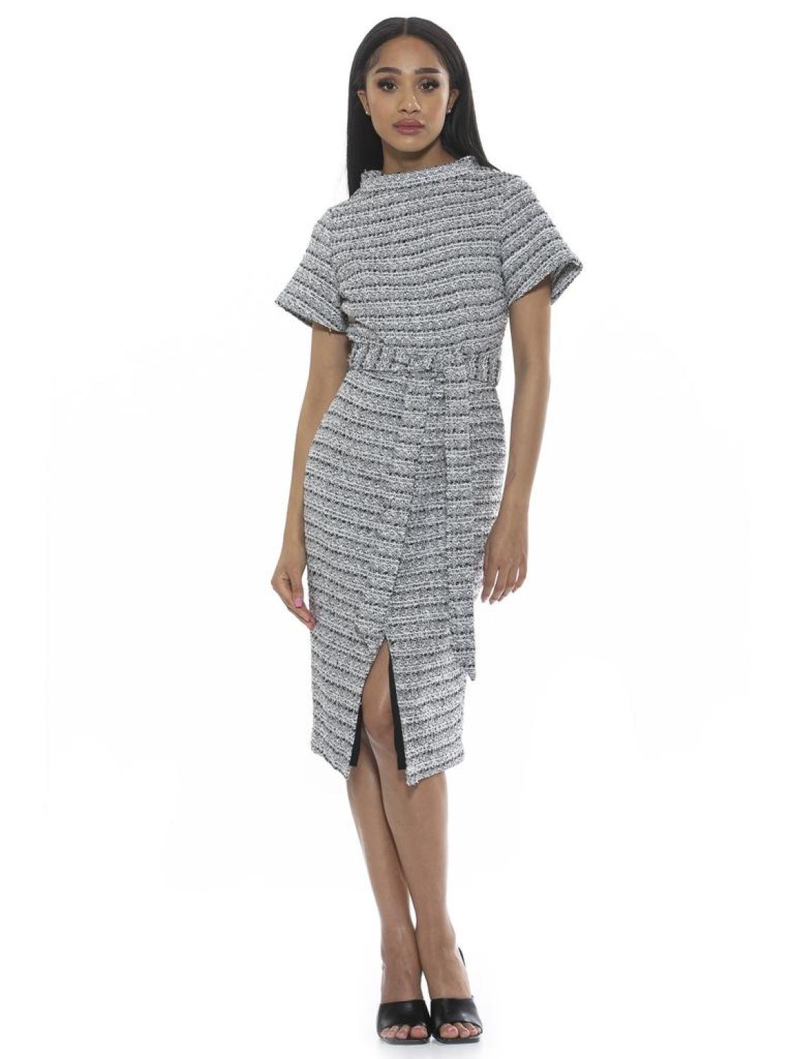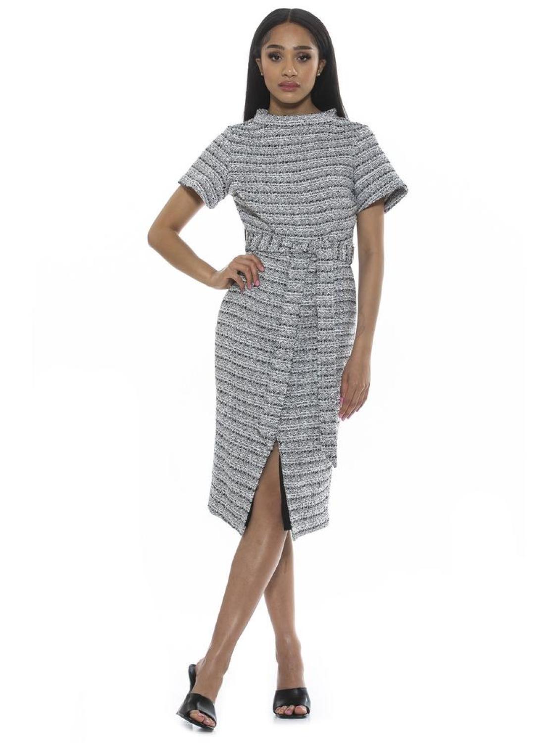 PRODUCT FEATURES Invisible zip closure Crew neck Short sleeve 99% Polyester, 1% Metallic Lining - 97% Polyester, 3% Spandex Hand Wash Imported Style D4038