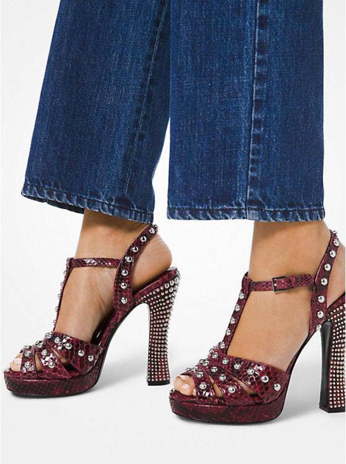 • The Rosanna platform sandals are designed from genuine python and adorned with studs for rock ‘n’ roll glamour. Set on a towering heel, this T-strap silhouette will add a high-impact finish to myriad ensembles. Made in Italy.