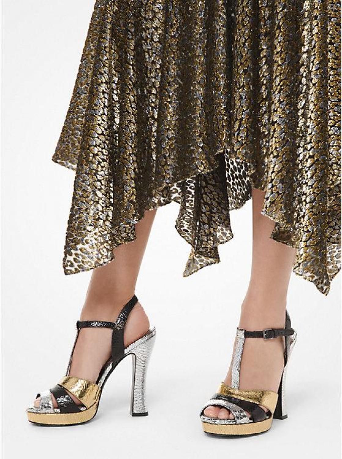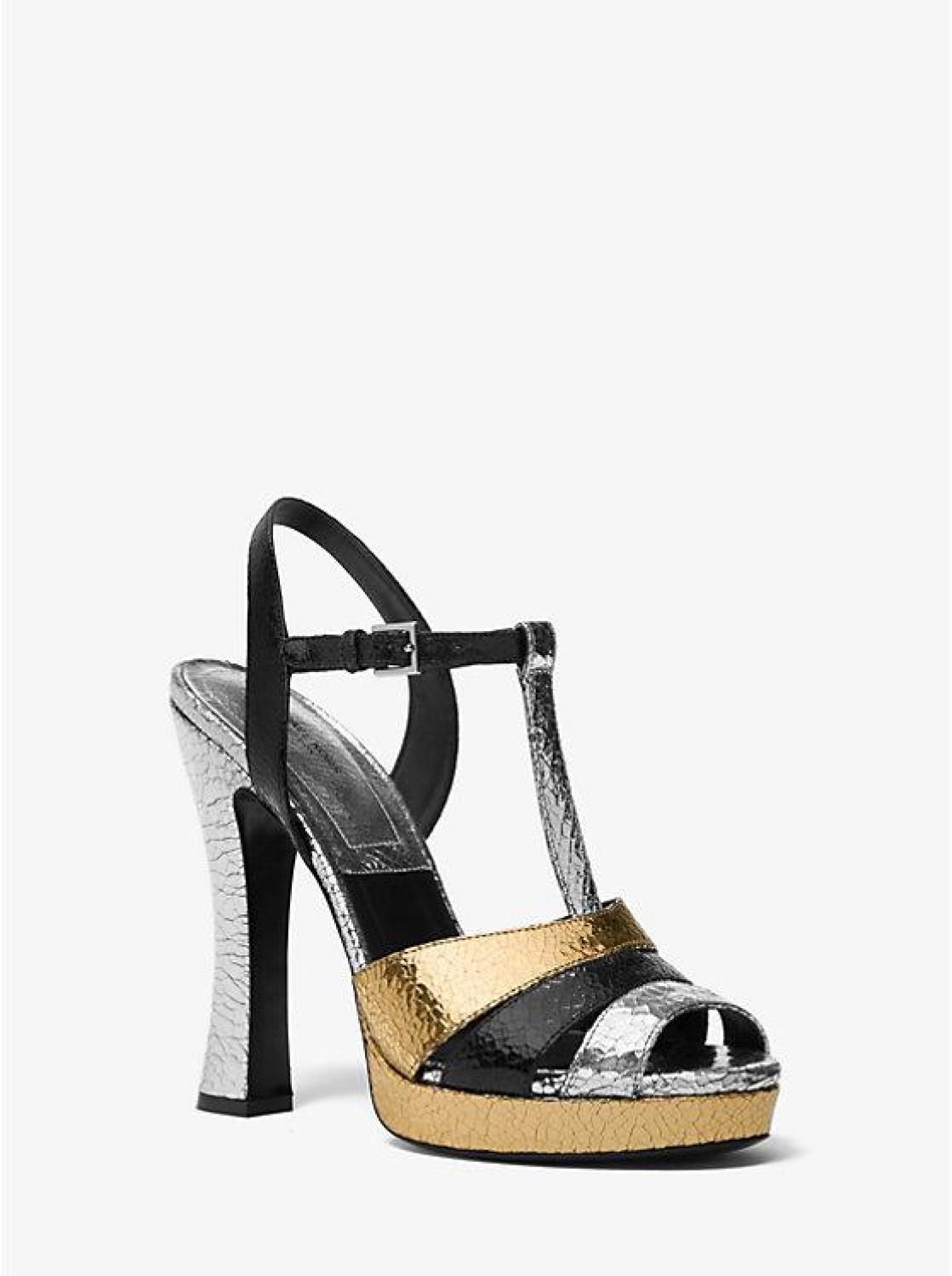 • The Rosanna platform sandals are designed from tri-color calf leather with a crackled finish for tactile glamour. Set on a towering heel, this T-strap silhouette will add an extravagant finish to myriad ensembles. Made in Italy.