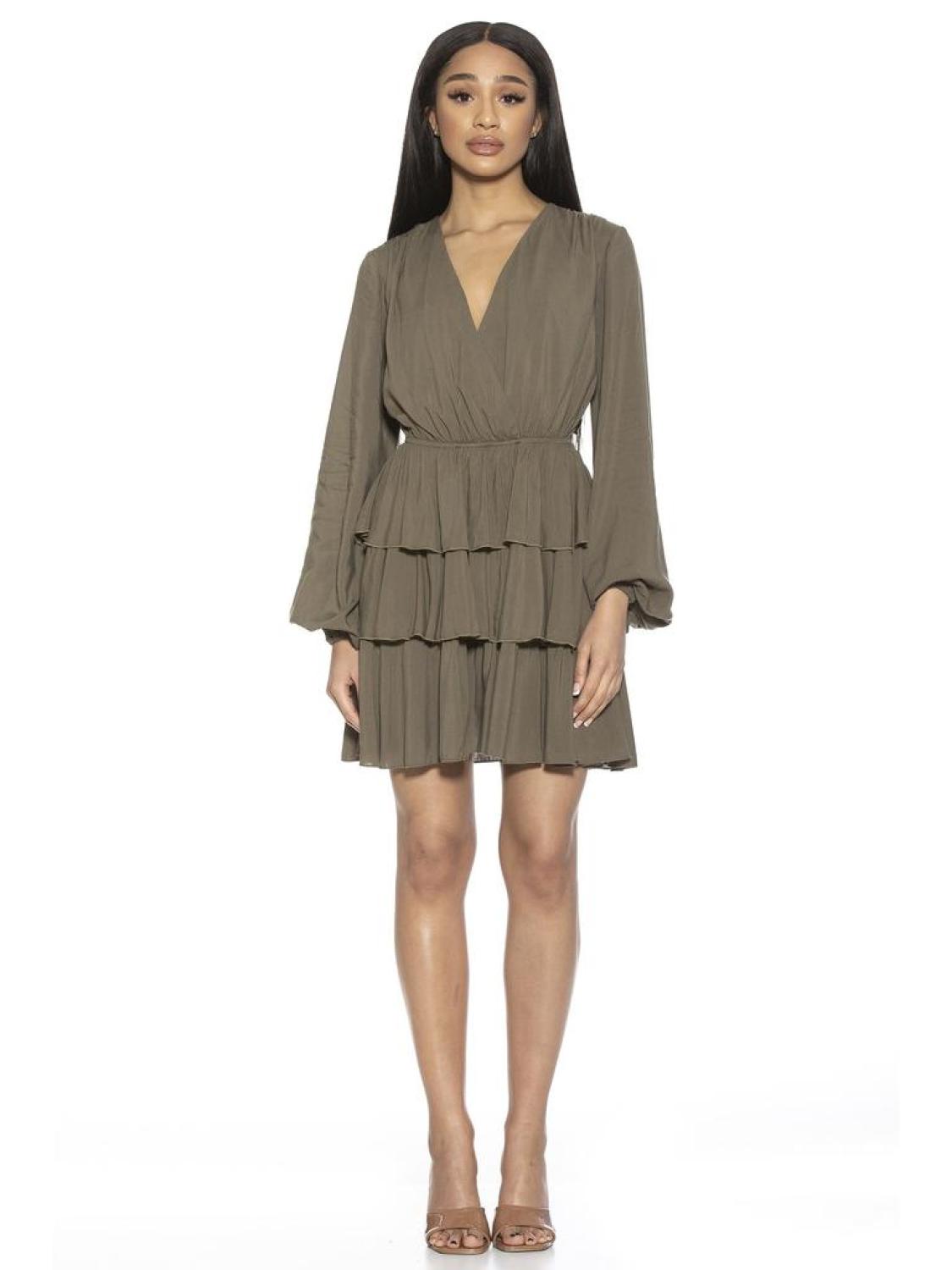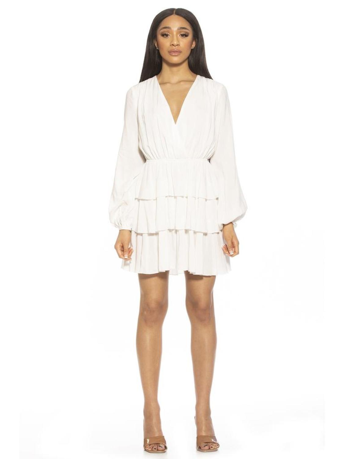• PRODUCT FEATURES 34 1/2" length Tiered Ruffles Plunge neck Long sleeves Open Back Buttoned back keyhole Tie back closure 100% Rayon Lined - 92% Polyester, 8% Spandex Machine wash Imported Style D3925