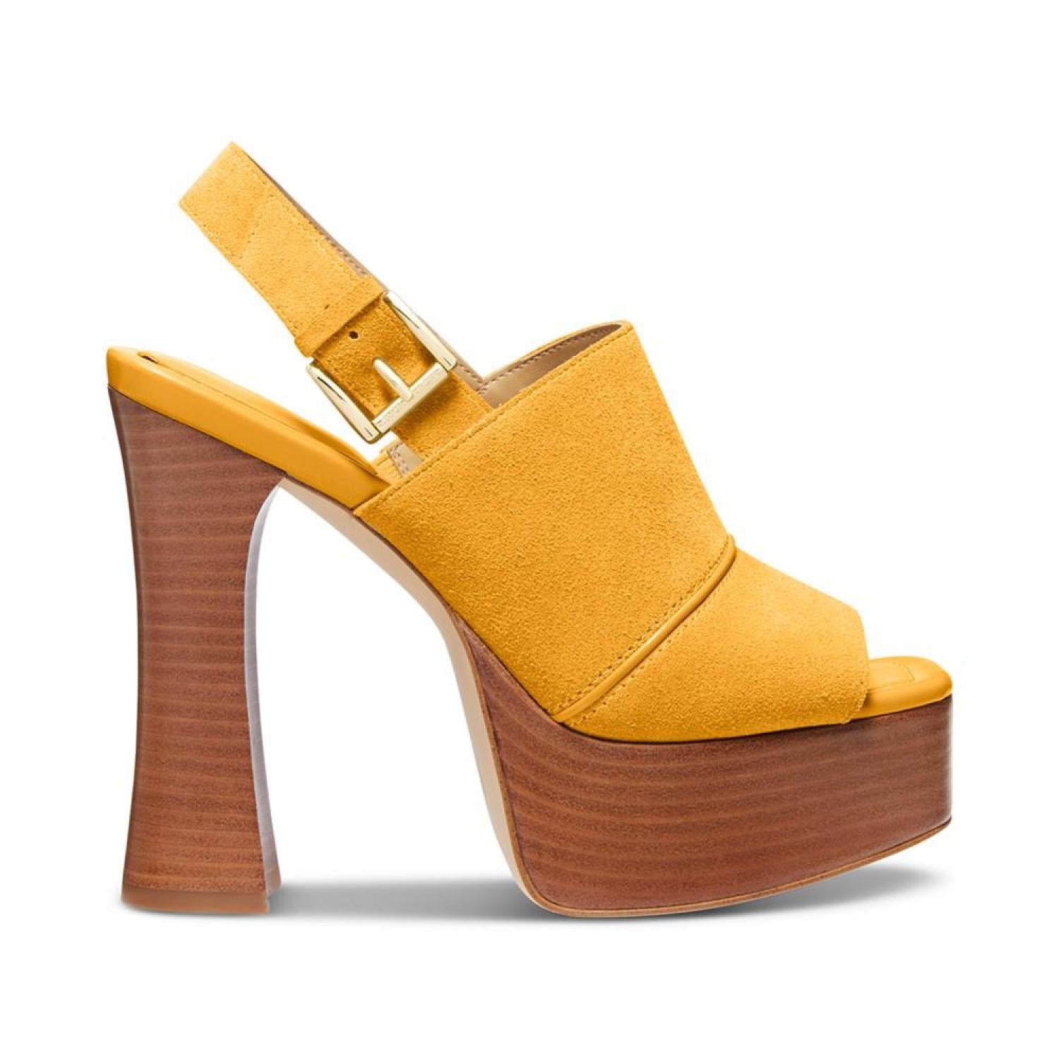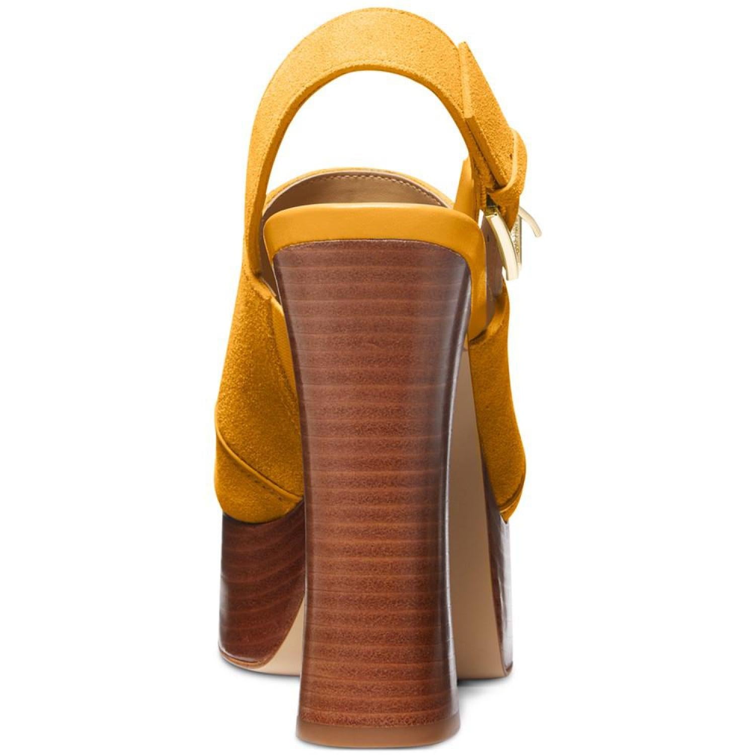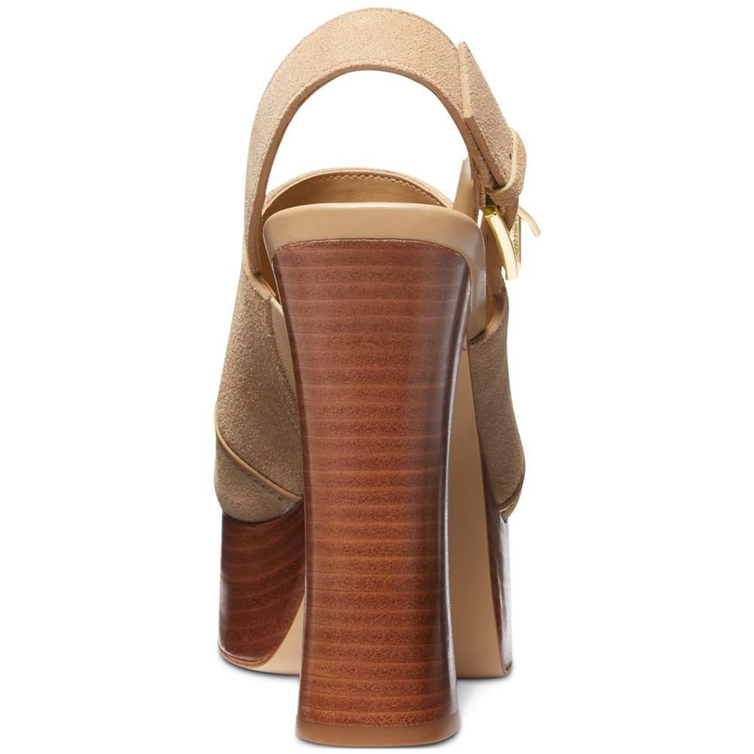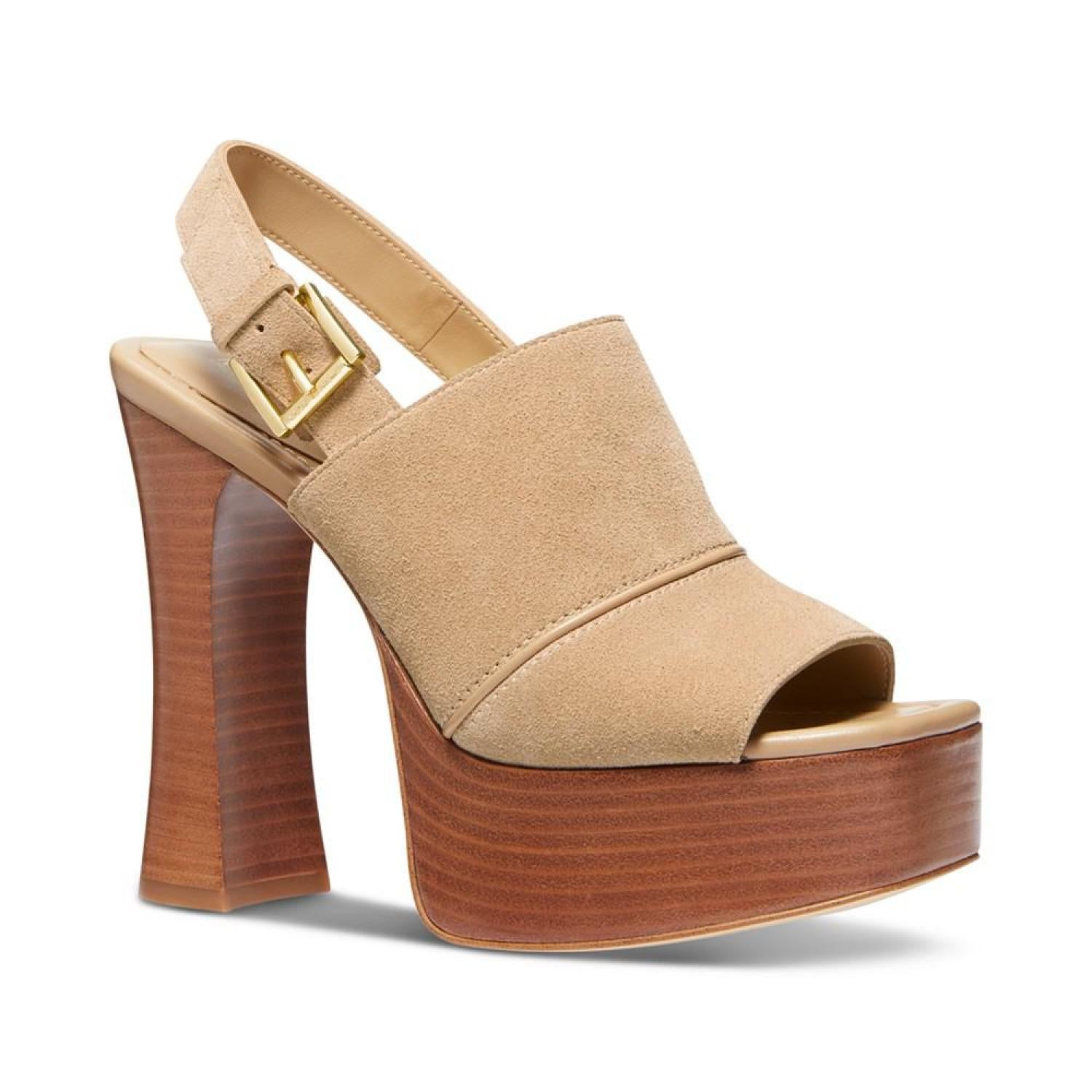 A perfect pairing for dressy skirts and cuffed jeans, shapely stacked heels and wood-like platforms elevate buckled slingbacks in the fashion-forward Rye sandals by MICHAEL Michael Kors. 5" stacked heel; 1-1/2" platform Open toe Slip on, buckled slingback strap Suede upper; manmade lining; rubber sole Imported