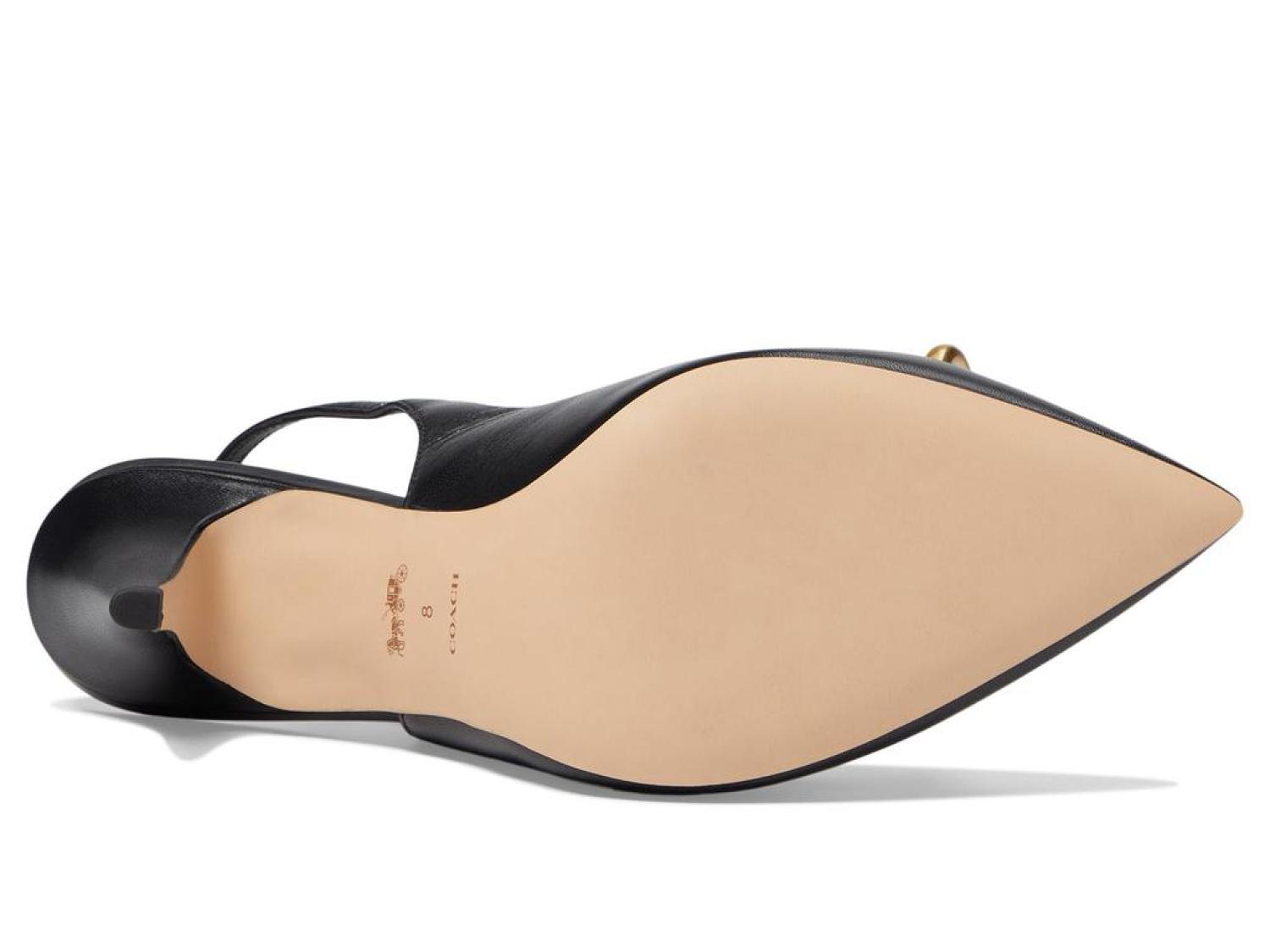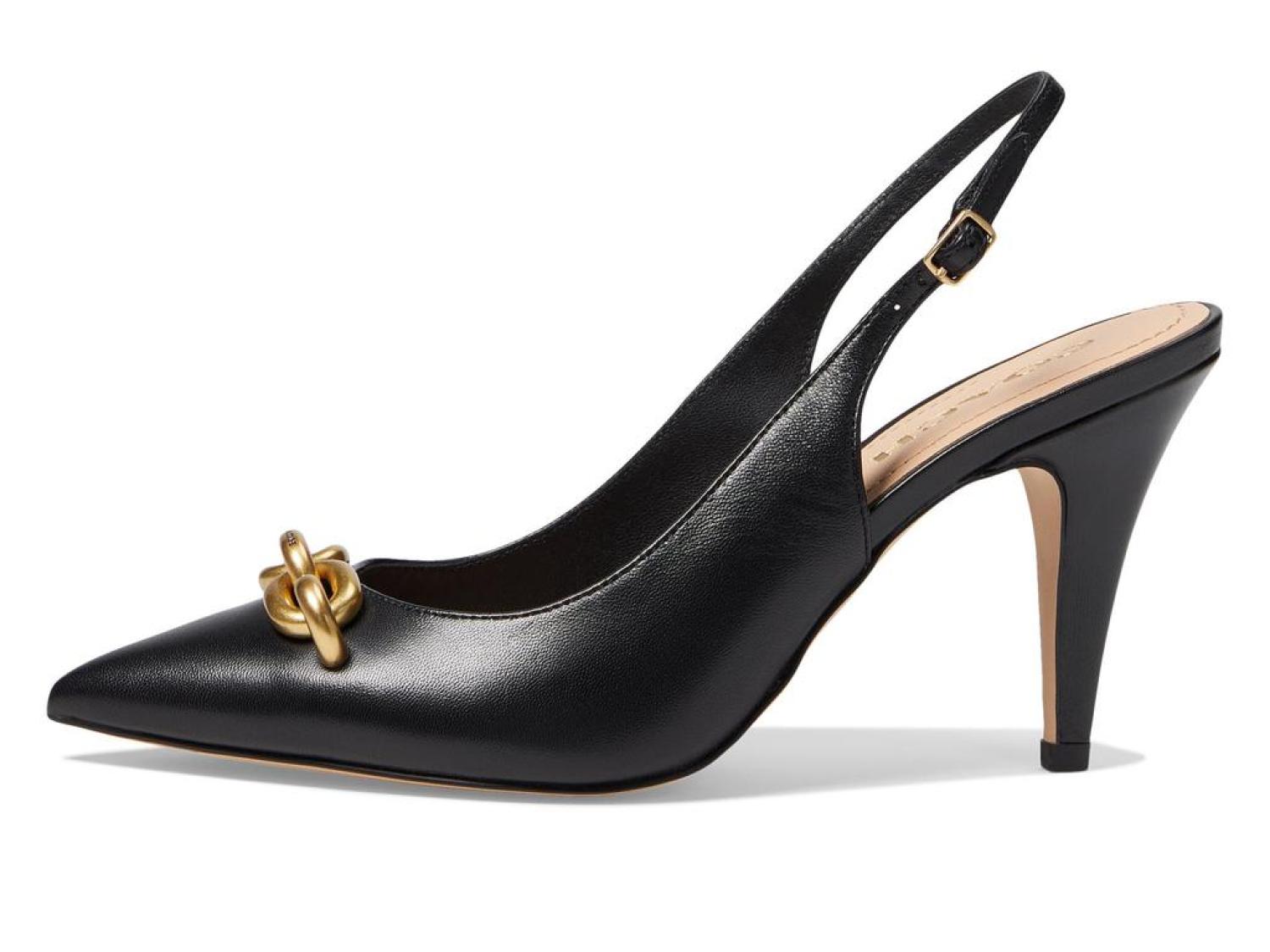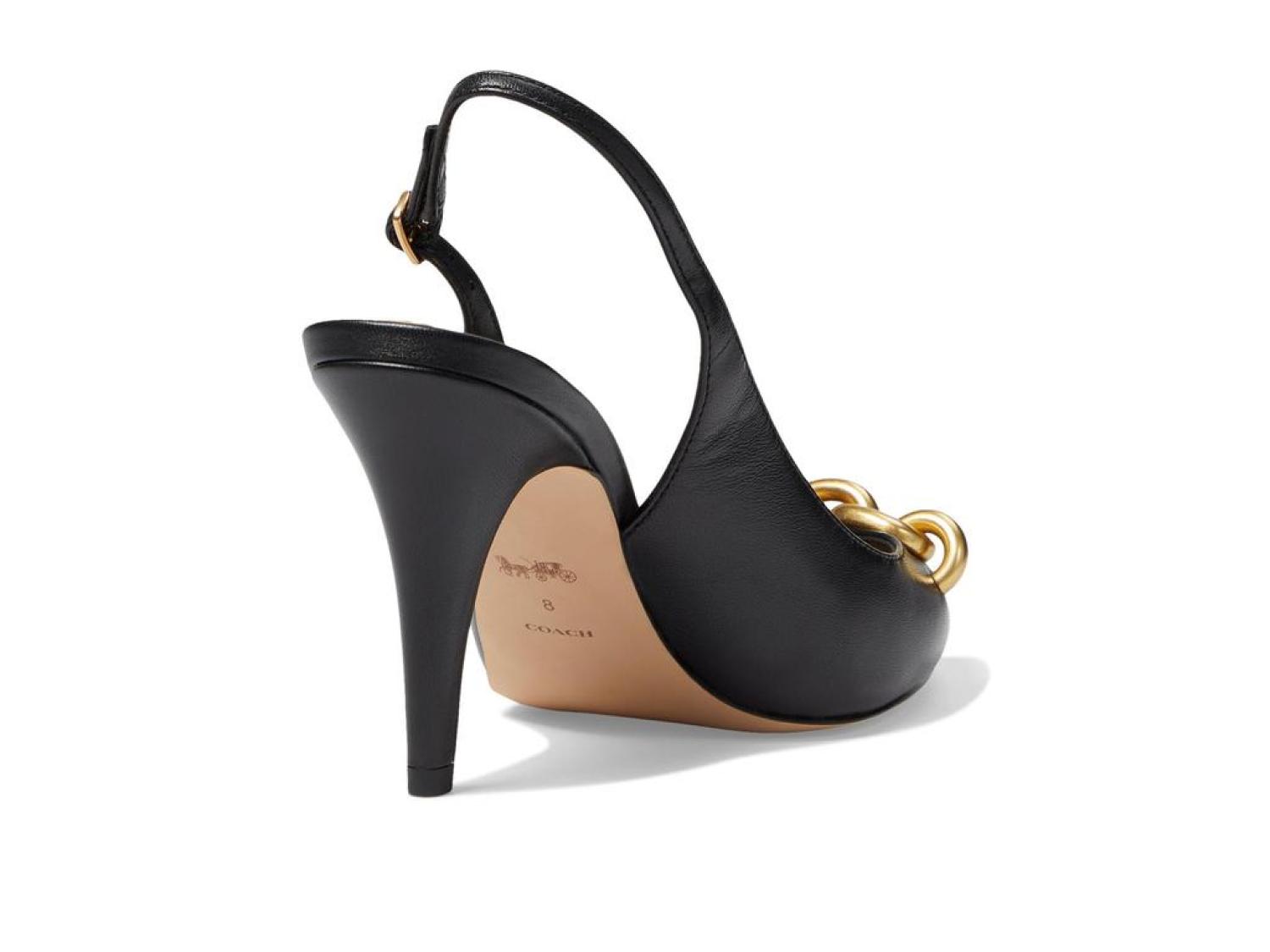 From business meetings to dinner dates, maintain your chic style effortlessly in the COACH® Sadie Leather Slingback Pump. Featuring an adjustable buckle closure slingback strap in a pointed toe silhouette with a chunky chain detail on the toe.