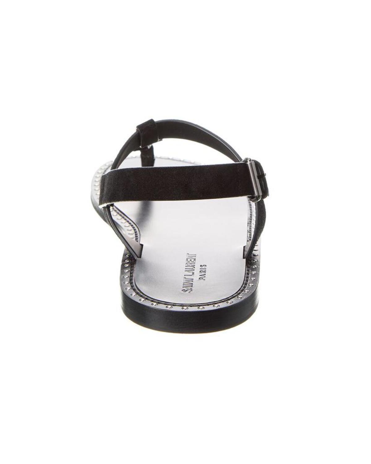 Introducing the Saint Laurent Cassandra Suede Sandal - the epitome of iconic, modern glam. Crafted from luxurious black suede and silver-tone hardware with monogram accents and stud embellishments, these sandals are the perfect addition to any discerning gentleman's wardrobe. The adjustable ankle strap with buckle closure ensures a secure fit, while the smooth leather insole provides all-day comfort. Made in Italy with unparalleled attention to detail, these sandals are a true testament to the craftsmanship of the brand. Please note that size selections are European - for US conversions, please reference the size chart. Based on feedback from members, this brand typically runs small, so we suggest sizing up a half size for most styles. Our products are 100% genuine, and in some cases, we purchase merchandise from trusted independent suppliers and not directly from the brand owner. In all cases, we stand by the authenticity of every product sold on our site. Elevate your style and step out in confidence with the Saint Laurent Cassandra Suede Sandal - tres chic.