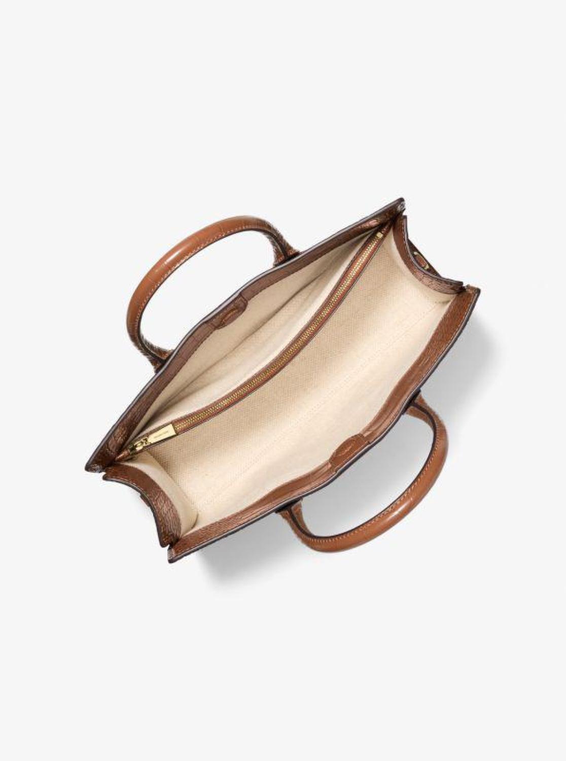 • It’s easy to see why the Scarlett satchel is the forever bag you’ll return to season after season. This carryall is crafted from glossy crocodile-embossed leather and boasts a canvas lined interior with a large zip pocket for storing small valuables. Attach the crossbody strap when you want to go hands-free.