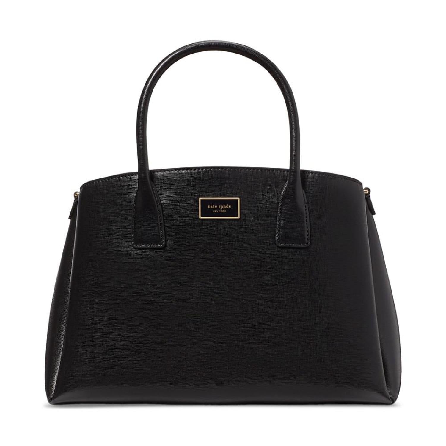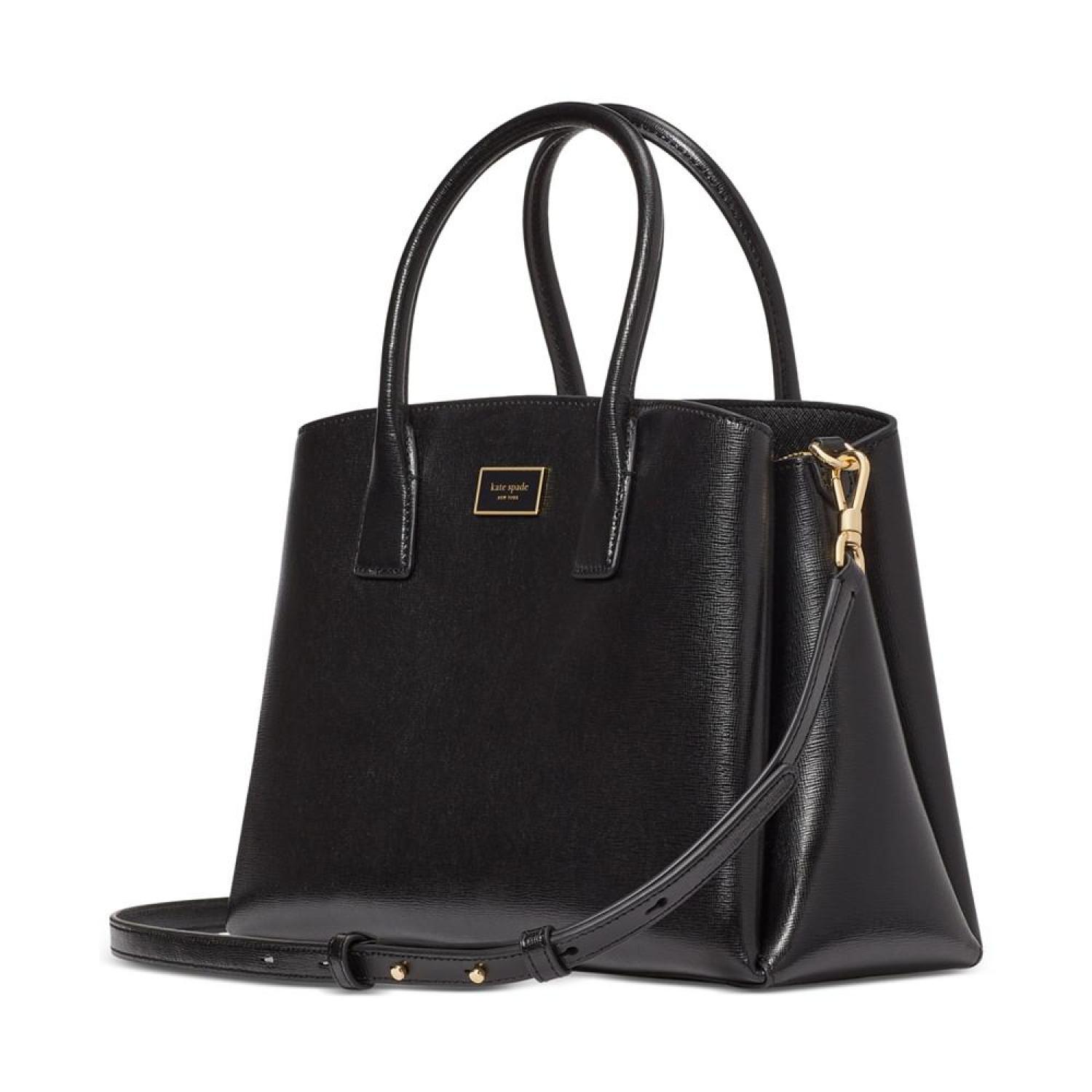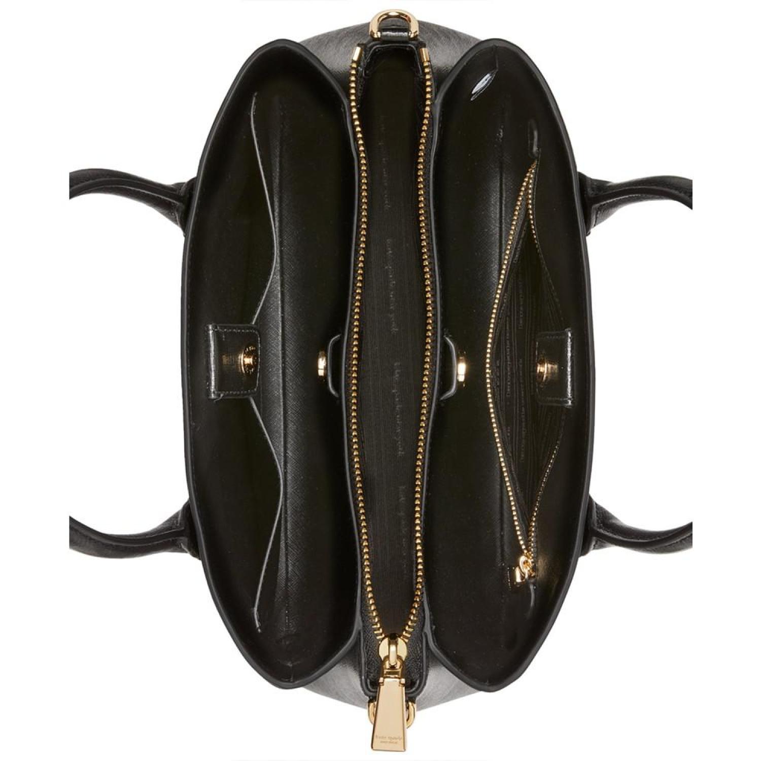• Crafted in a classic silhouette, this leather satchel by Kate Spade New York opens up to an interior capable of keeping you organized with a center zip compartment and snap compartments at the front and back. Grab it by the handles or attach the strap to go handsfree.