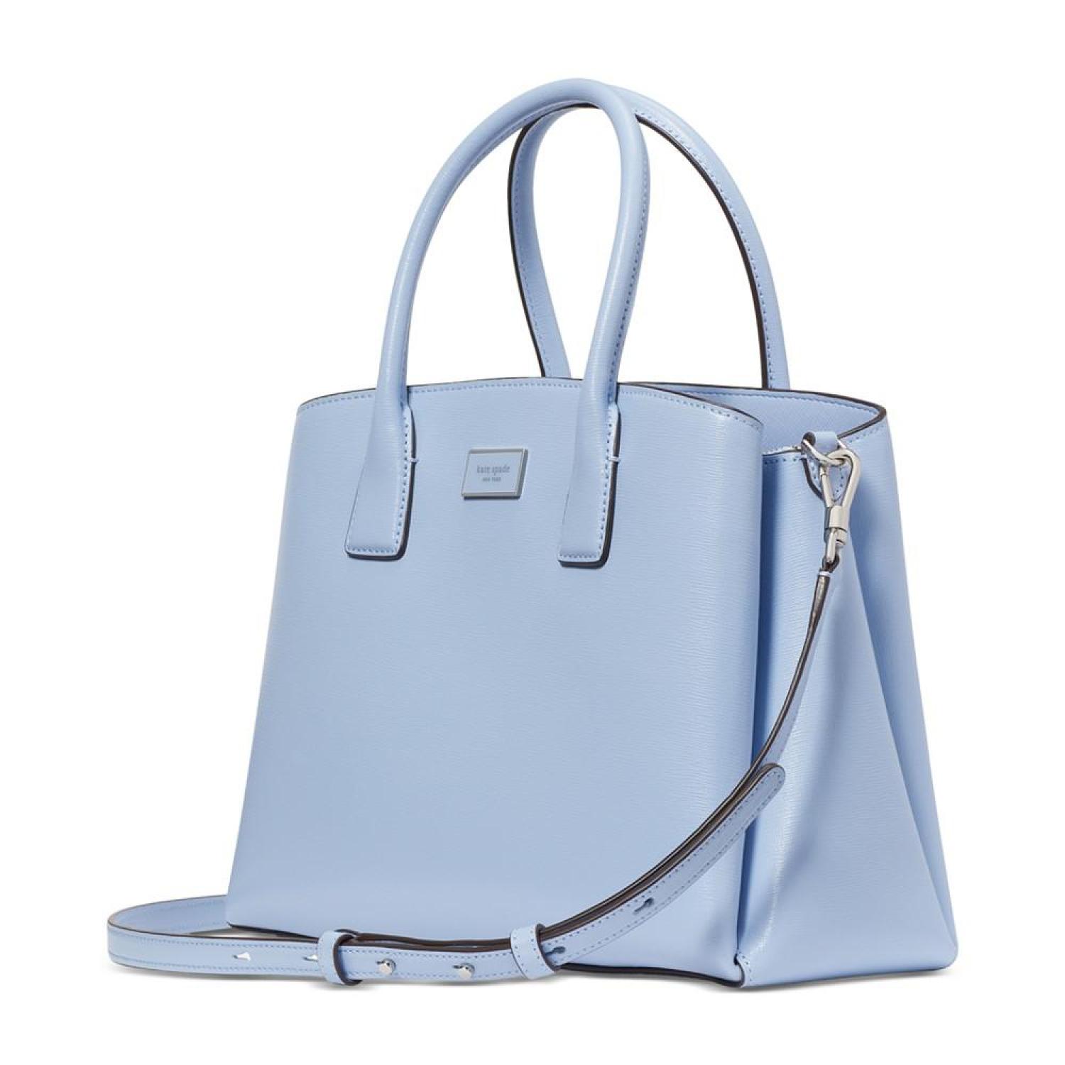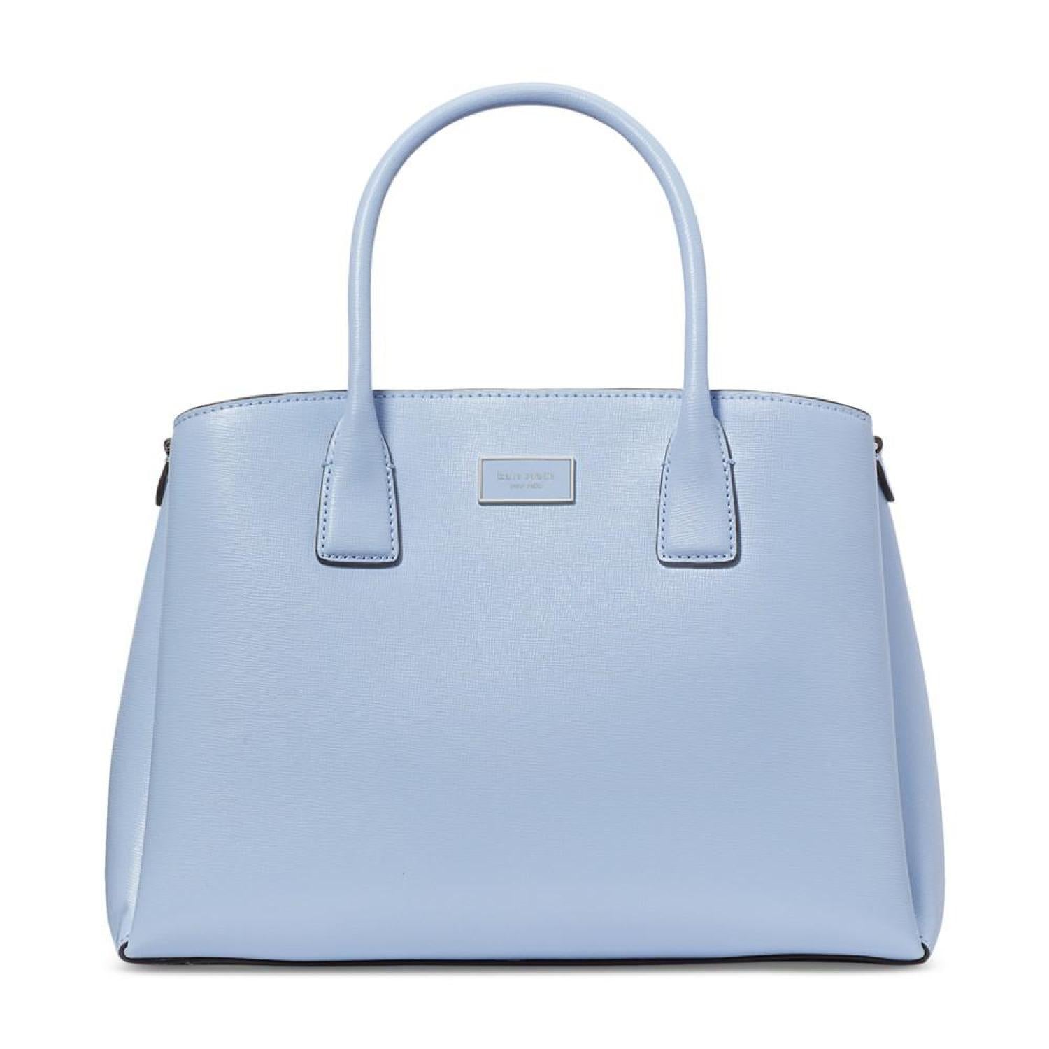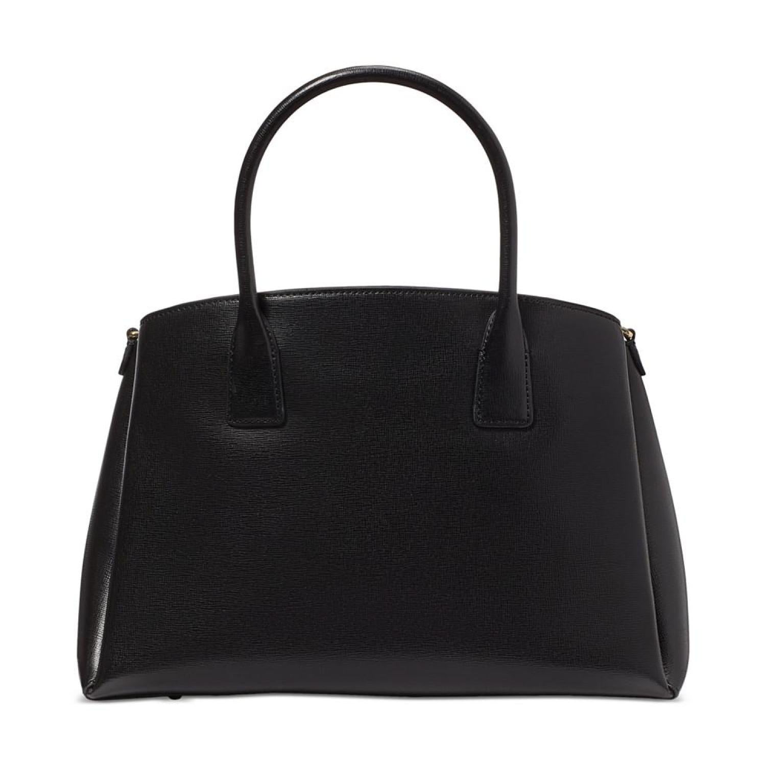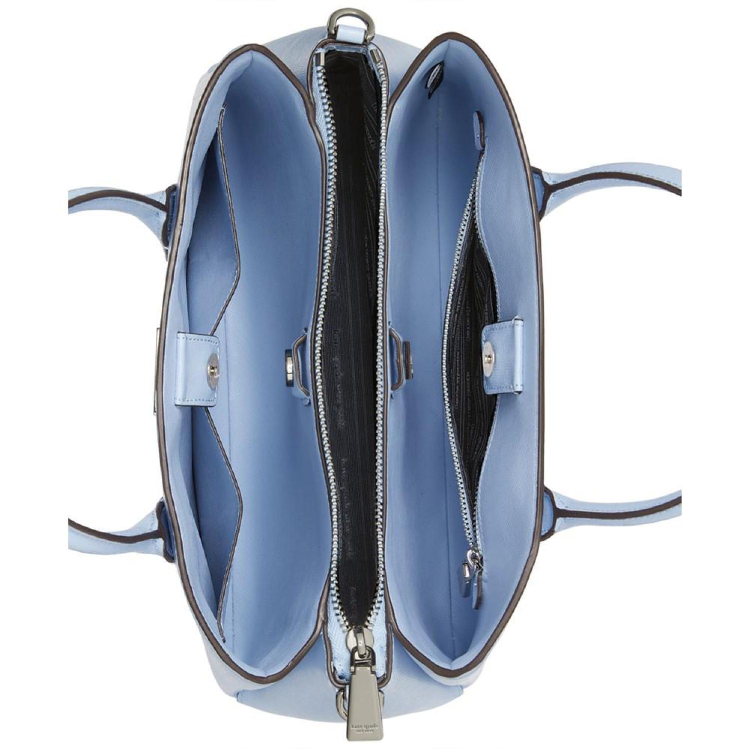 • Crafted in a classic silhouette, this leather satchel by Kate Spade New York opens up to an interior capable of keeping you organized with a center zip compartment and snap compartments at the front and back. Grab it by the handles or attach the strap to go handsfree.