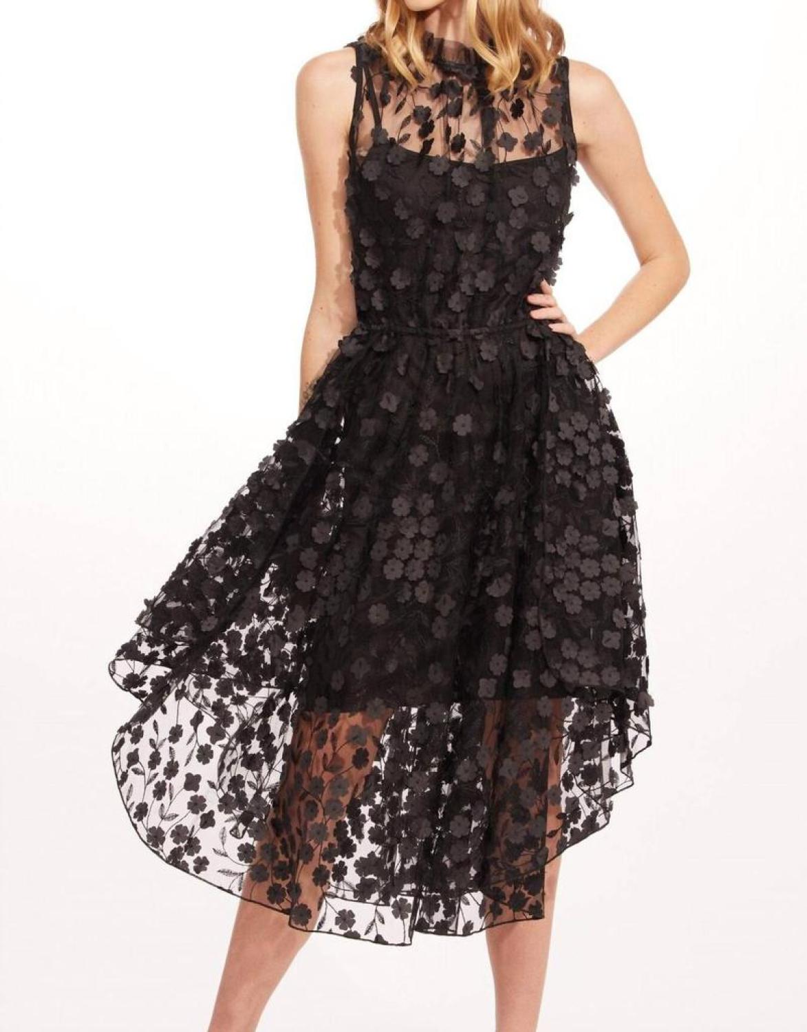 • Just add slides or mules and you are good to go.Not just another little black dress! This pitch petal fabric adds stunning texture with it's 3-dimensional monochromatic petals. A sheer shell with matching cami dress lining. Sleeveless. Mockneck. Cinched elastic waist . Pullover styling. Rear neck button closure. 100% Polyester. Lining - 100% polyester