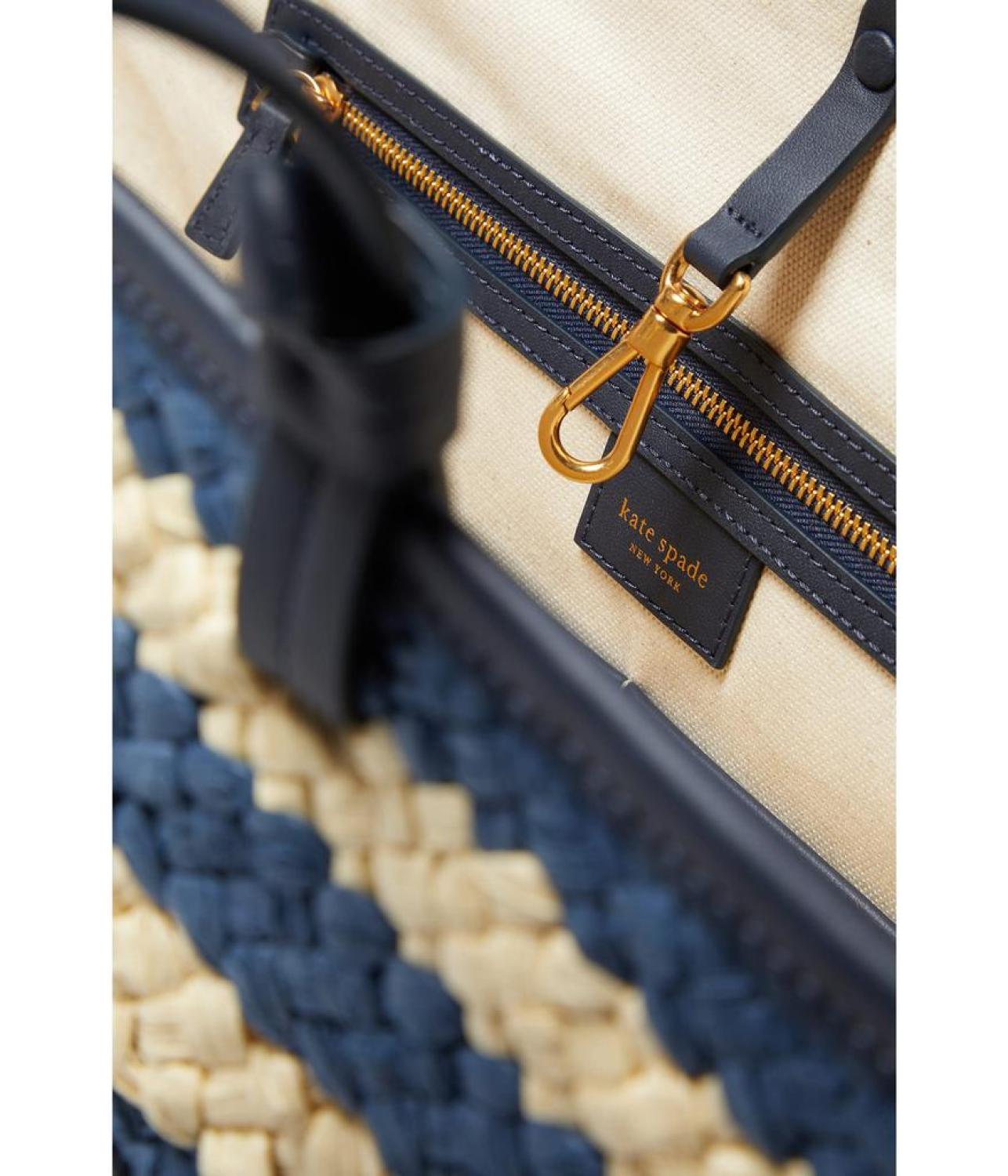 Spruce up your sunny day style by carrying the Kate Spade New York® Shore Thing Dragonfly Embellished Striped Straw Large Tote which has got plenty of room for holding your bare essentials. Sparkling dragonfly-embellished, striped straw construction with leather trim. Open top design with a dog-clip closure. Spacious interior compartment with one zippered pocket and one slip pocket. Dual top handles. Logo plaque on the front. Canvas lining. Imported. Please note, the hardware color and interior lining may differ from the color shown in the photo.