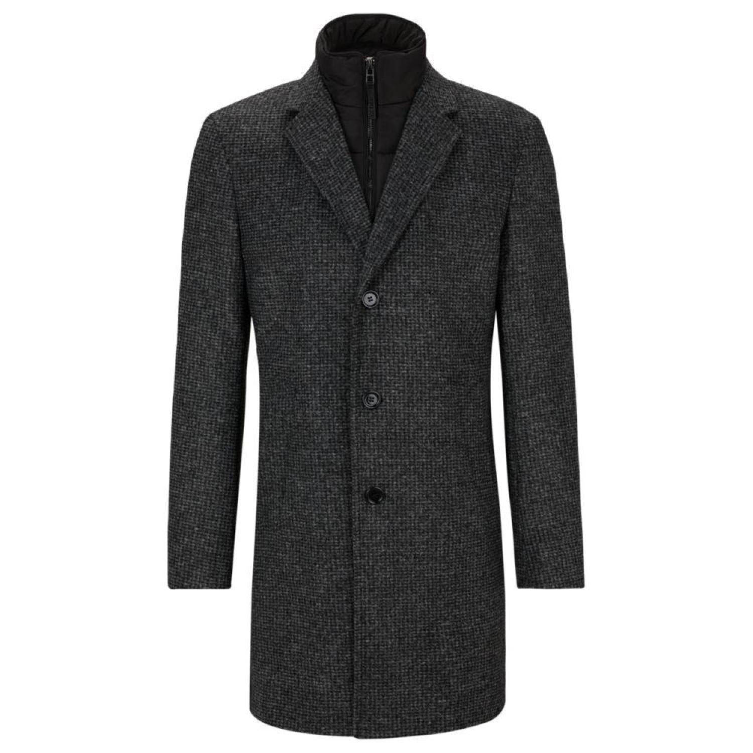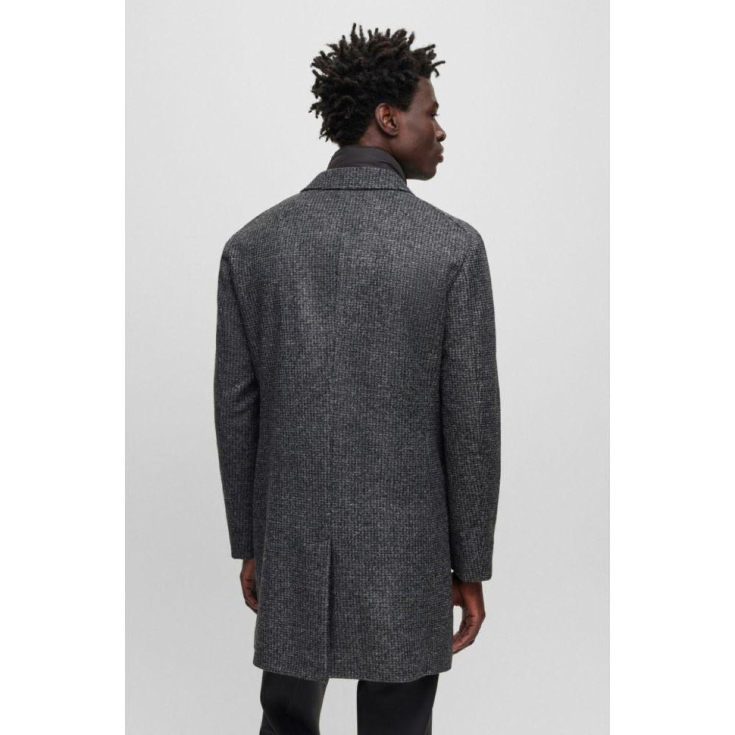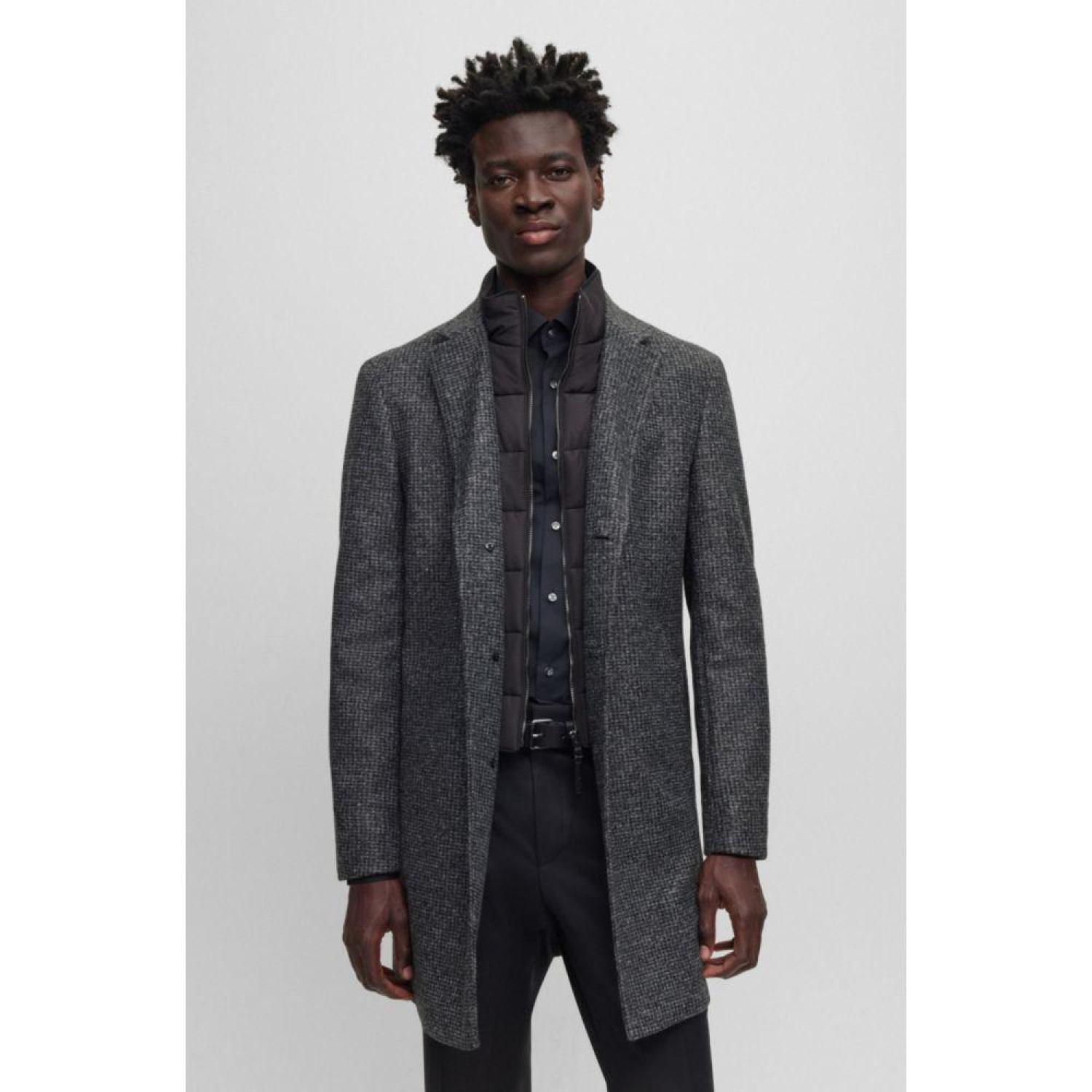 A patterned coat cut to a slim fit, blended with virgin wool and designed with a zip-up inner by BOSS Menswear.