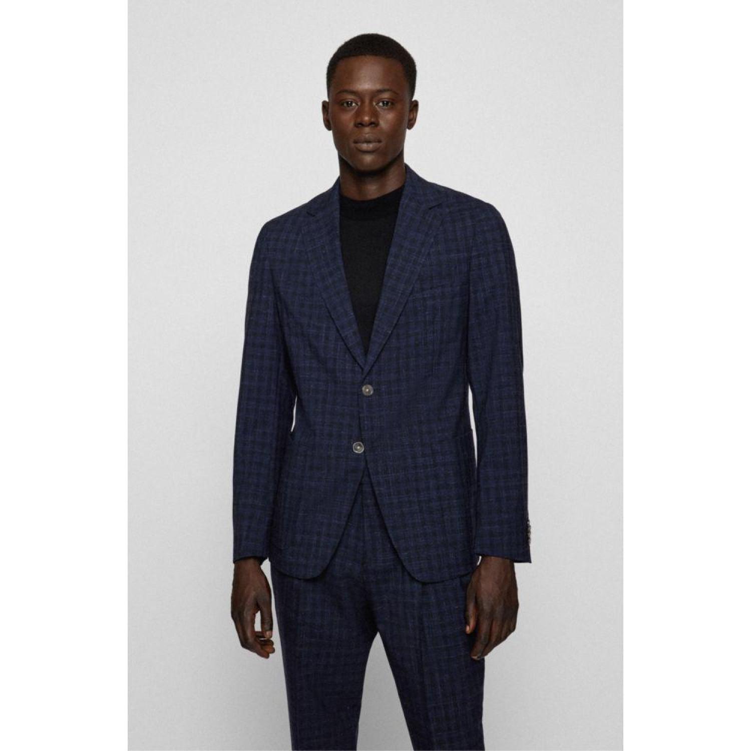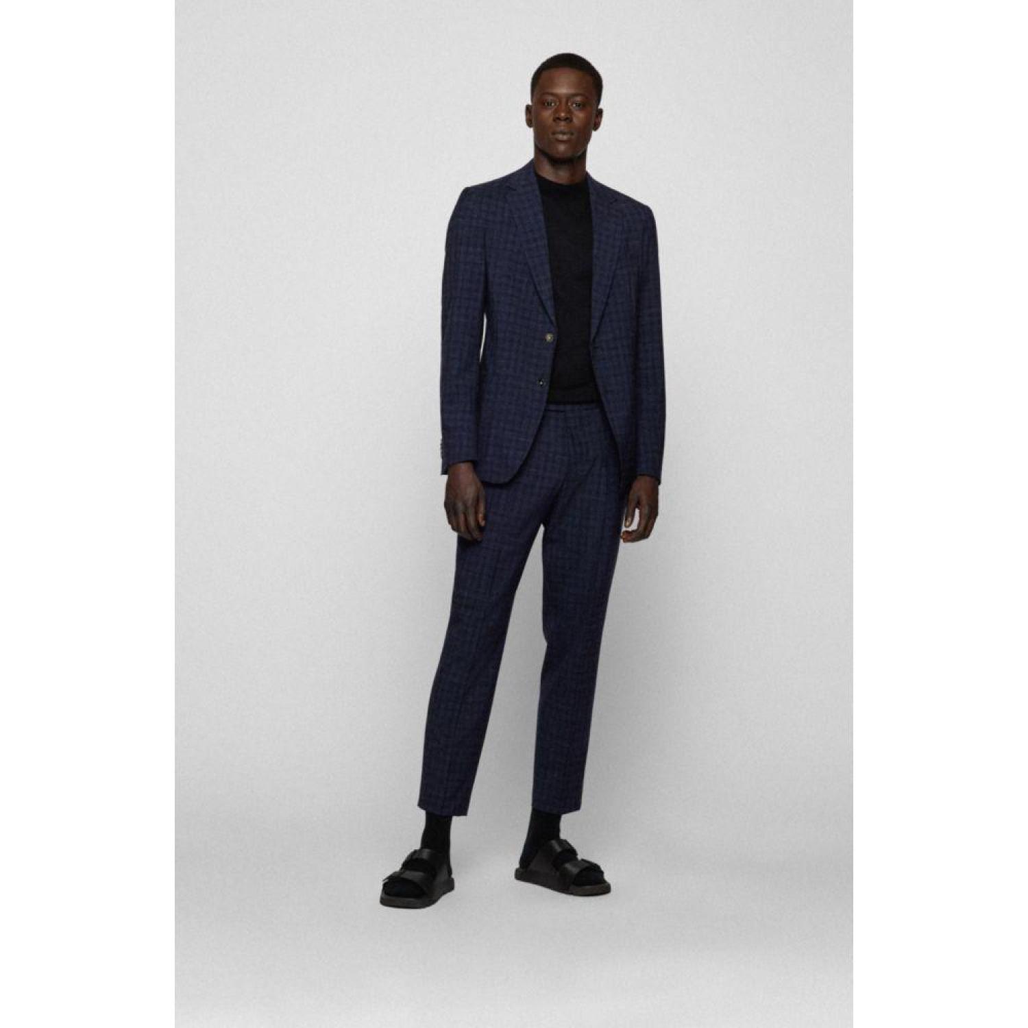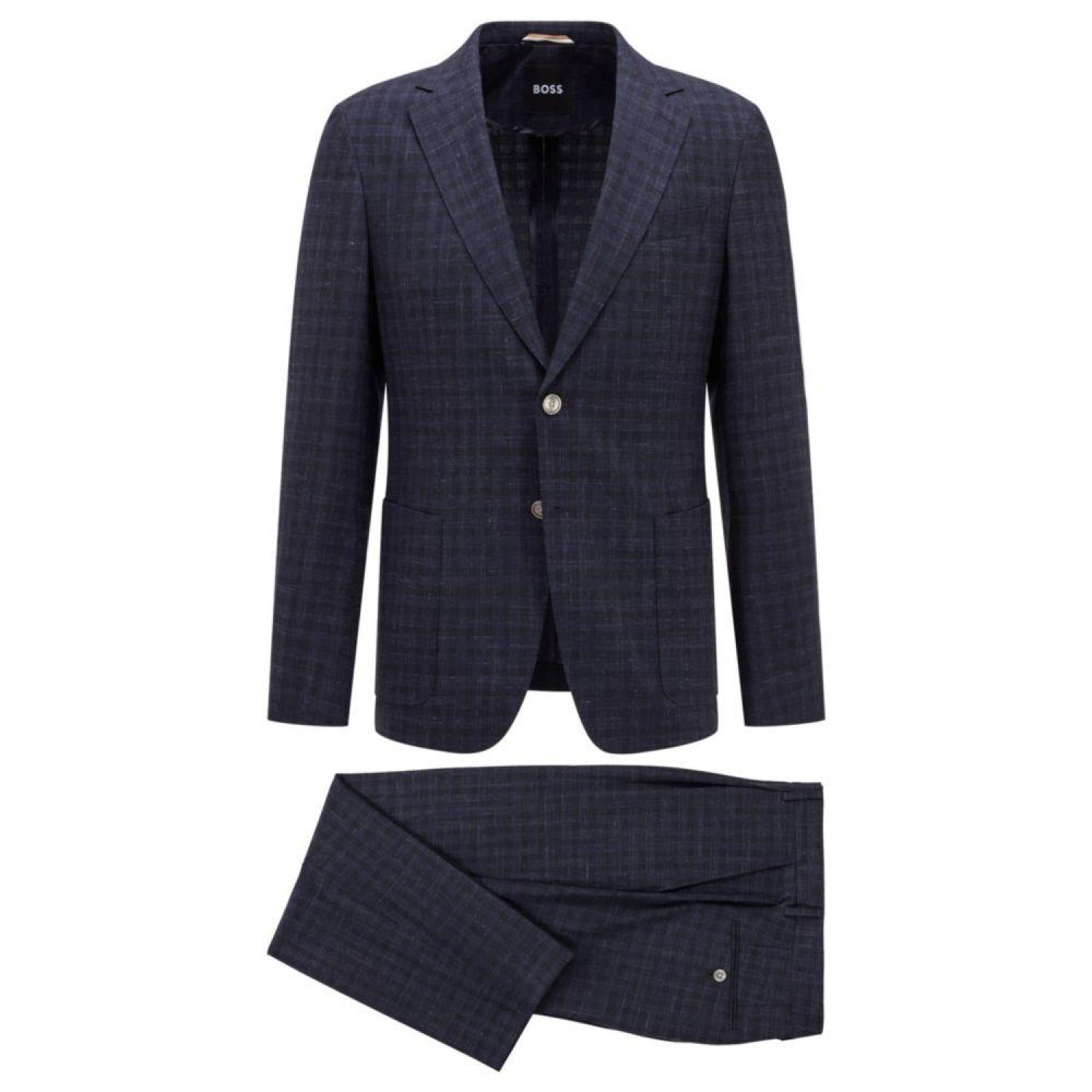 • A slim-fitting suit by BOSS Menswear. Blended with linen for a cooling and breathable feel, this two-piece suit is tailored to a streamlined fit and patterned with a contemporary check. For our RESPONSIBLE products, we always use at least 60% more sustainable raw materials. This garment is made from at least 60% responsible and certified wool. At HUGO BOSS, responsible wool means it meets the standards of the Five Freedoms of animal welfare.
