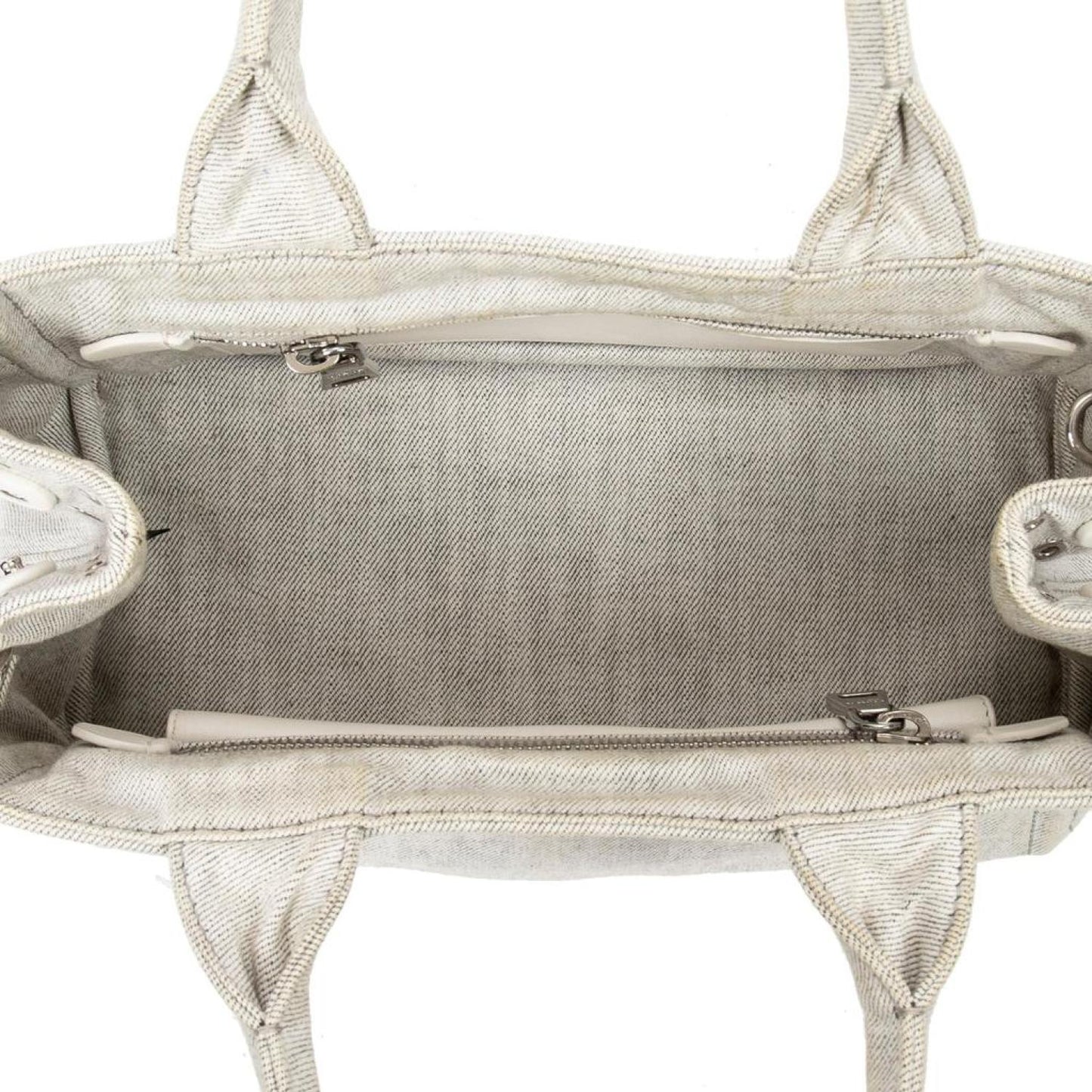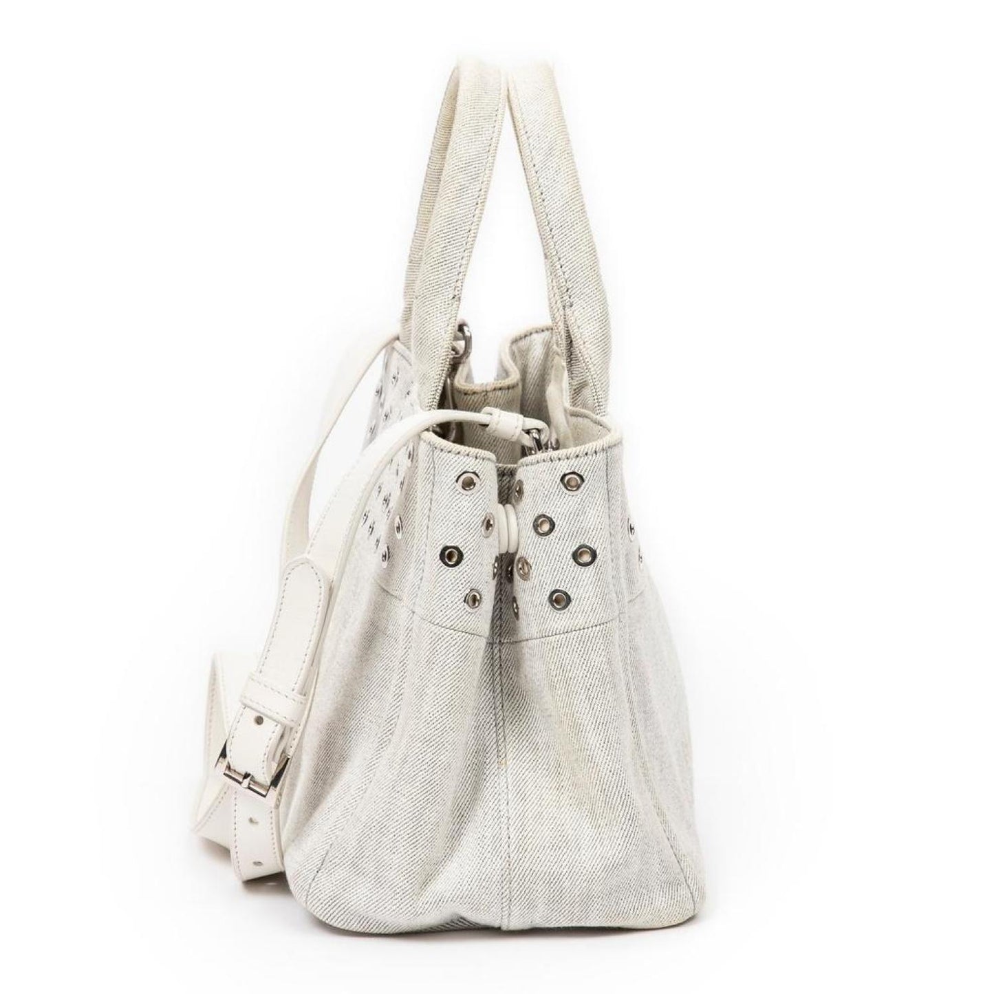 • Prada Shoulder Bag in Ivory Studded Denim Canvas and Silver hardware. Dimensions - 28*18*15cm. Serial number - 1BG439. Inclusions - ""card, strap, dustbag".