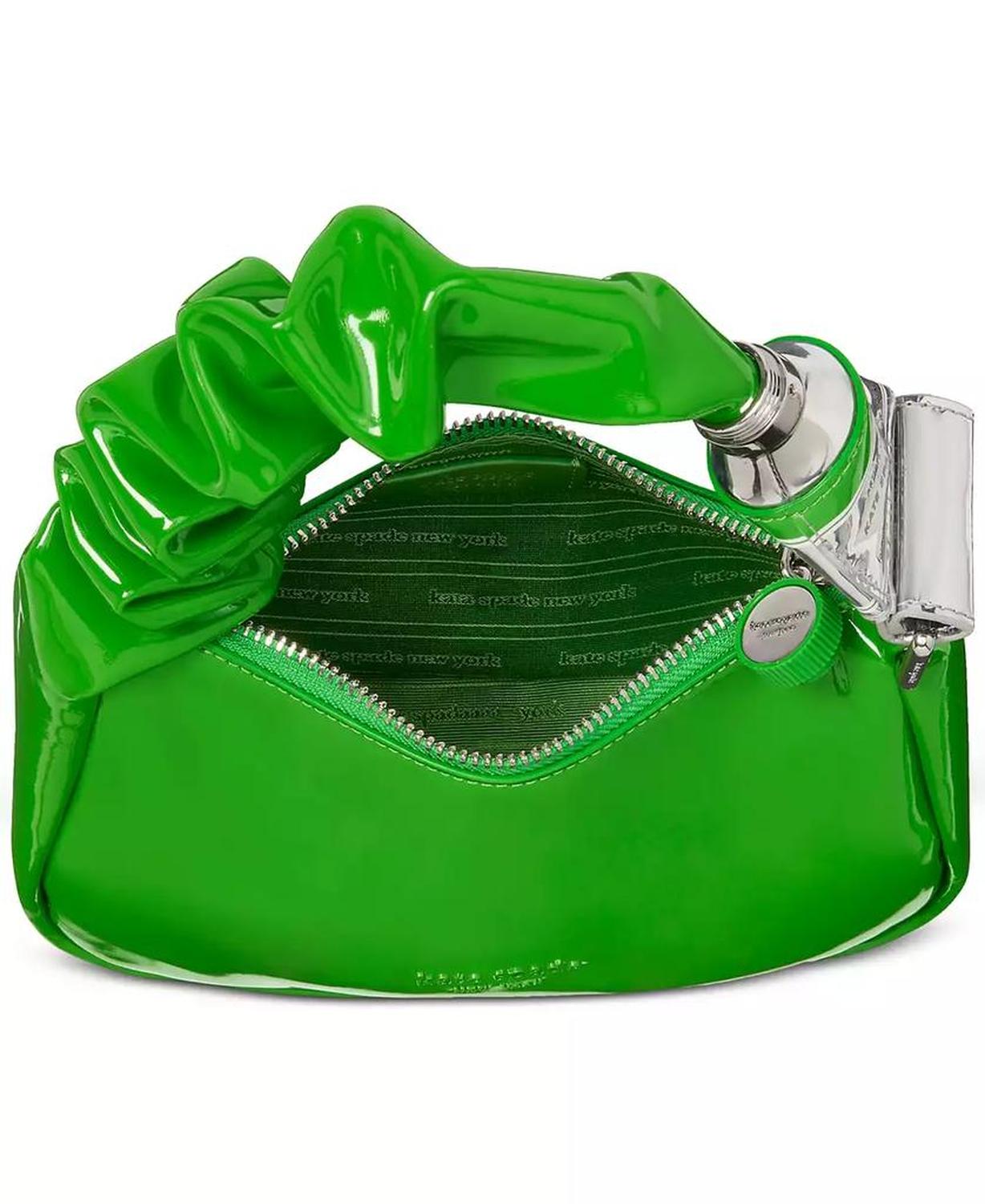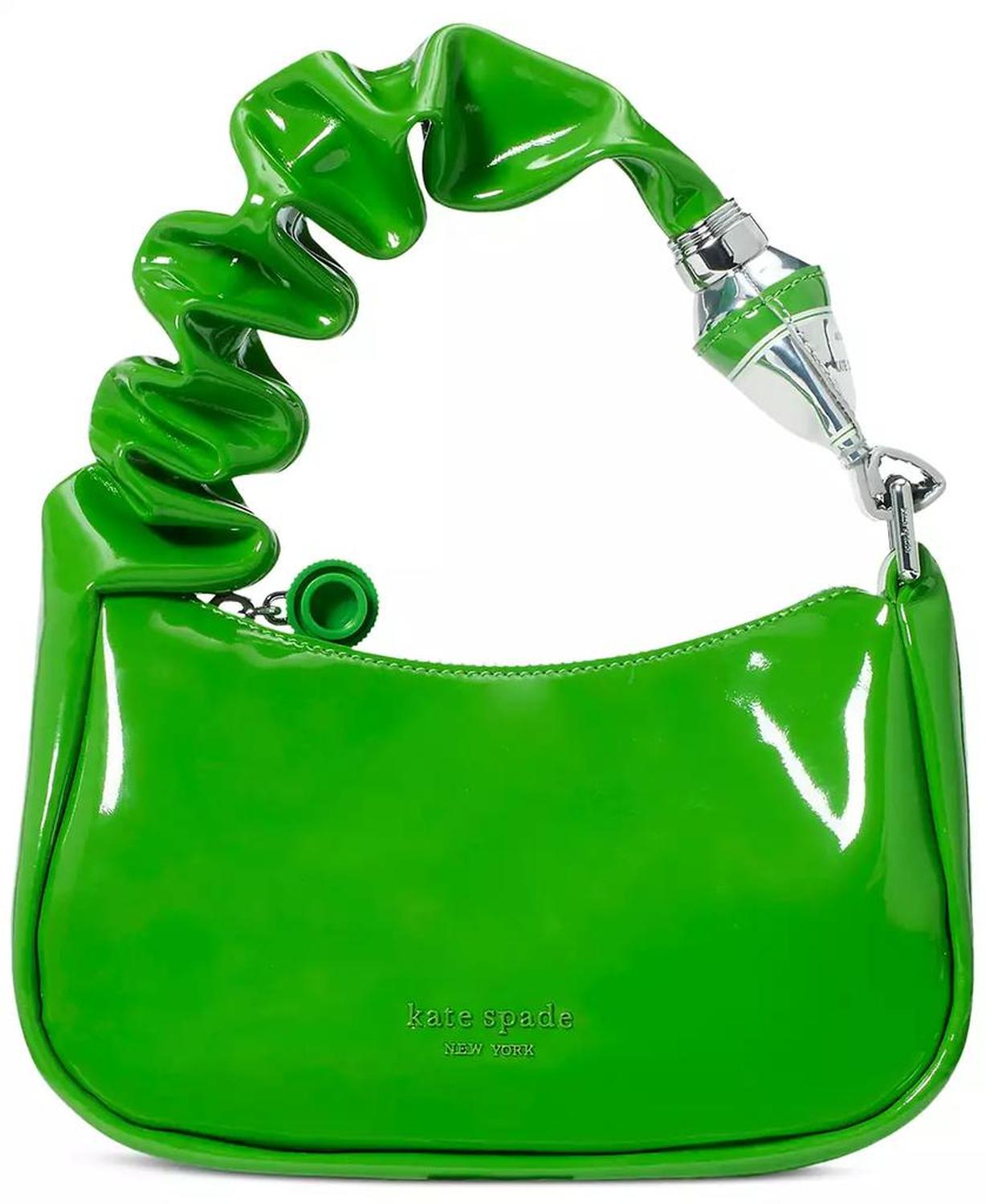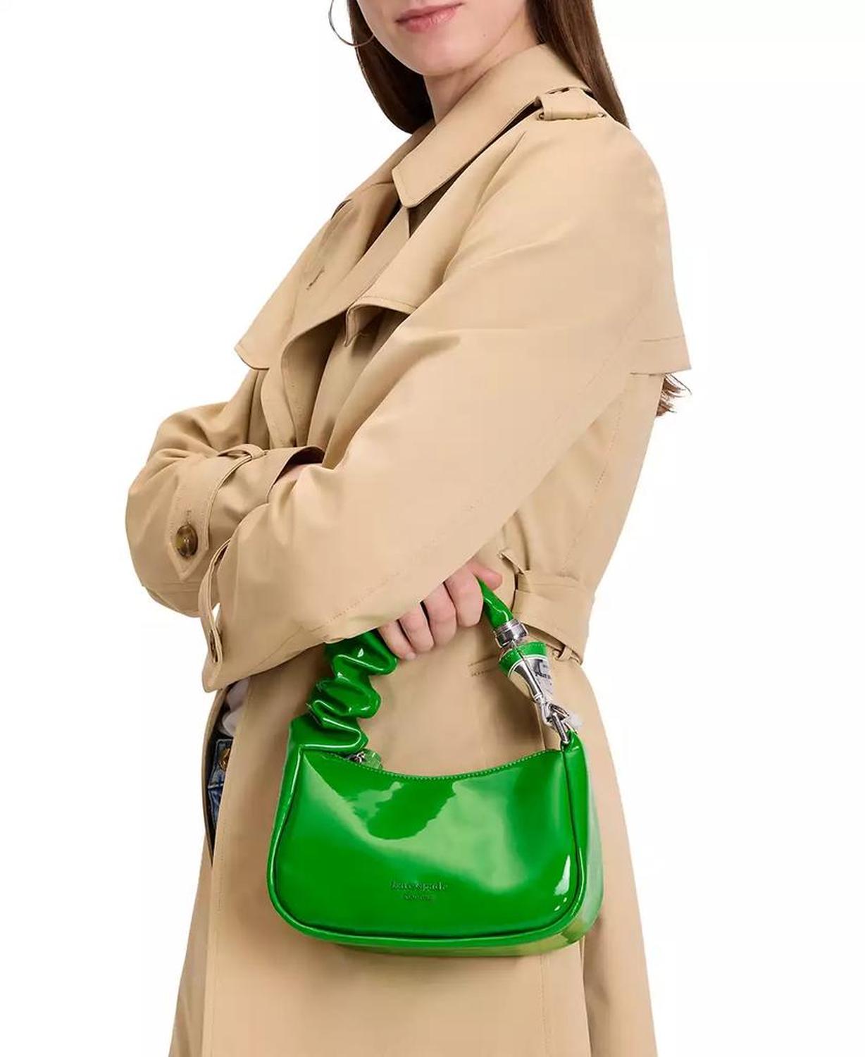 The Squeeze collection satchel from kate spade new york is crafted with a glossy material that exudes an aura of luxury, while the ruched handle adds a touch of originality and grace. Small-sized bag; 10-2/3"W x 8-1/4"H x 3-1/2"D (width is measured across the bottom of handbag); 1 lb. approx. weight Silhouette is based on 5'9" model 4" L squeezed handle Zip closure Silver-tone exterior hardware Lined 100% patent polyurethane Spot clean Imported