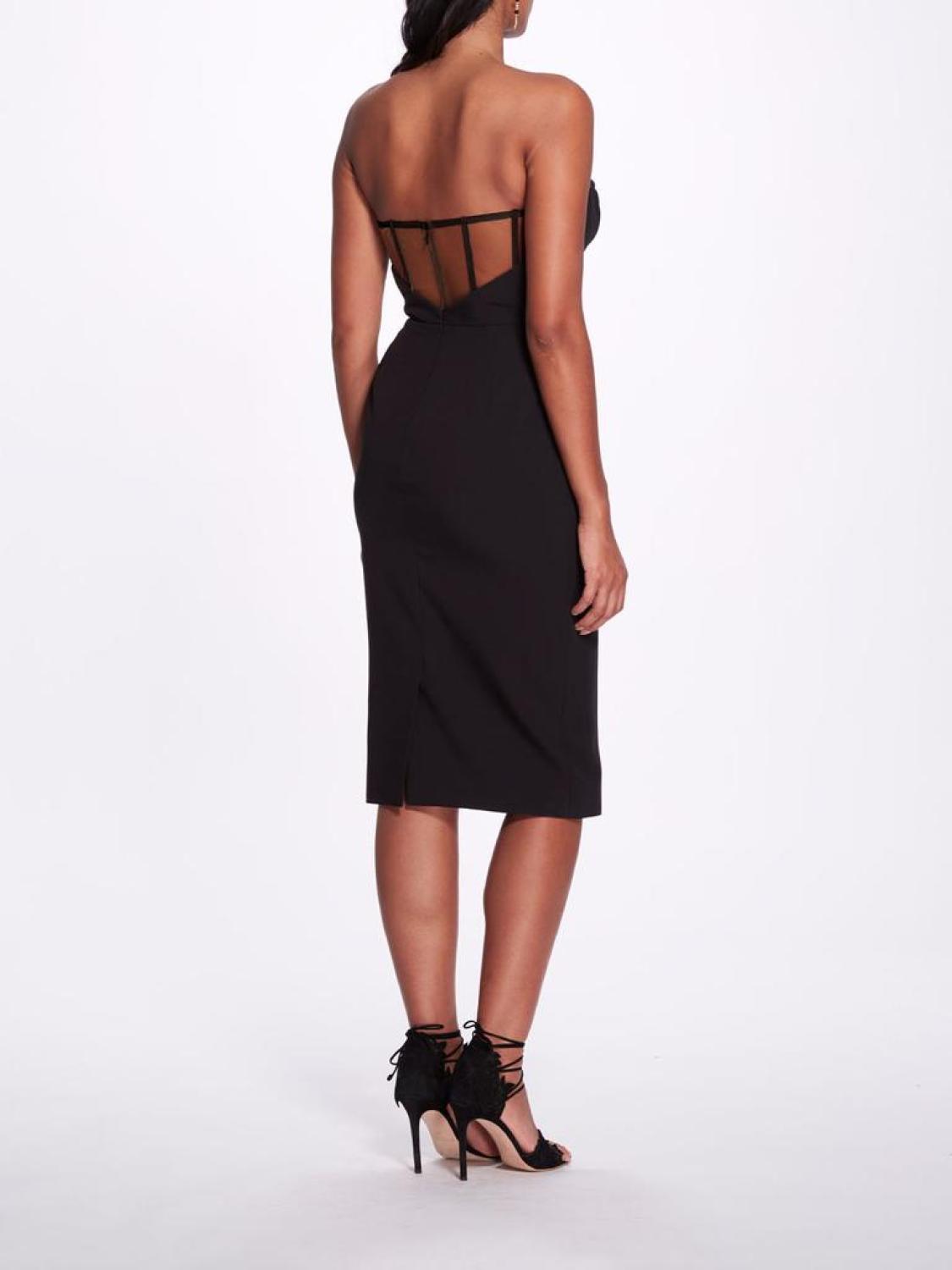 • The epitome of sultry, this slimming mini dress in black features a knee-length bodycon silhouette, a sweetheart neckline, and sheer back panel with boning for a romantic and alluring feel. Model is wearing size US 4.