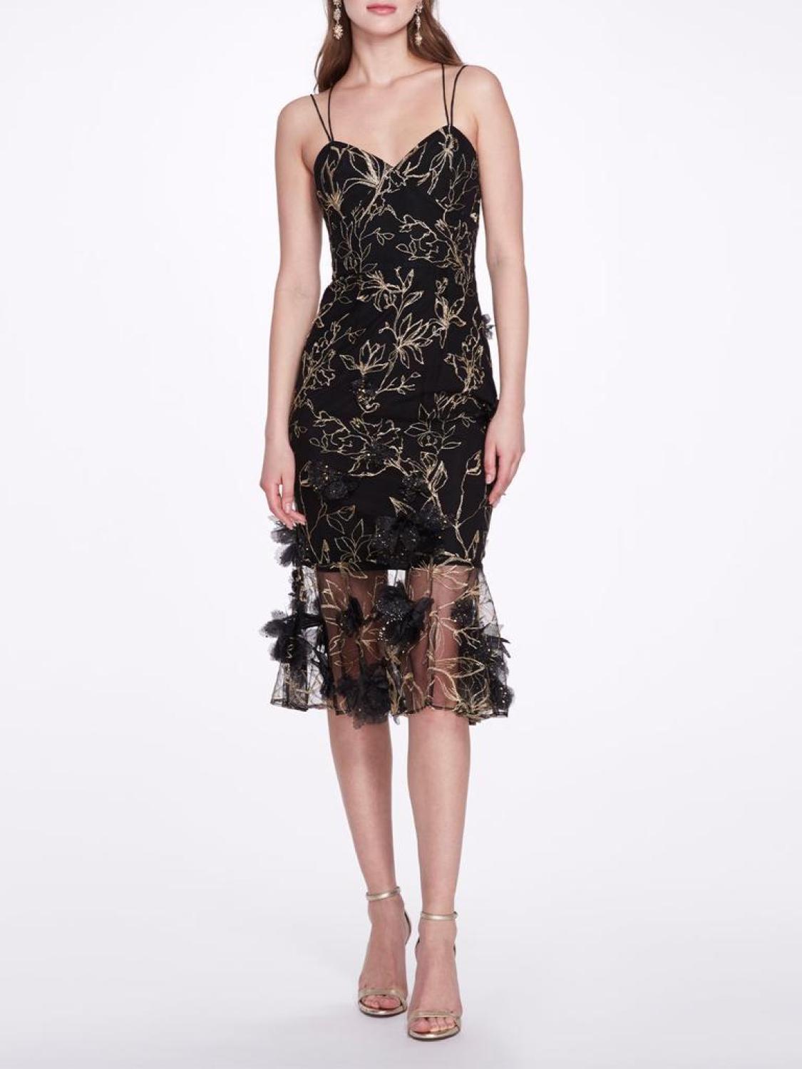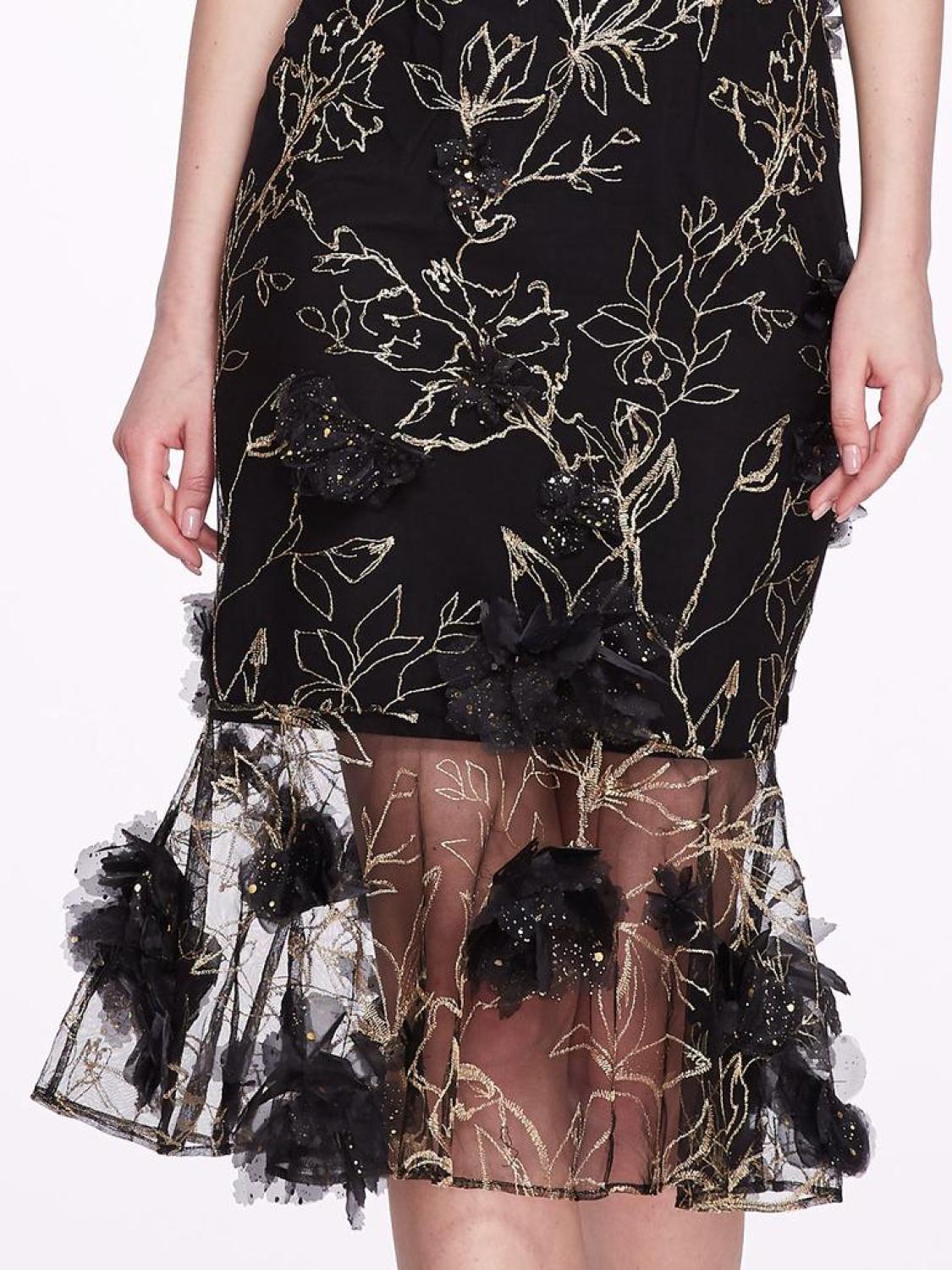 The personification of elegance, this midi-length gown in black features a strappy sleeveless v-neckline, gold and glitter tulle, and a side illusion cut-out detail on the side bodice. Model is wearing size US 0.