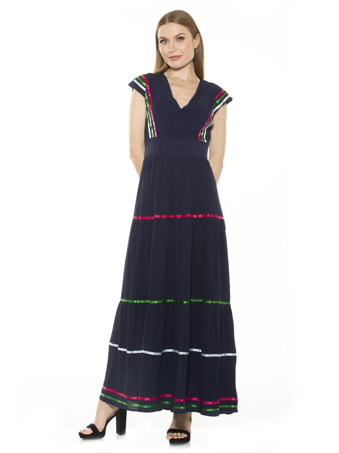 PRODUCT FEATURES Fit - This style fits true to size. V-neck Short sleeves Maxi length tiered skirt Fiber Content 100%Â Rayon Lined - 100% Polyester Machine wash Imported Style D3646