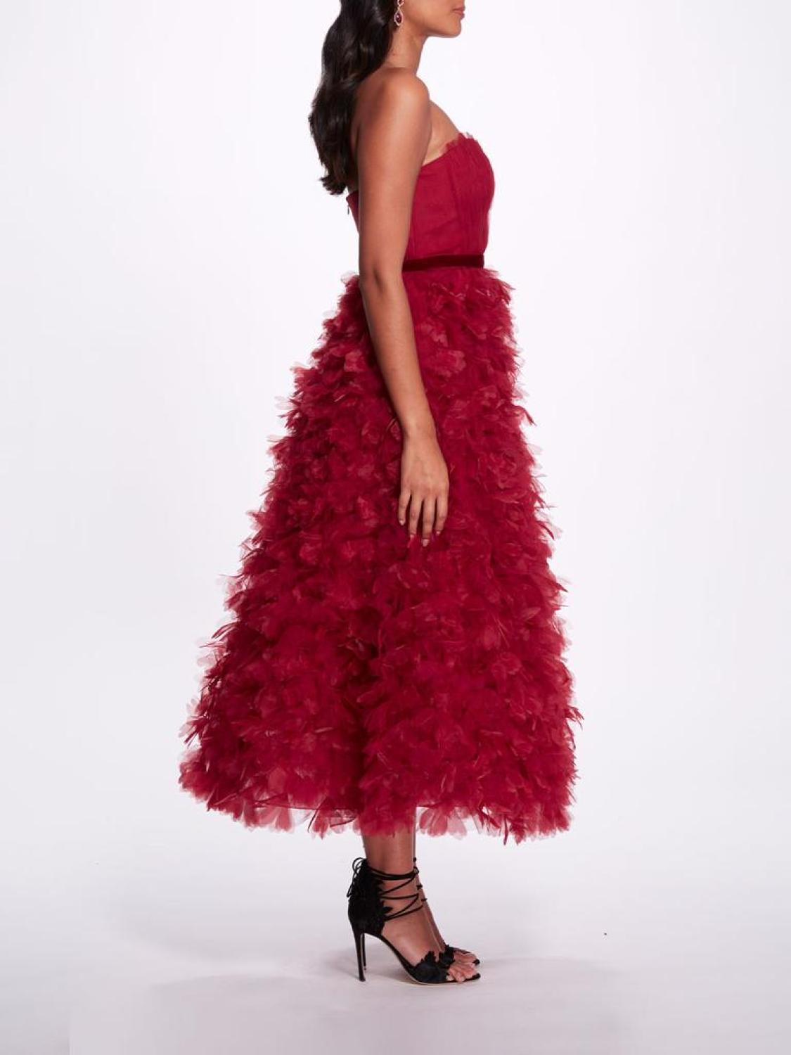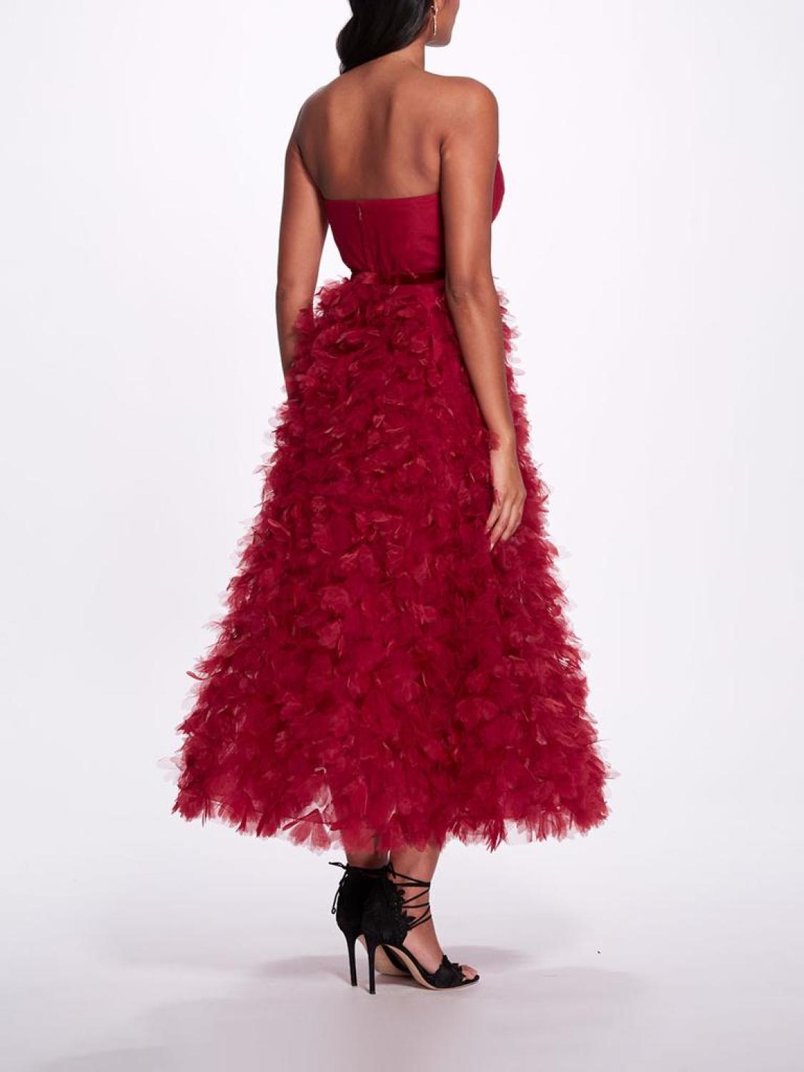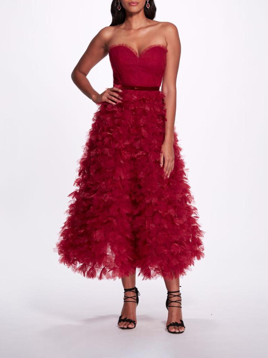 The epitome of charm, this tea-length dress in red features a sweetheart neckline, 3-D floral ruffles, and a velvet belted detail.Model is wearing size US 4.