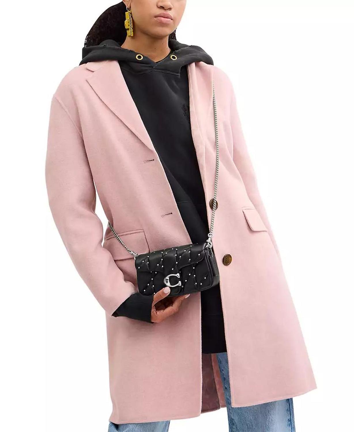 Classic COACH style gets adorned with dazzling rivets with this version of the leather Tabby. Mini-sized bag; 7-1/4"W x 4"H x 1-1/2"D (width is measured across the bottom of handbag); 1 lbs. approx. weight Silhouette is based off 5'9" model Removable wrist strap; 23"L removable crossbody strap Push-lock closure Silver-tone hardware & logo, exterior back slip pocket, interior multifunction pocket & 2 card slots Leather Spot clean Imported