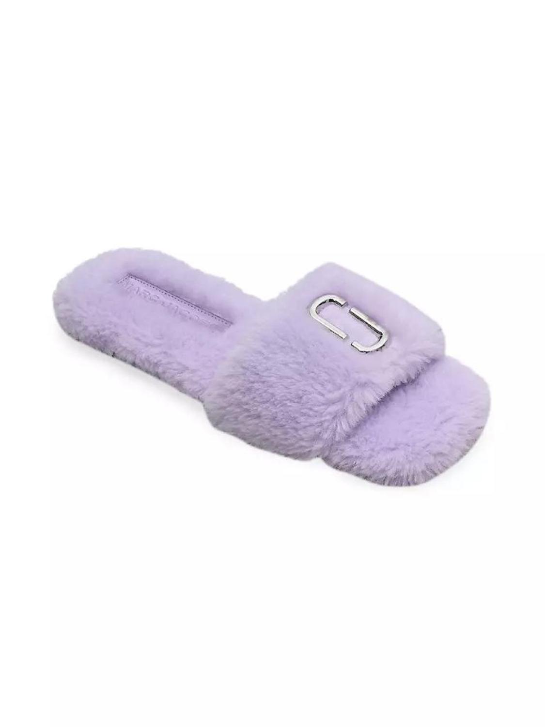 Crafted of fuzzy teddy fabric, these Marc Jacobs sandals are topped with signature J Marc hardware.Open toeSlips onPolyester upperPolyurethane soleFur type: fauxImported